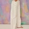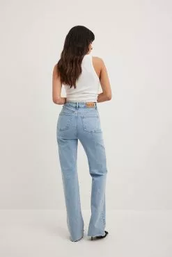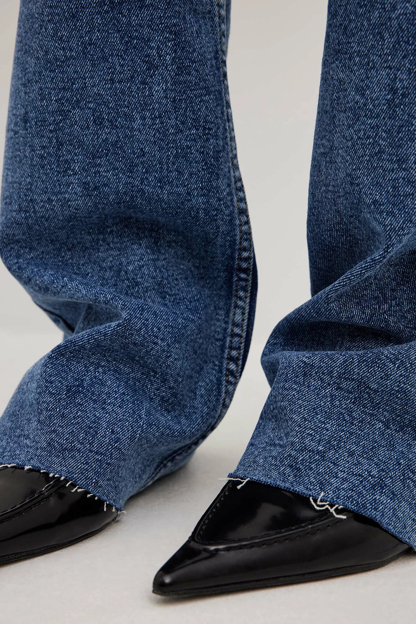 These jeans feature a high waist. They have belt loops and a five-pocket design. These jeans feature a zipper and button closure, boot cut skinny legs and a raw hemline.