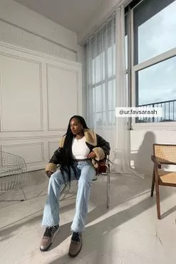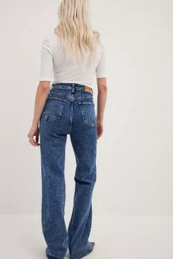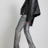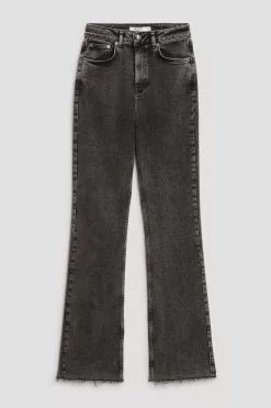 These jeans feature a high waist. They have belt loops and a five-pocket design. These jeans feature a zipper and button closure, boot cut skinny legs and a raw hemline.