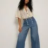 These jeans feature a high waist. They have belt loops and a five-pocket design. These jeans feature a zipper and button closure, boot cut skinny legs and a raw hemline.