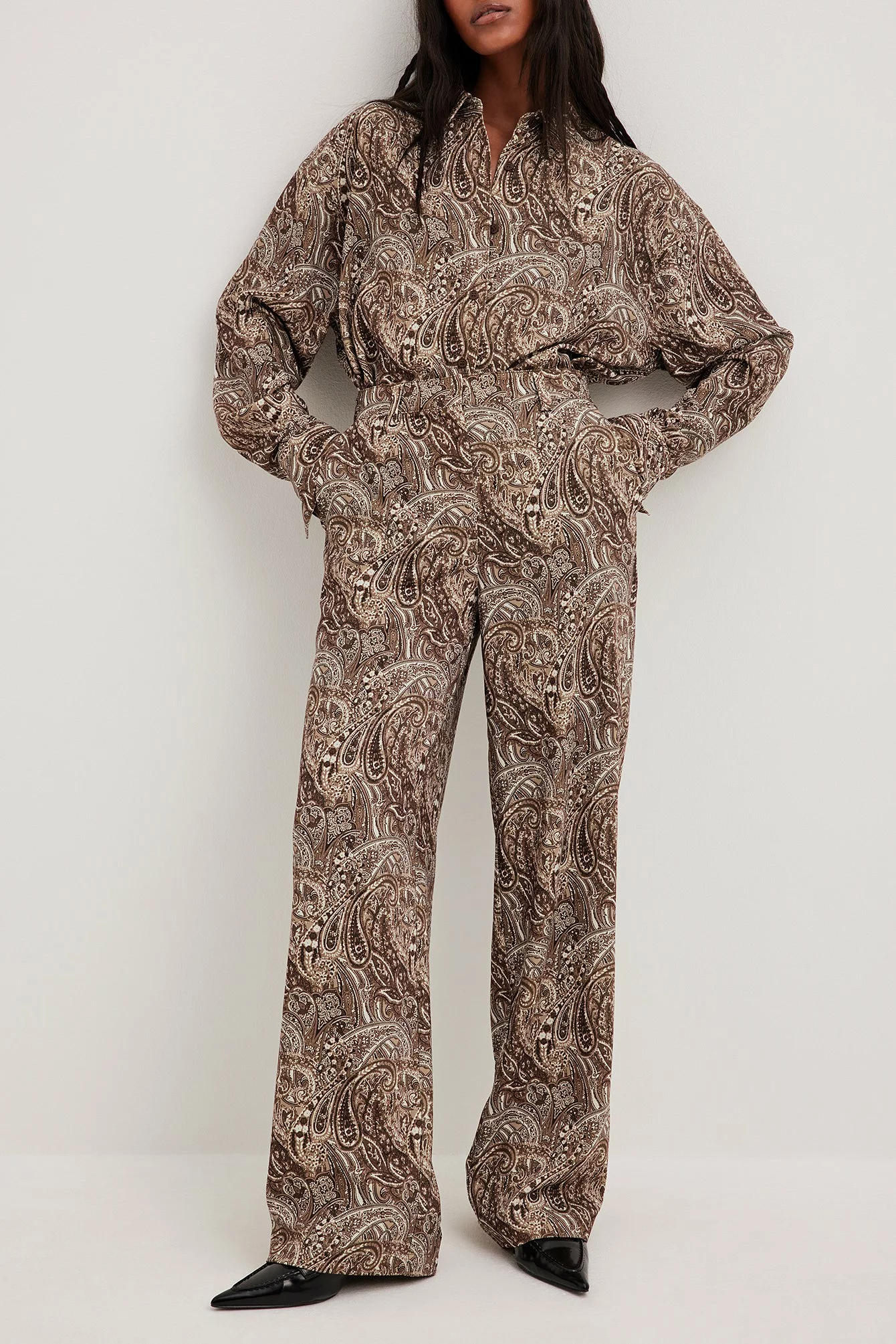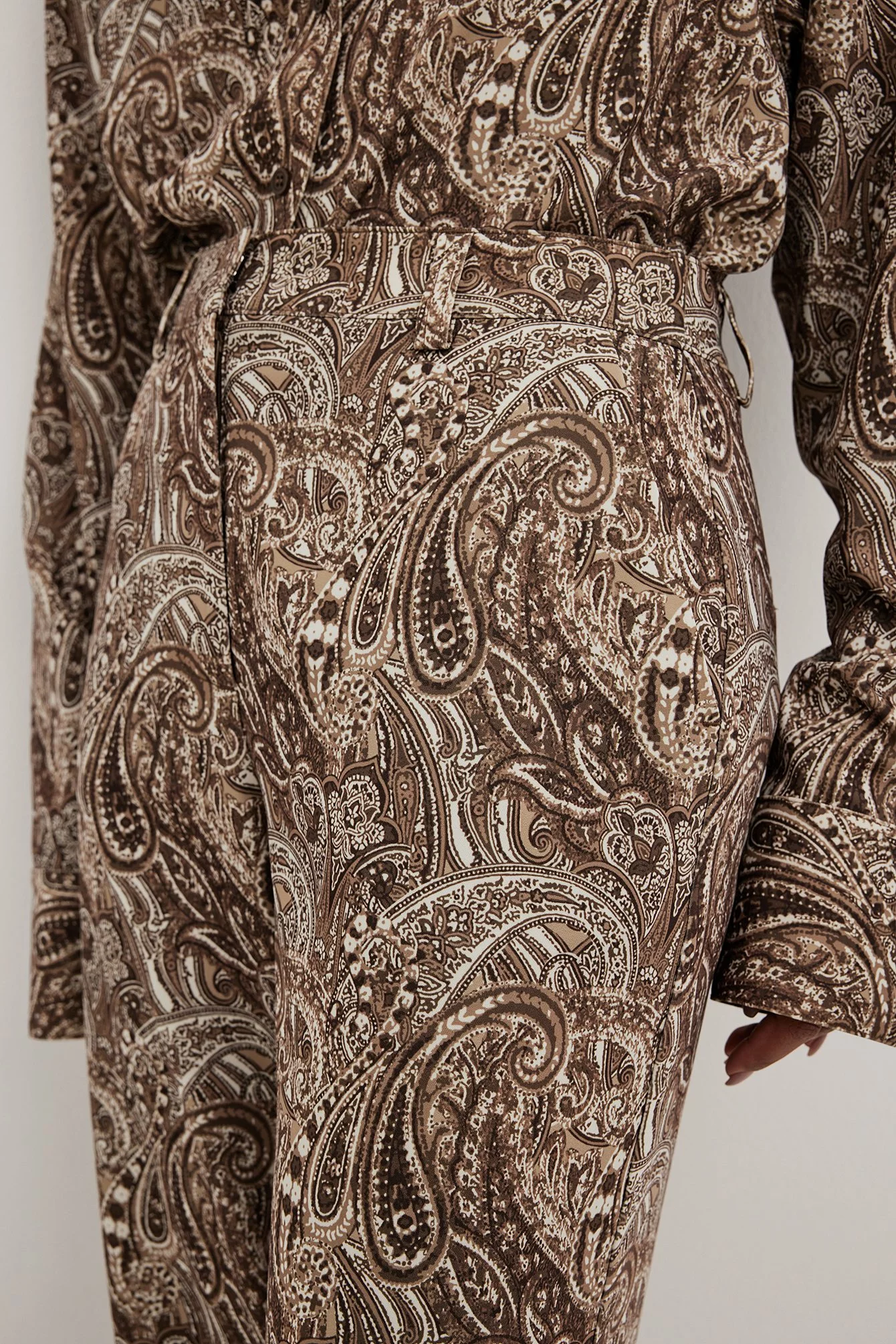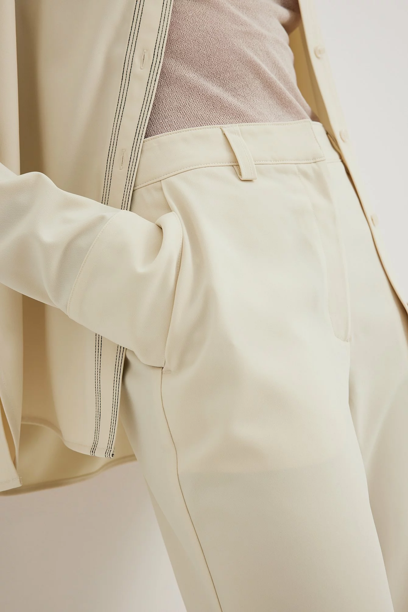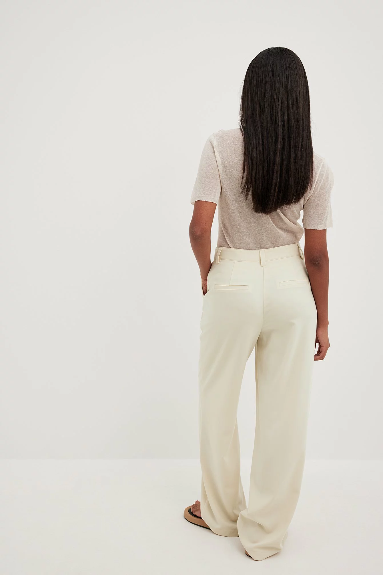 These pants feature a high waist fit. They have a loose fit and a zipper, hook and button closure. These pants feature belt loops, back mock pockets and side slant pockets. Inseam length in size 36: 80 cm / 31.49 in.