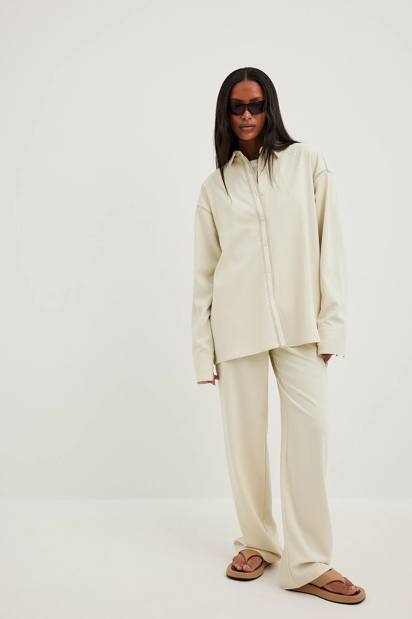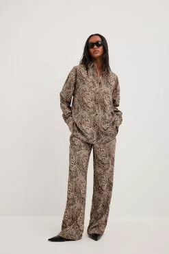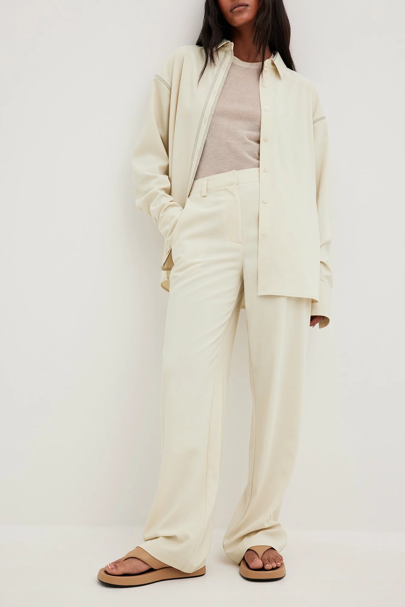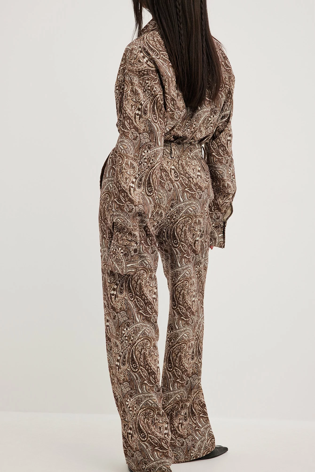 These pants feature a high waist fit. They have a loose fit and a zipper, hook and button closure. These pants feature belt loops, back mock pockets and side slant pockets. Inseam length in size 36: 80 cm / 31.49 in.