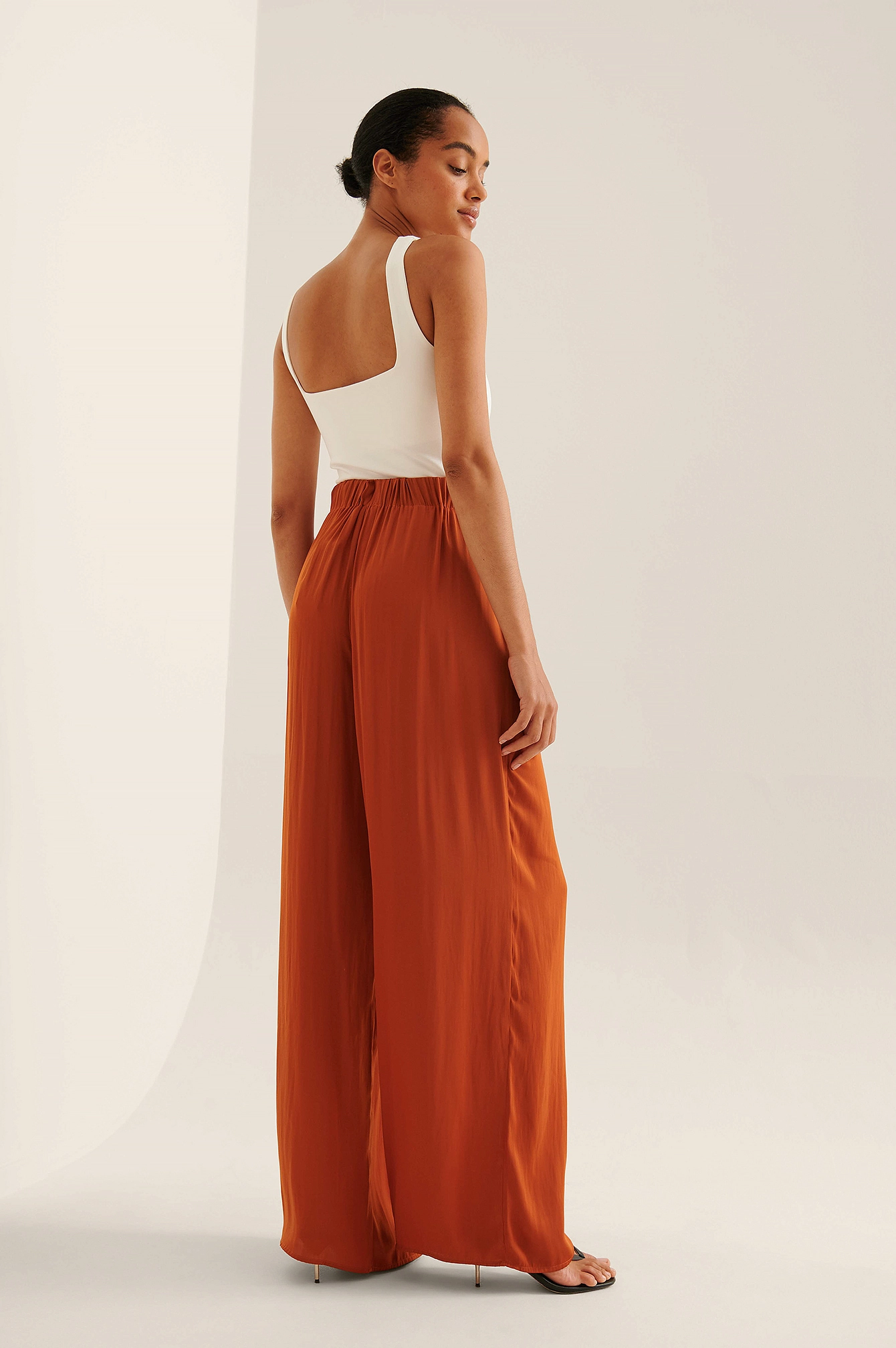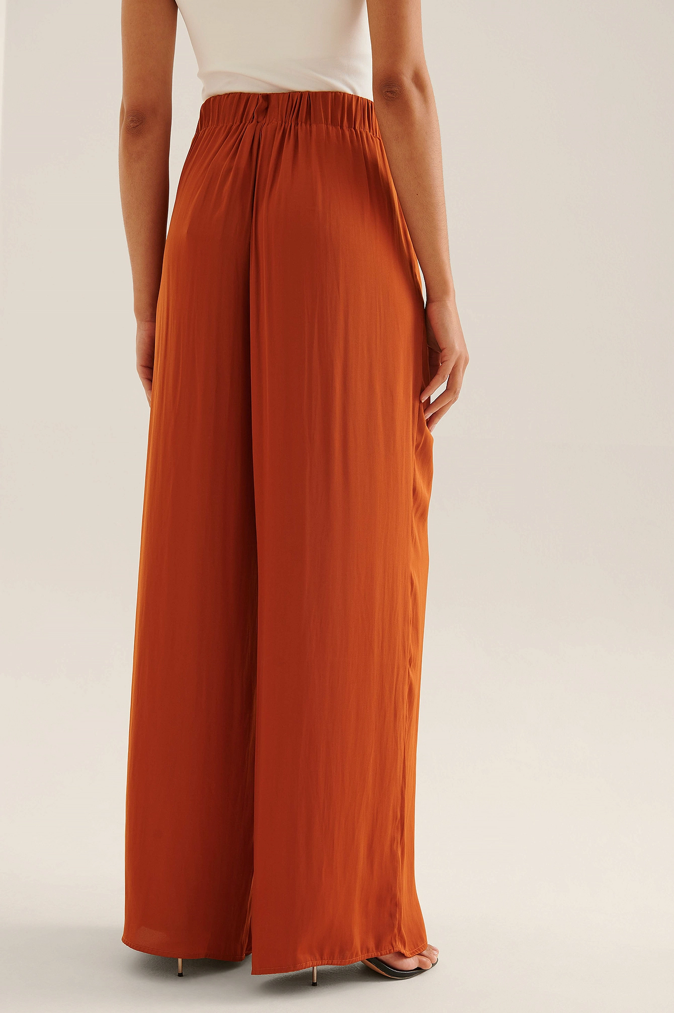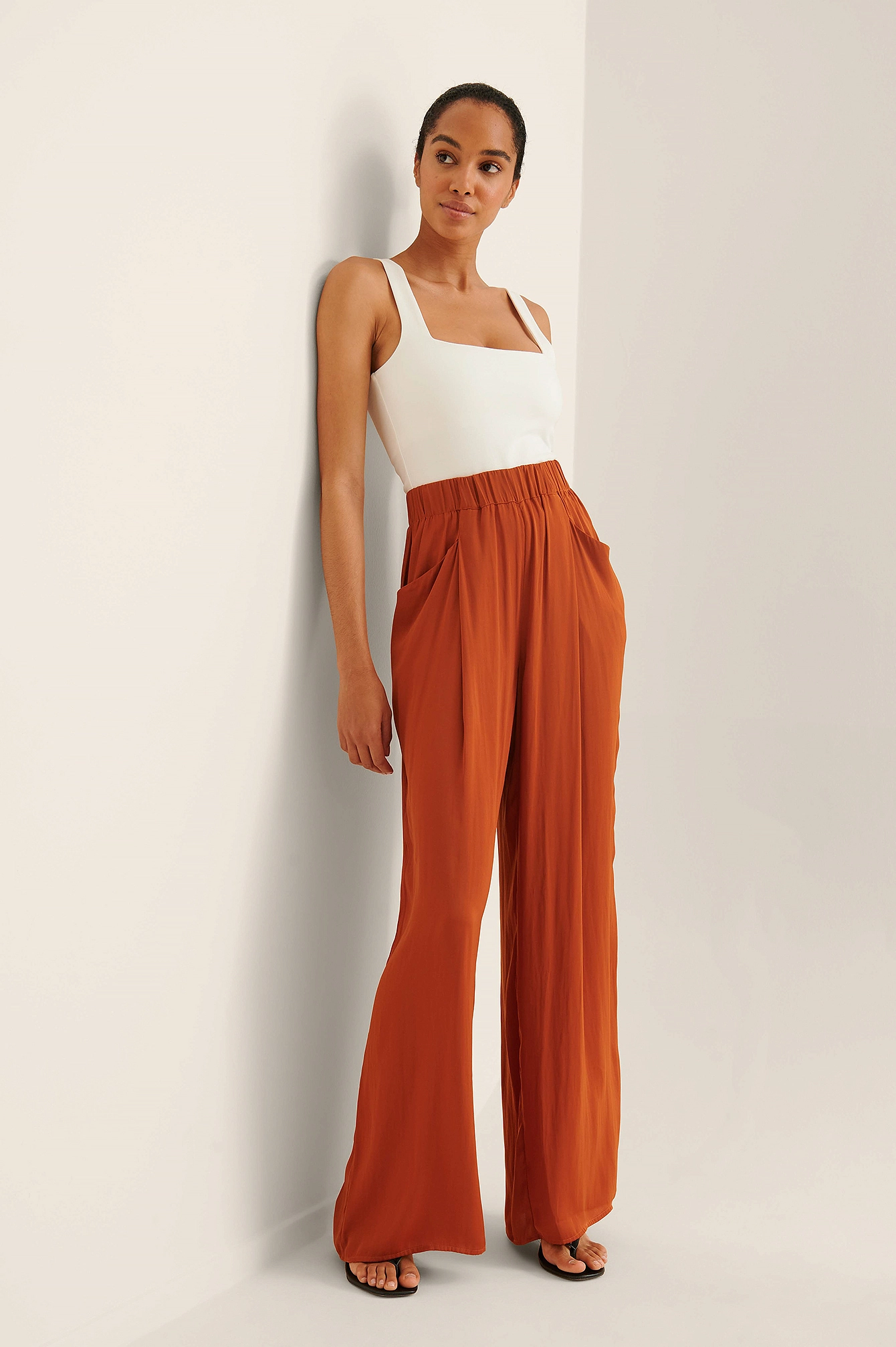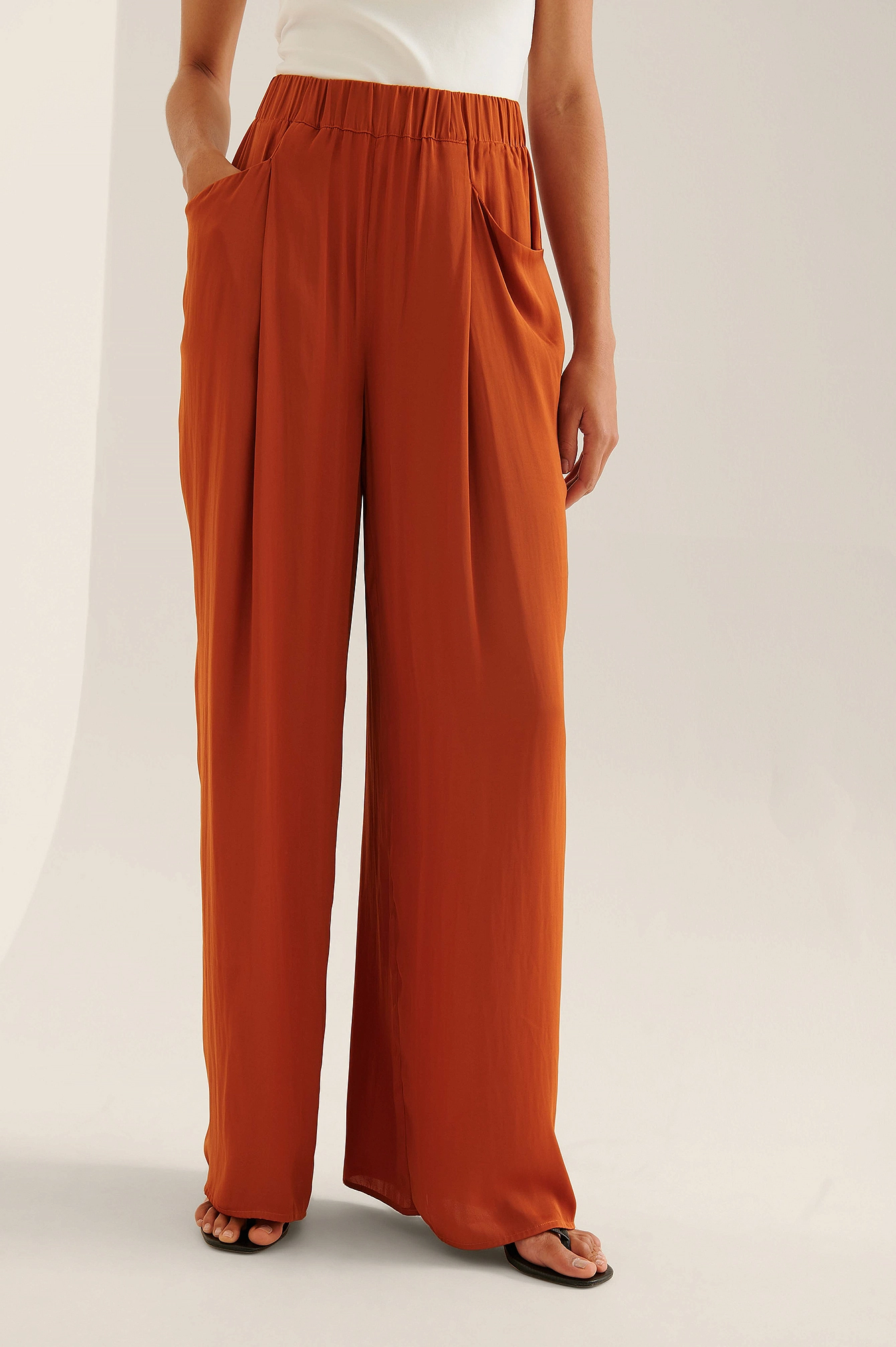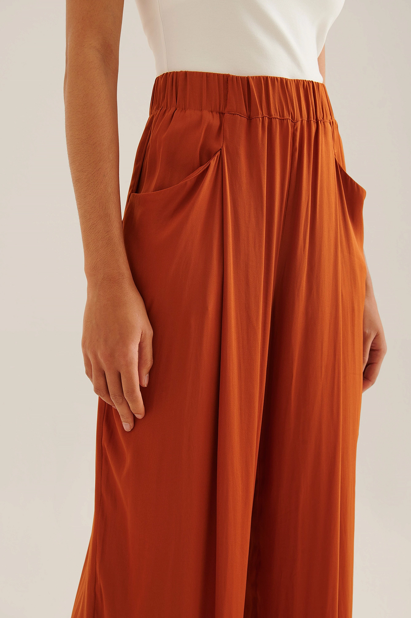 These pants feature an elasticized high waist, two front pockets, wide legs, a soft touch and a flowy fit.