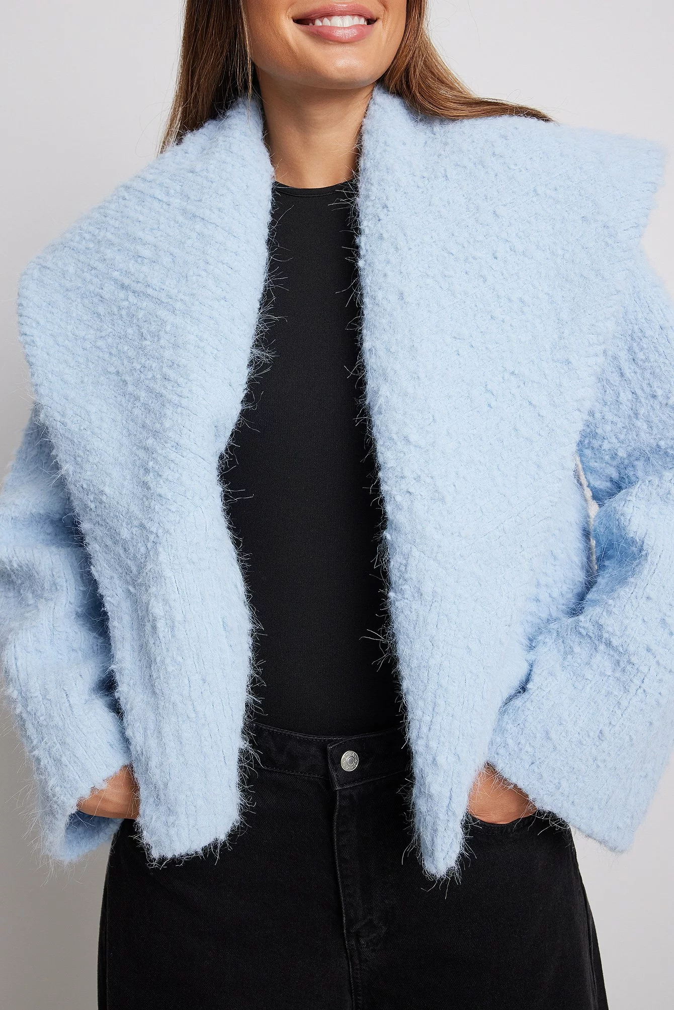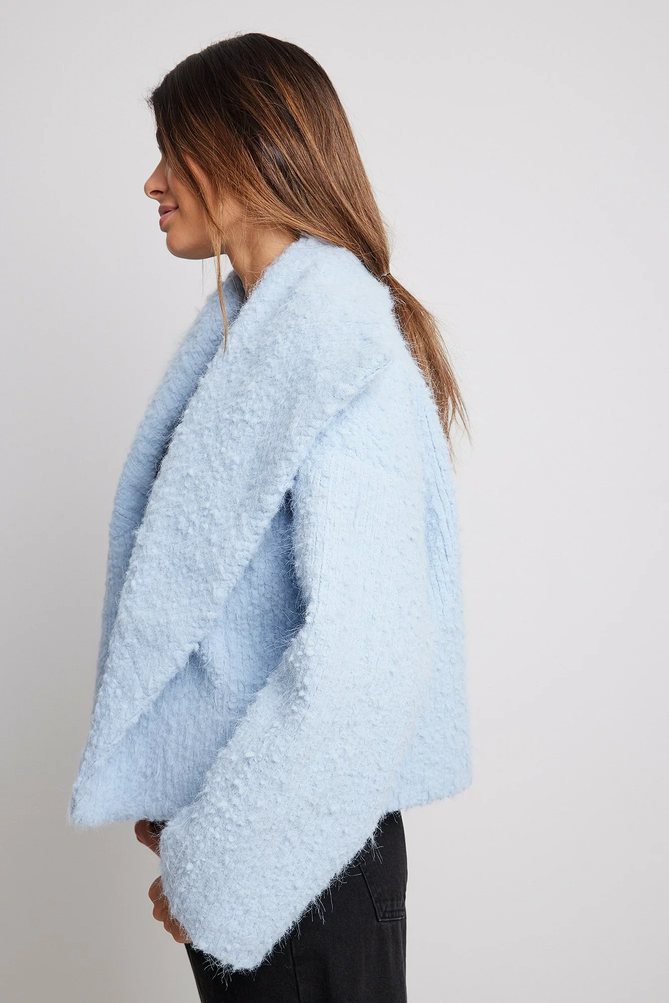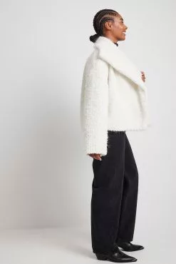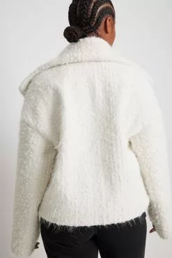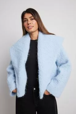 This jacket features a big collar, side pockets, a lining, a fuzzy material, a button fly closure and without front closure.