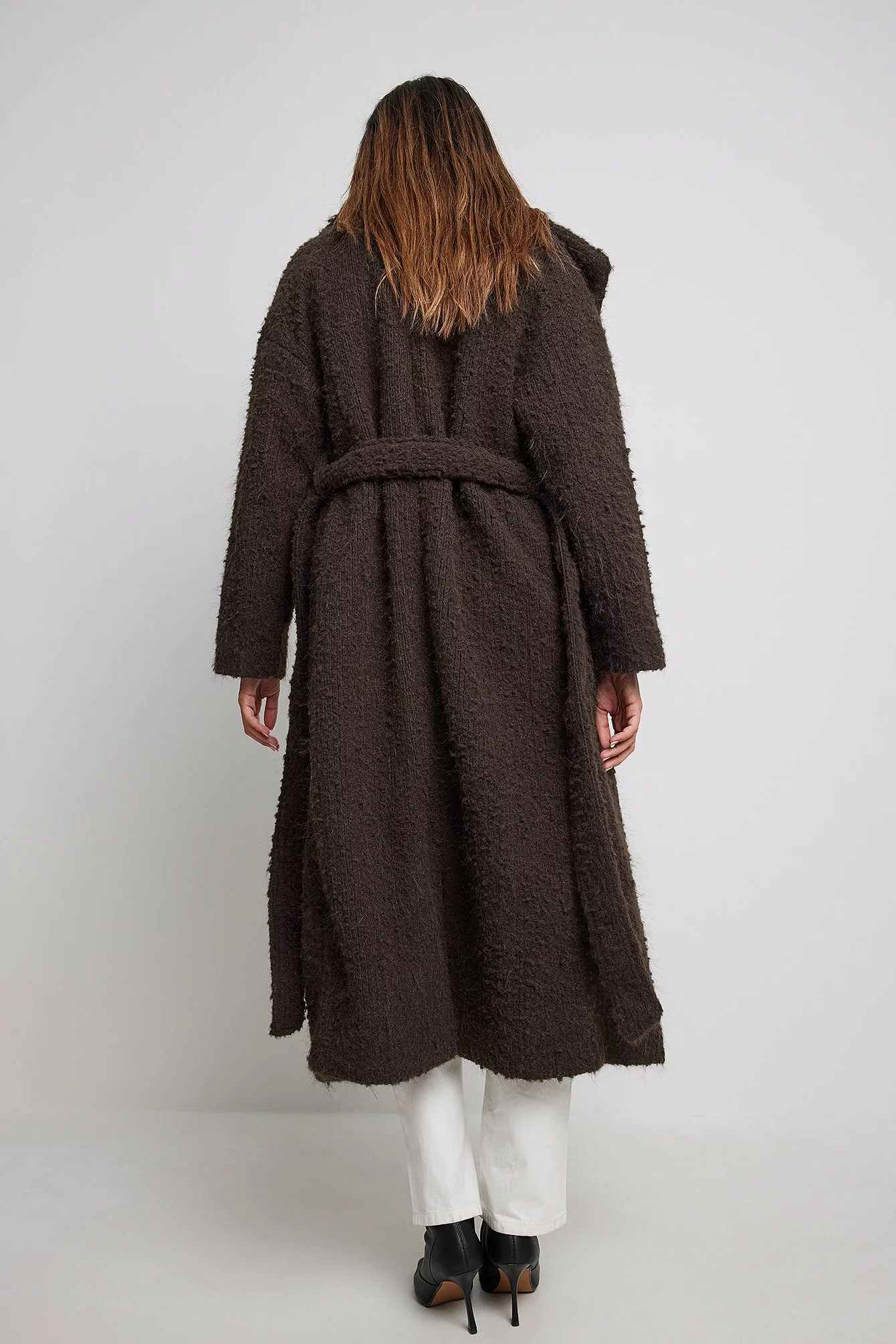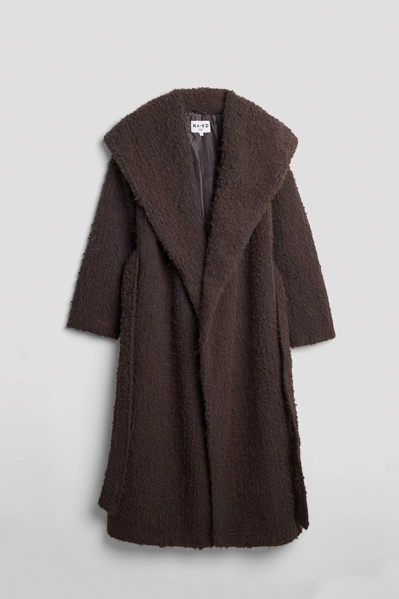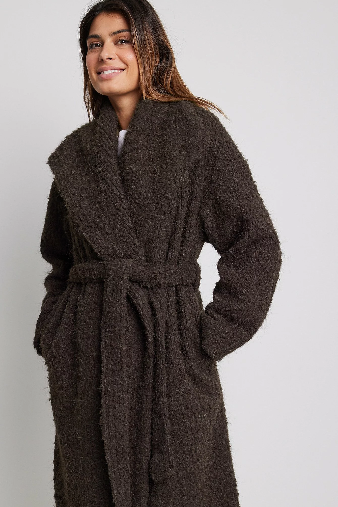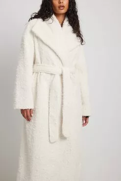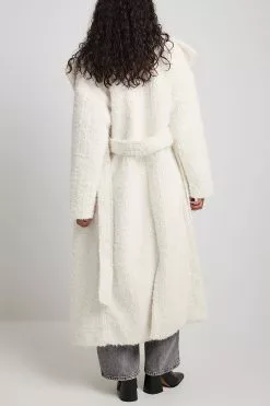 This coat features a big collar, a belt tie, side pockets, a back slit detail, a lining and a fuzzy material.