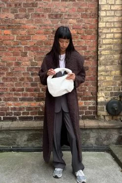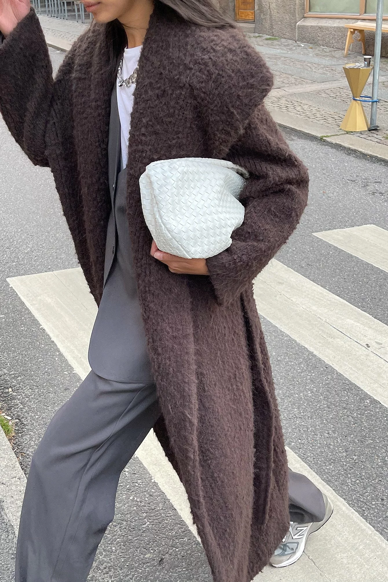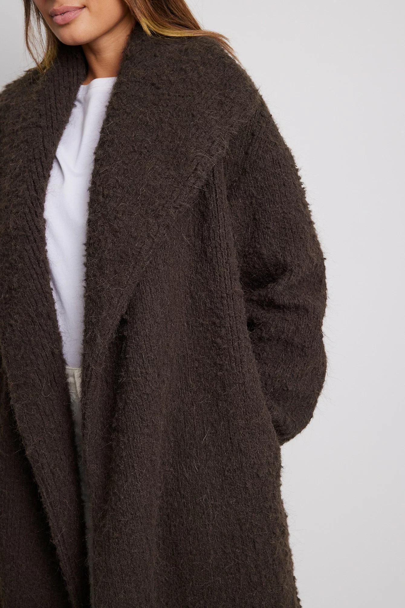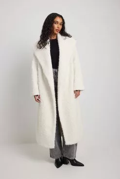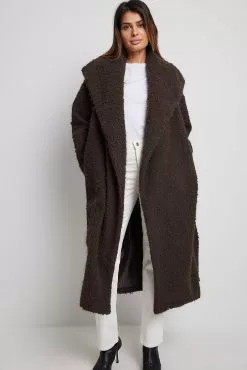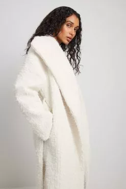 This coat features a big collar, a belt tie, side pockets, a back slit detail, a lining and a fuzzy material.