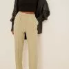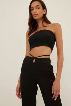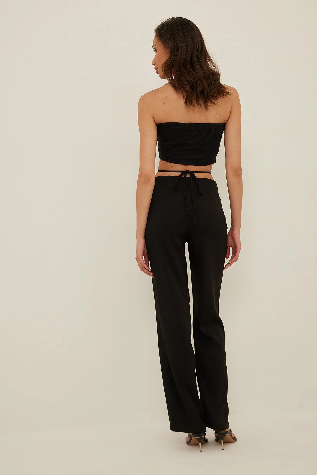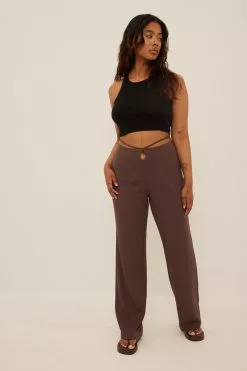 These suit pants feature a high waist with self-tie bands and a hole detail in front, a zipper and hook closure on the side and straight legs.