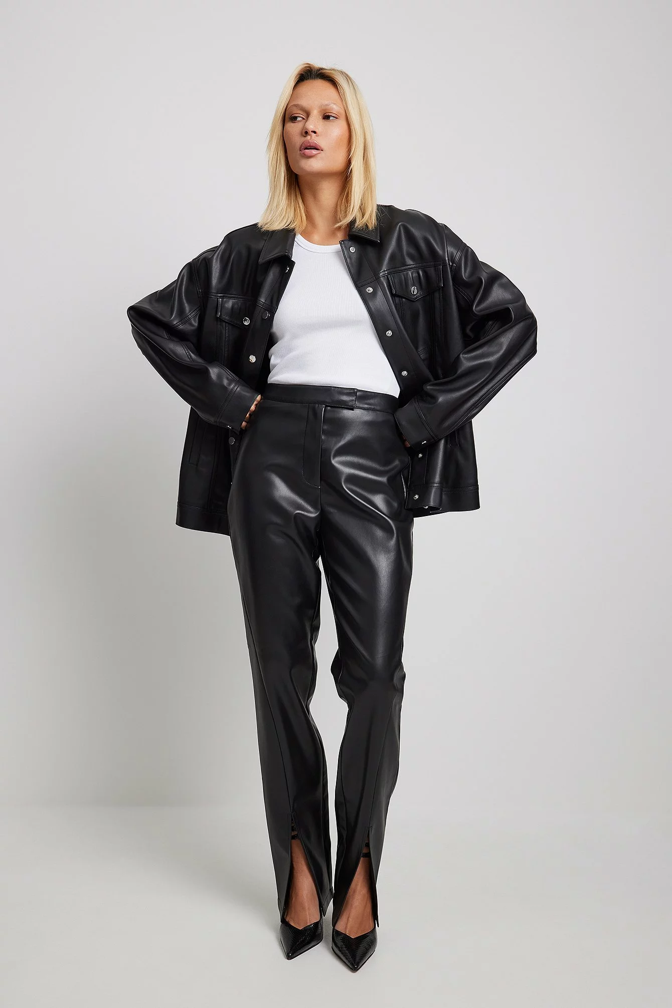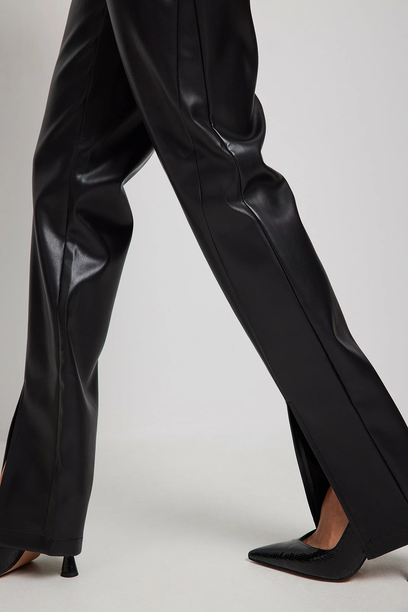 These trousers are made of PU and feature a high waist with a zipper, hook and button closure, two back mock pockets and seam details on the front with a slit.