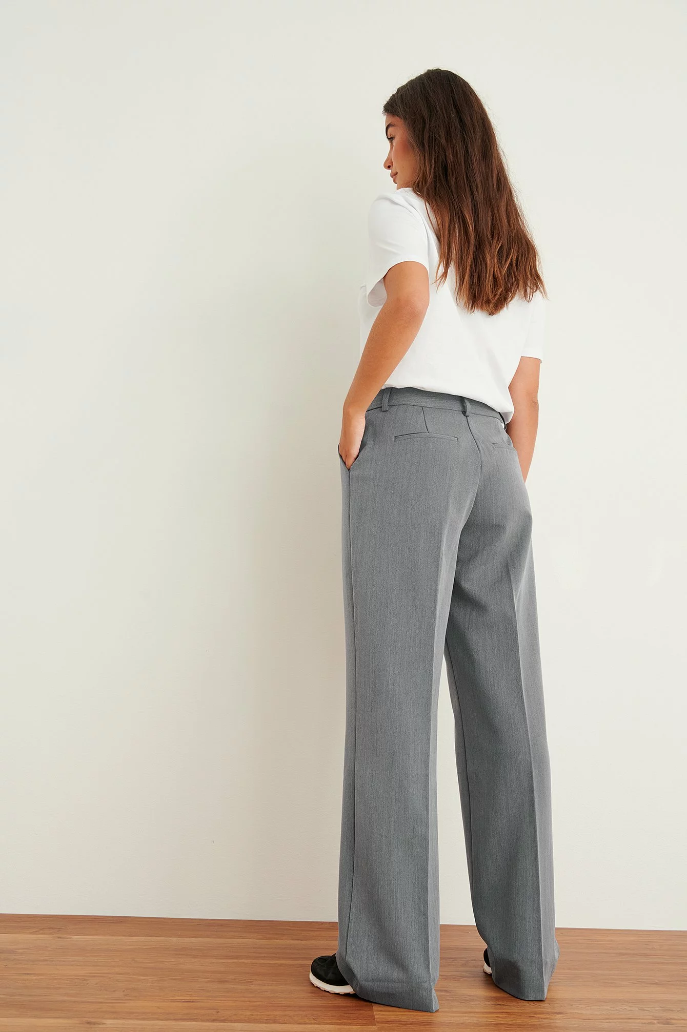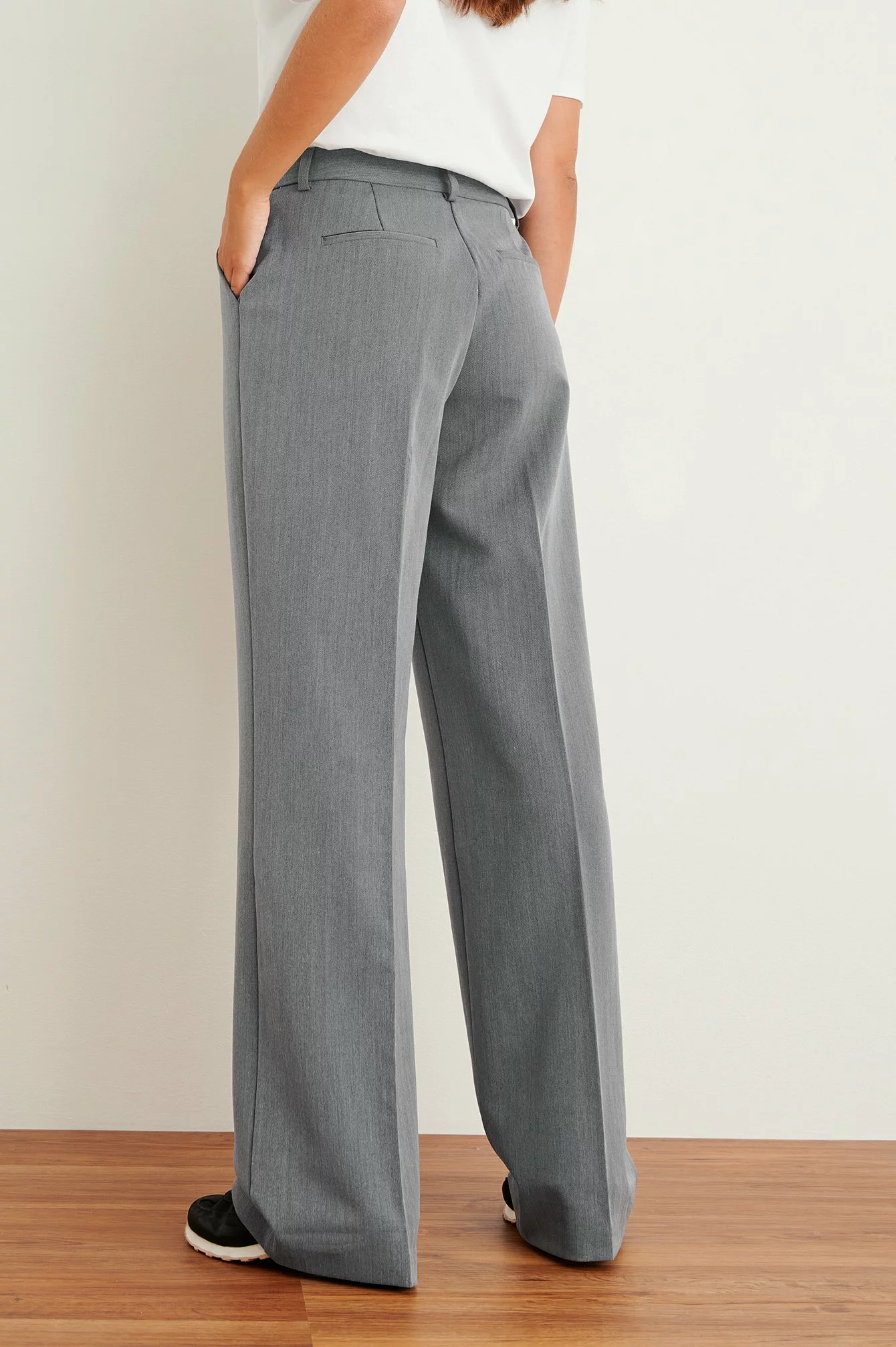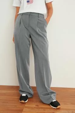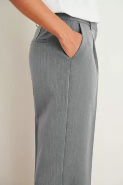 These suit pants feature a low waist, a pleated design, side pockets at the front and back mock pockets.
