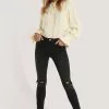 These jeans feature a high rise waist, a five-pocket design, side slits at the bottom hem, a straight fit and a zip and button closure.