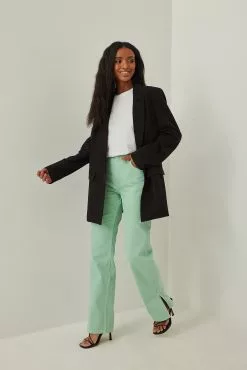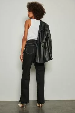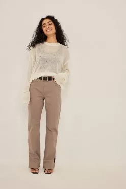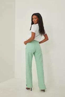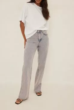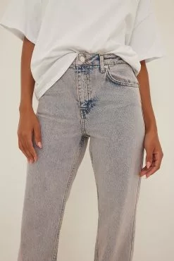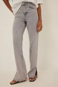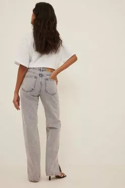 These jeans feature a high rise waist, a five-pocket design, side slits at the bottom hem, a straight fit and a zip and button closure.