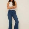 These jeans feature a high rise waist, a five-pocket design, side slits at the bottom hem, a straight fit and a zip and button closure.