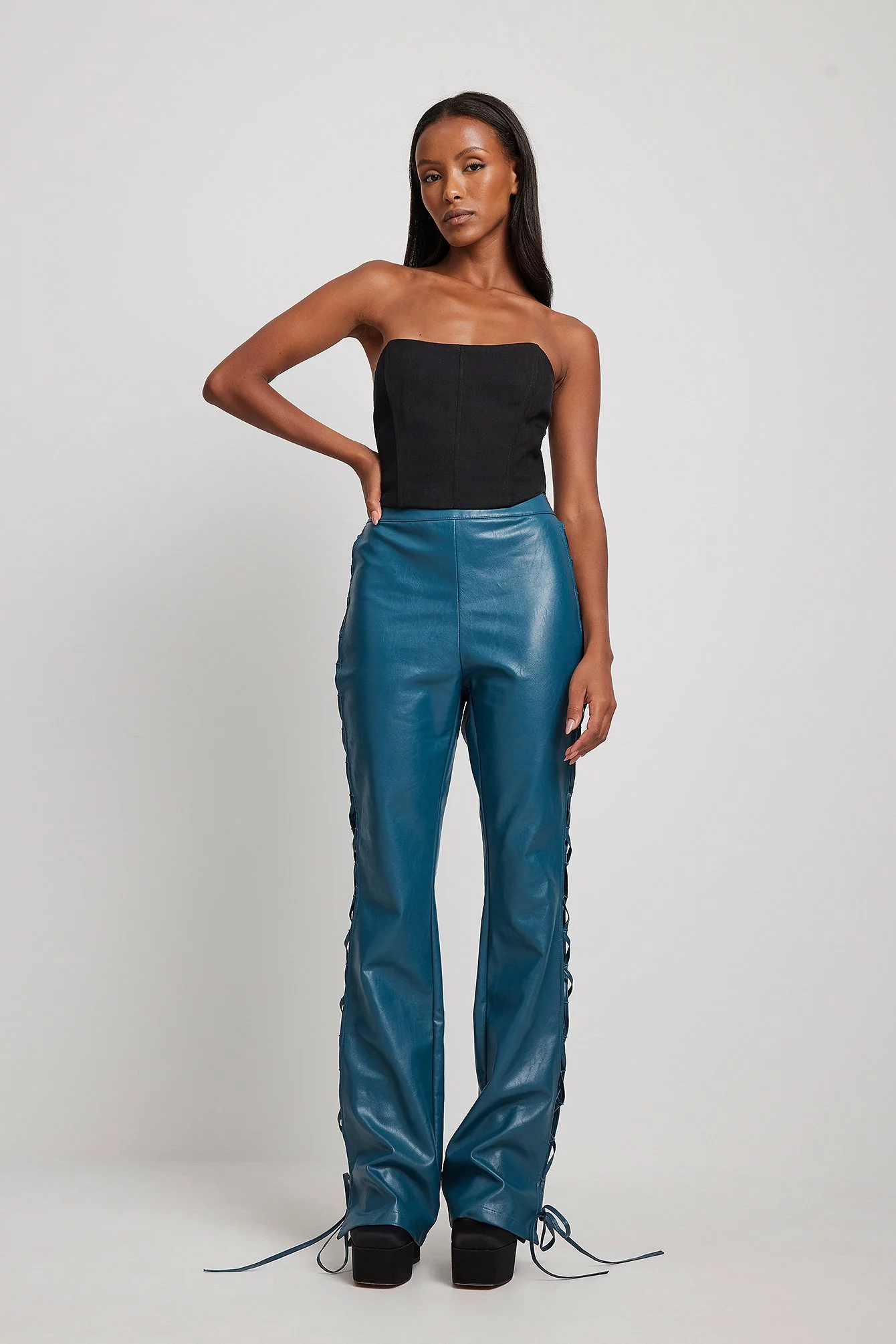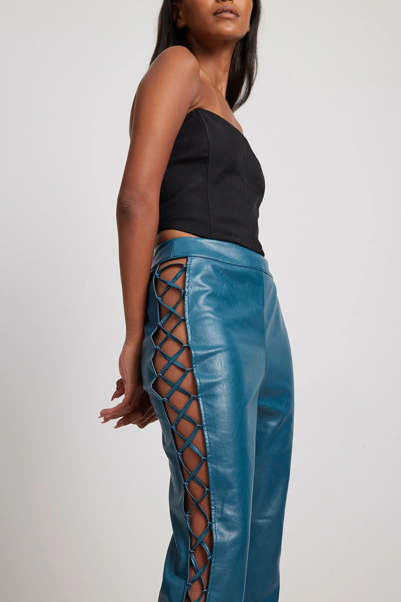 These pants feature a faux leather, a lace up design along the side, a straight leg and a zipper closure at the back.