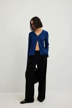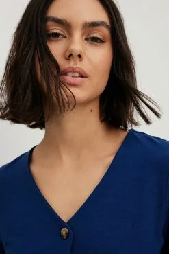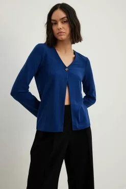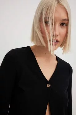 This top features a v neckline. It has a soft touch and long sleeves. This top features a button closure at the front.