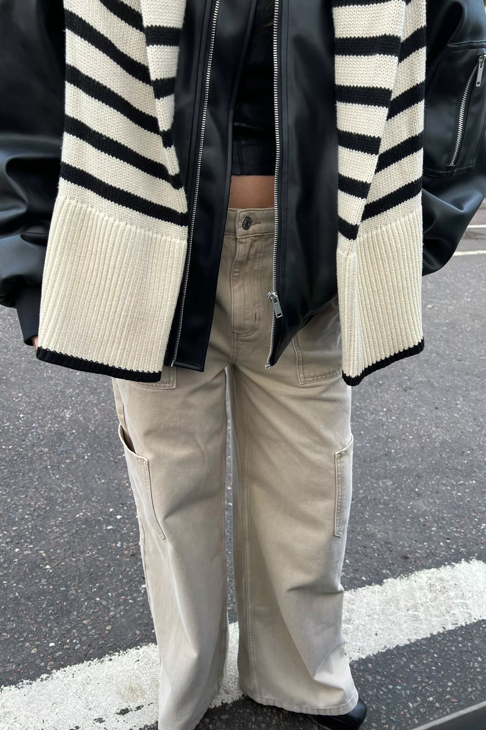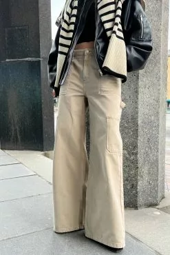 These pants feature side slanting pockets, a belt loop, a zipper with a button on the front, one open pocket on the sides and a wide leg design.