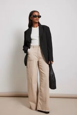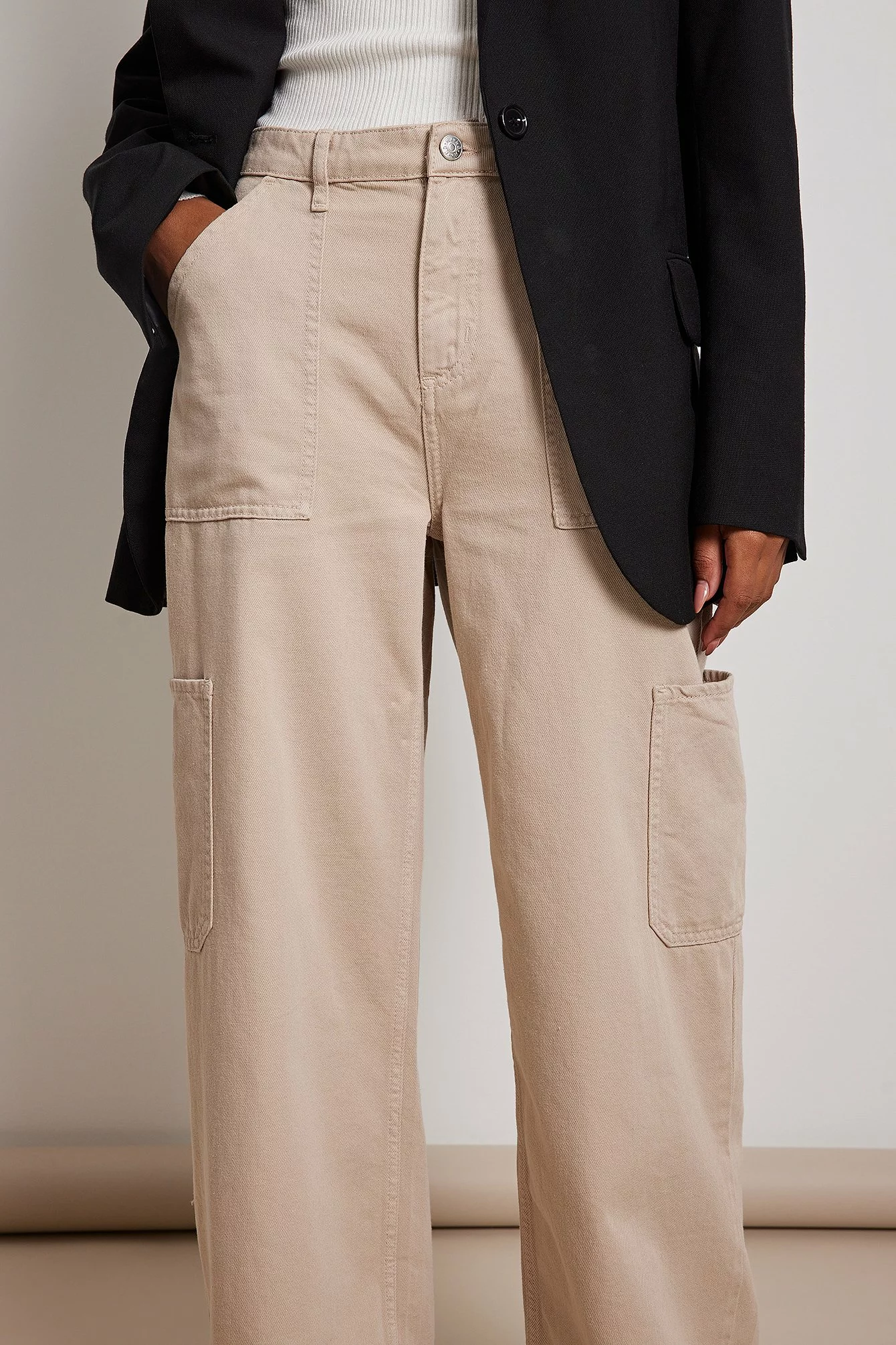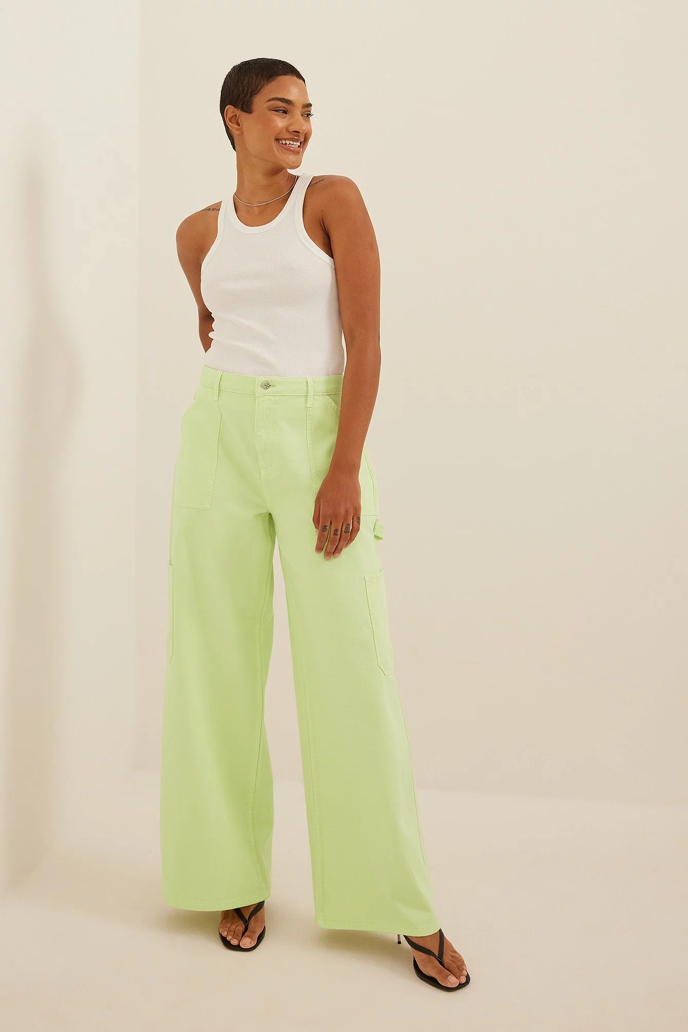 These jeans feature a cargo design, a zipper and button closure, a high waist and a wide leg.