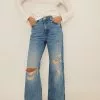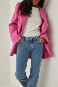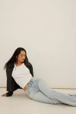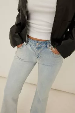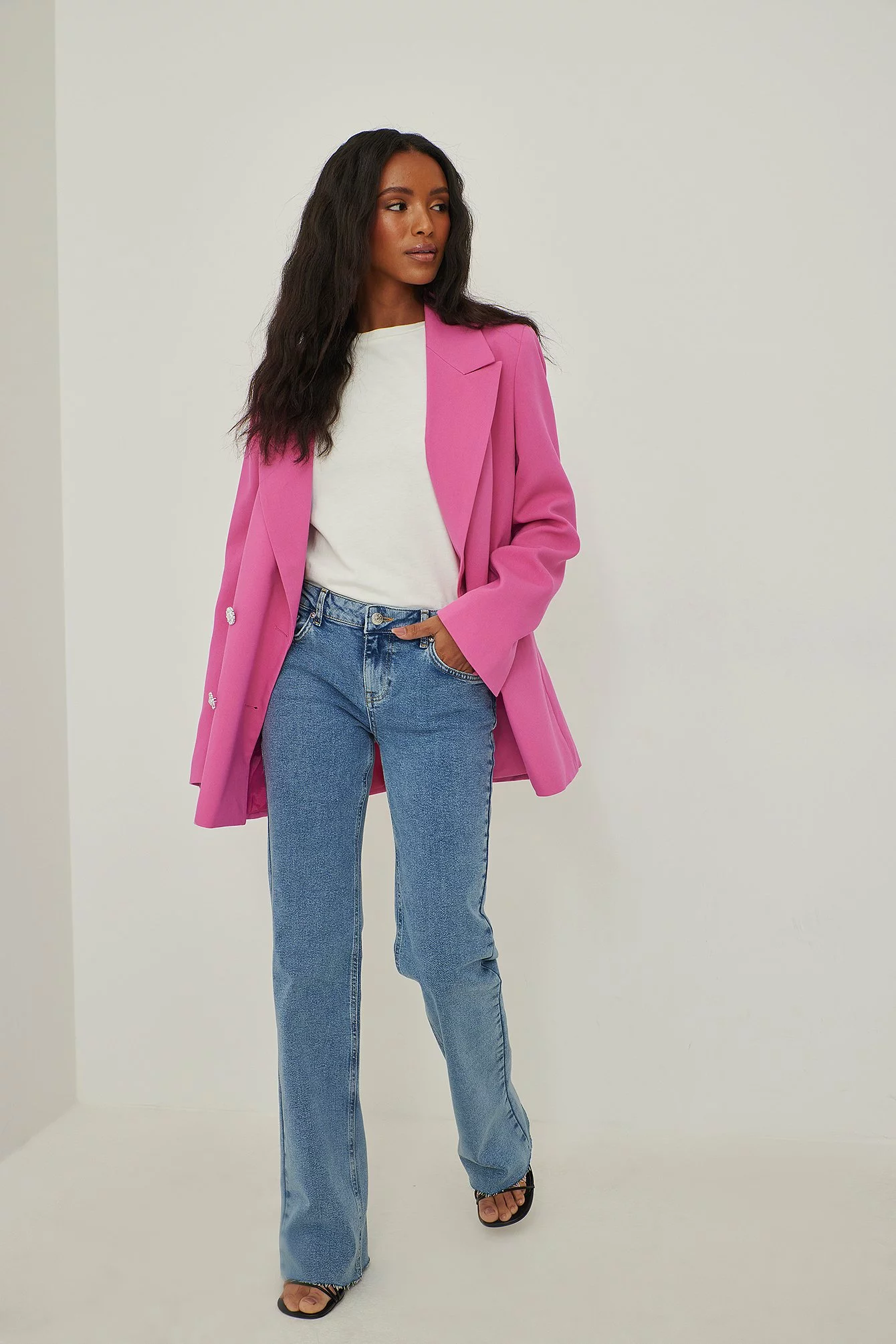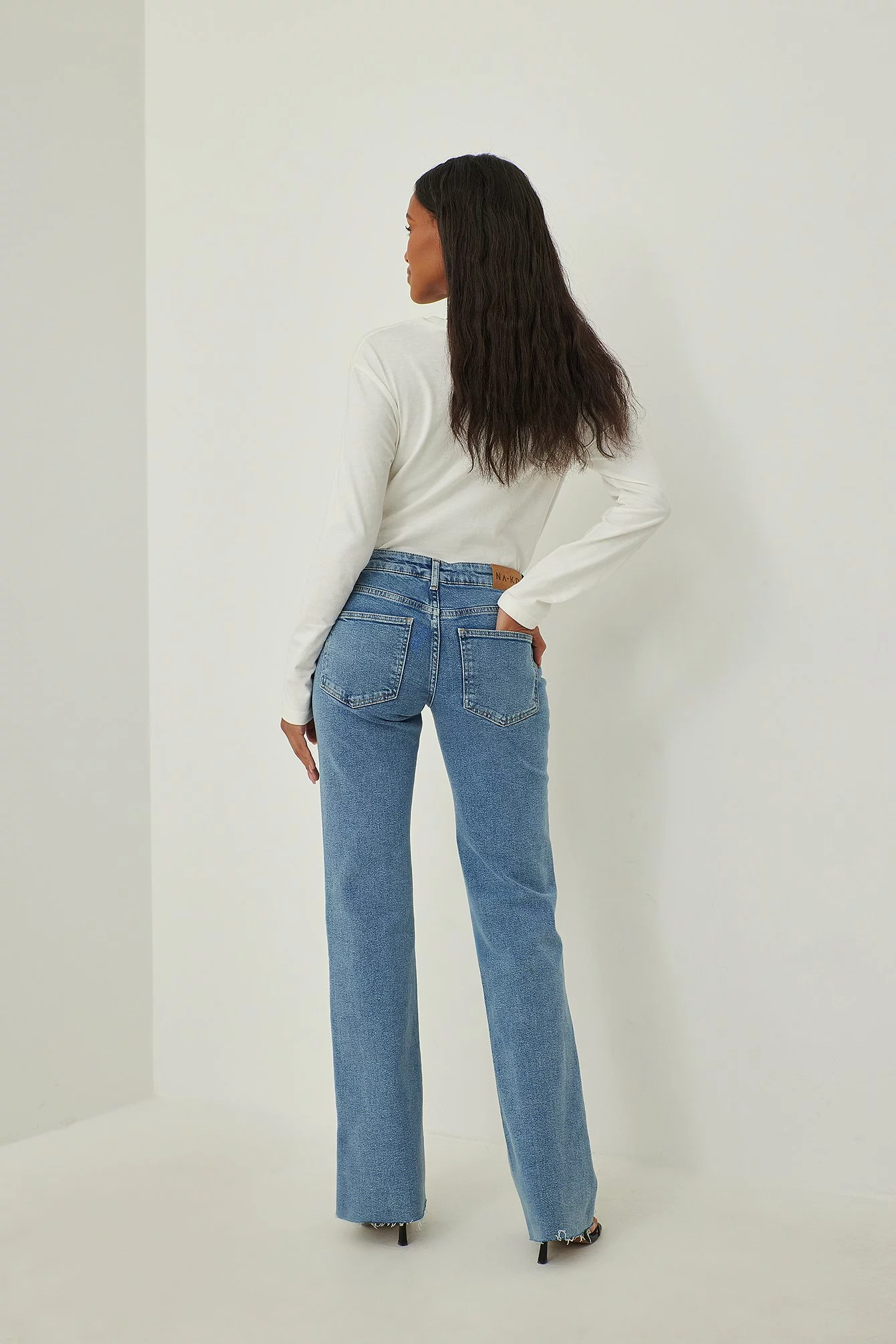These jeans feature a low waist with a five-pocket design, a straight fit and a raw cut at the bottom.
