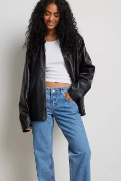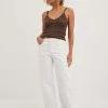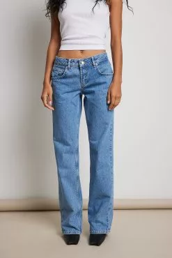 These jeans feature a low waist with belt loops, a zip and button closure, a five-pocket design and a straight leg.
