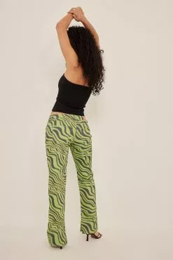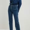 These 5-pocket jeans feature a low waist, a zipper and button closure, slit details on the ankles and straight legs.