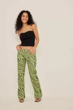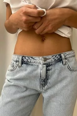 These 5-pocket jeans feature a low waist, a zipper and button closure, slit details on the ankles and straight legs.