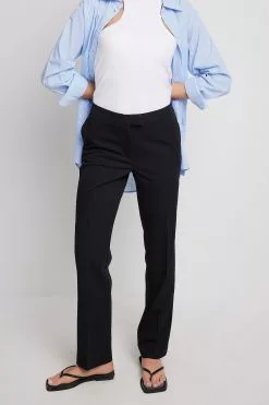 These suit pants feature a low waist with a zipper, hook and button closure. They have 2 front pockets and 2 mock pockets at the back. These suit pants feature gently tapered legs. Inseam length in size 36: 80 cm / 31.49 in.