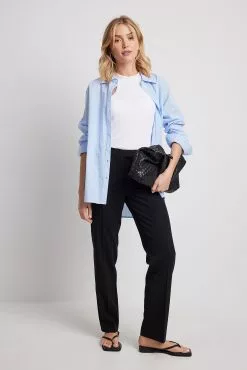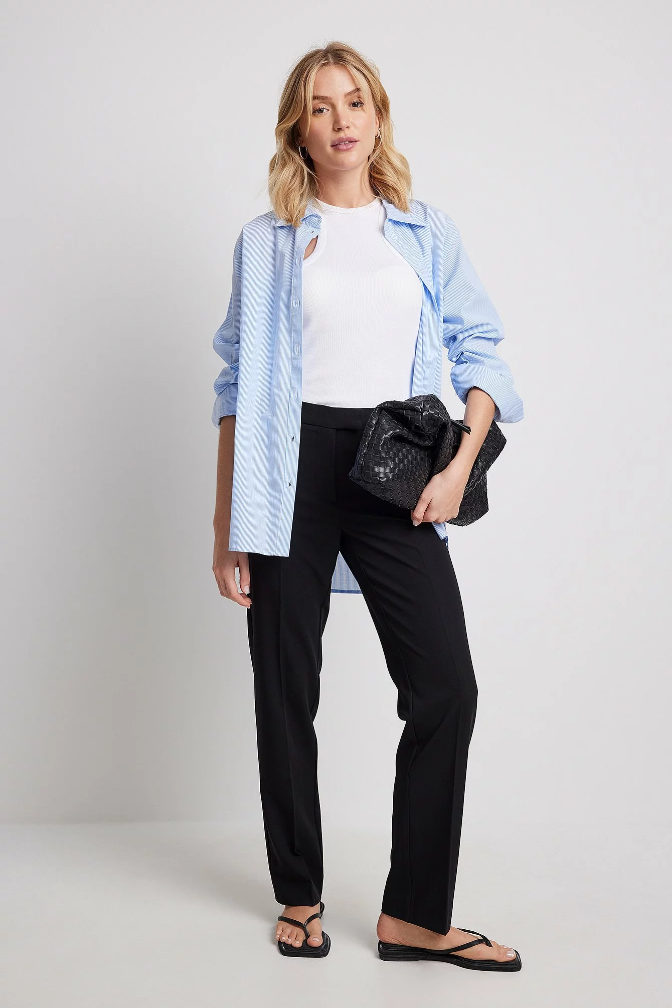 These suit pants feature a low waist with a zipper, hook and button closure. They have 2 front pockets and 2 mock pockets at the back. These suit pants feature gently tapered legs. Inseam length in size 36: 80 cm / 31.49 in.