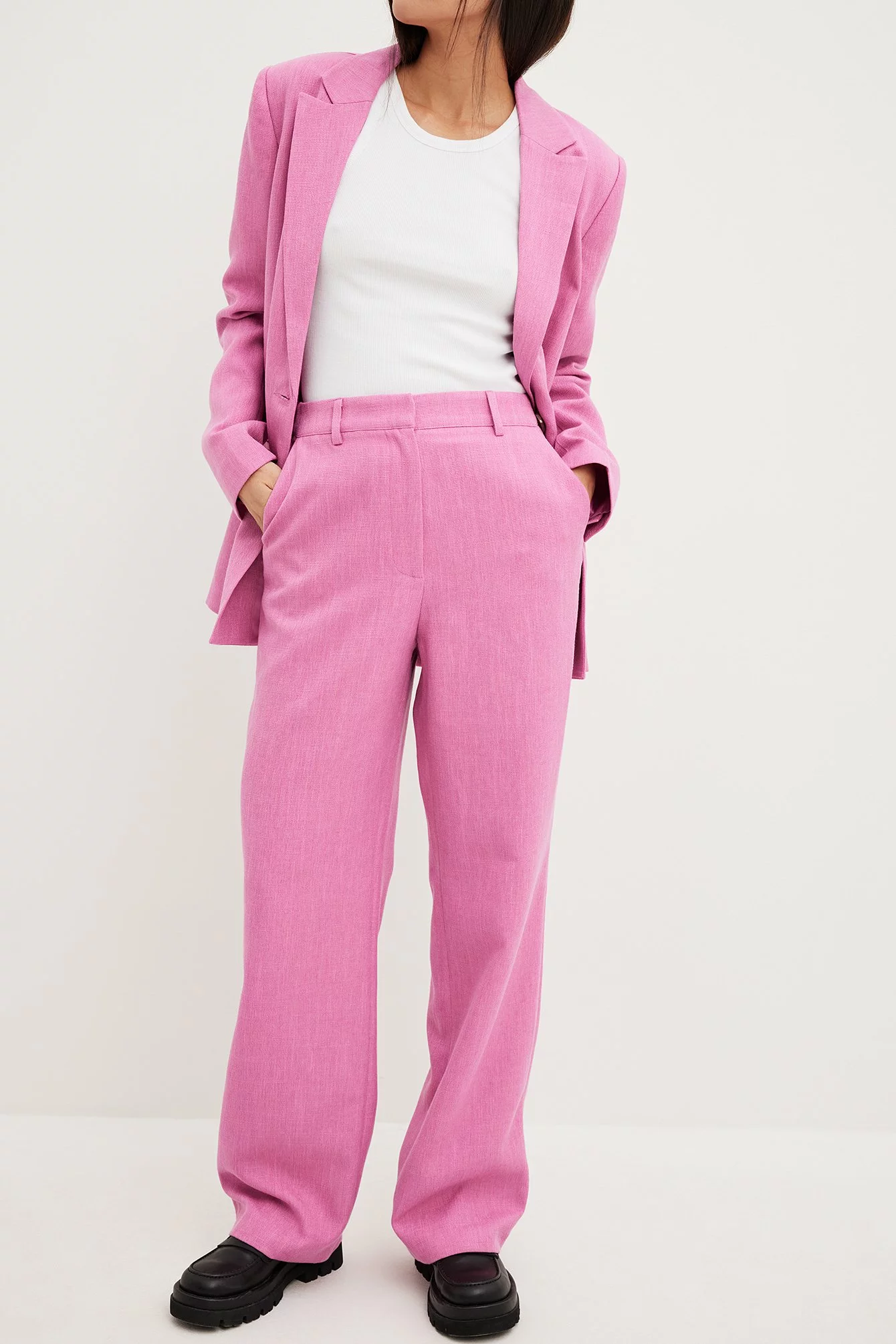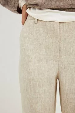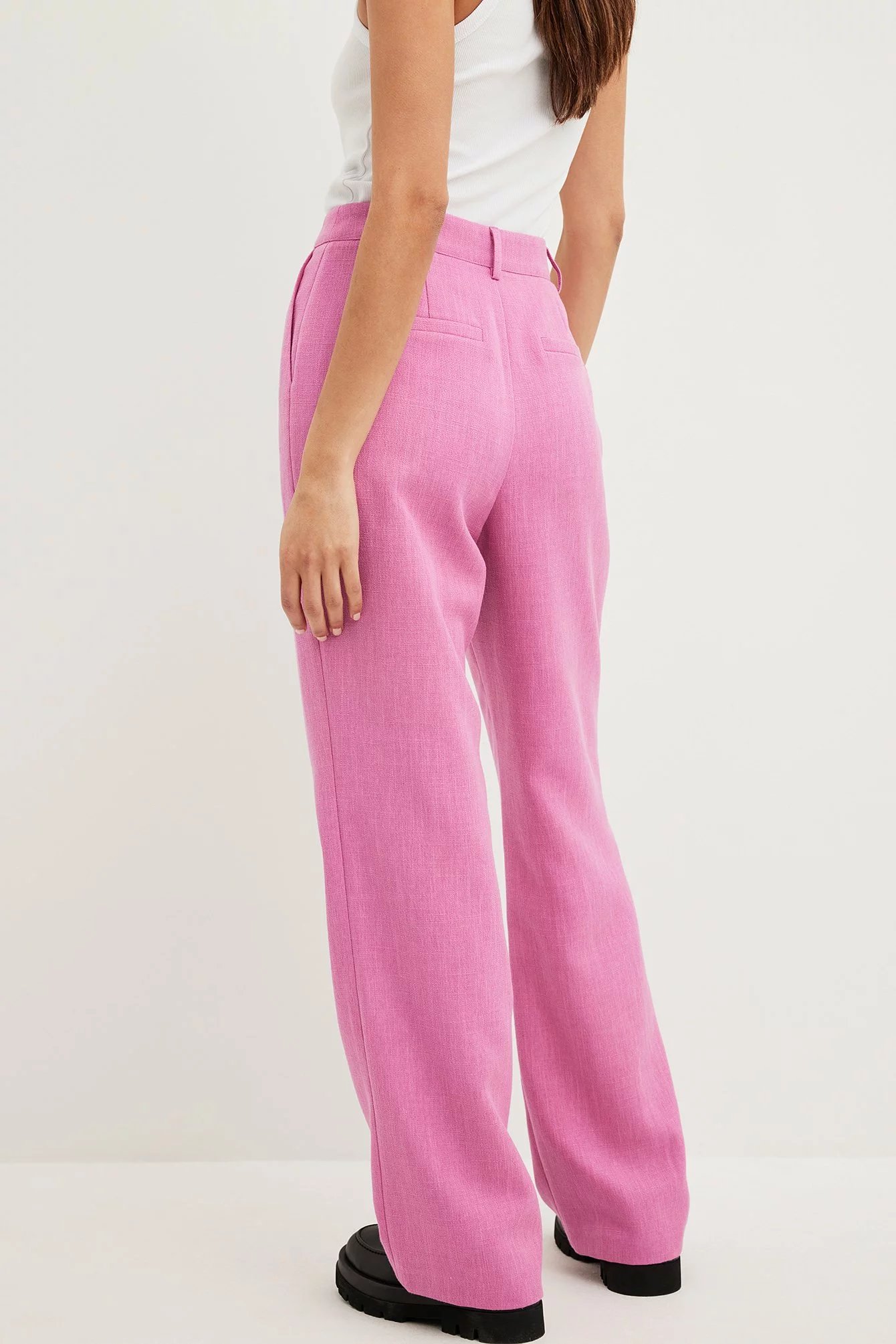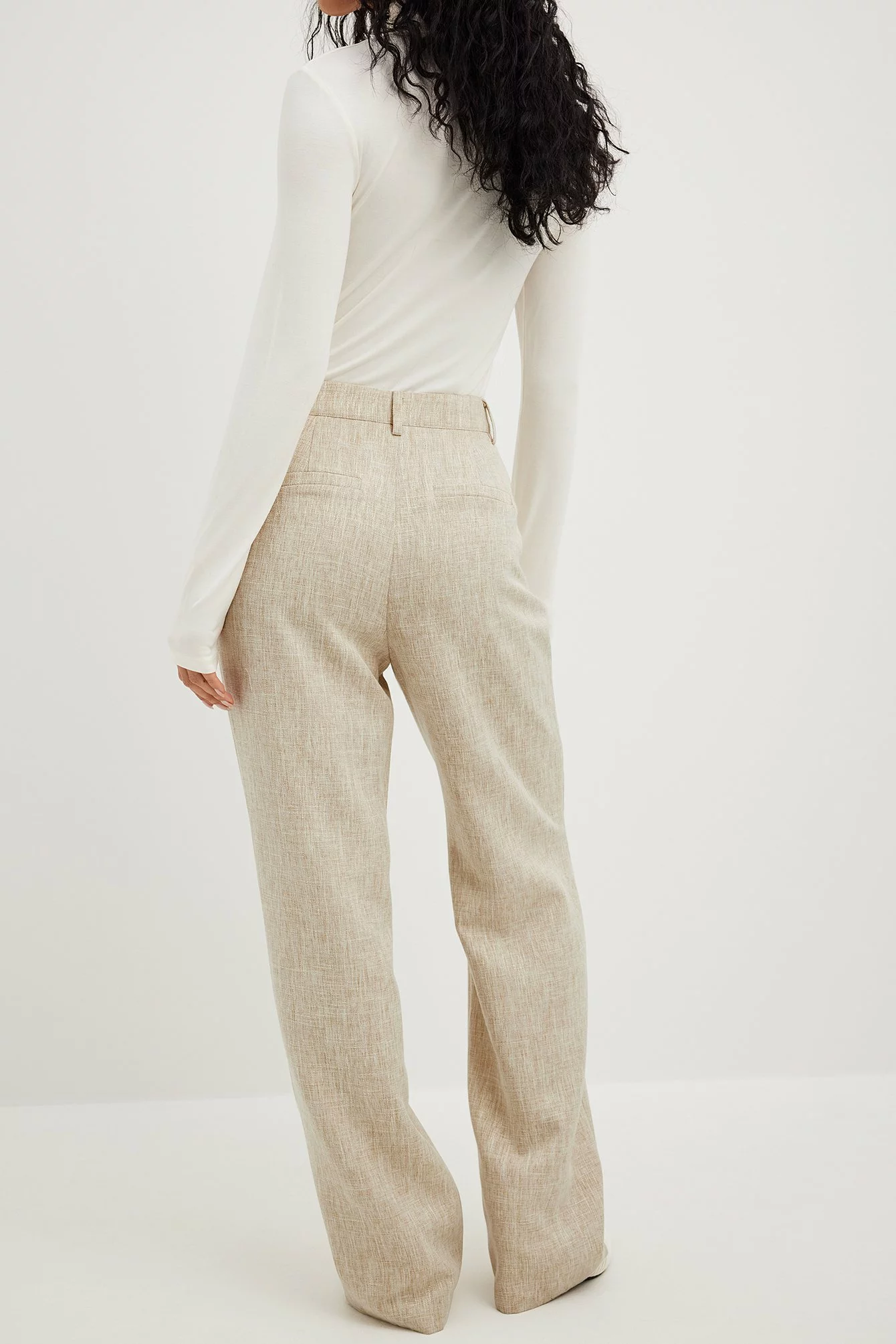 These pants are tailored and feature a high waist. They have a straight leg and a side slant pocket. These pants feature a back mock pocket.