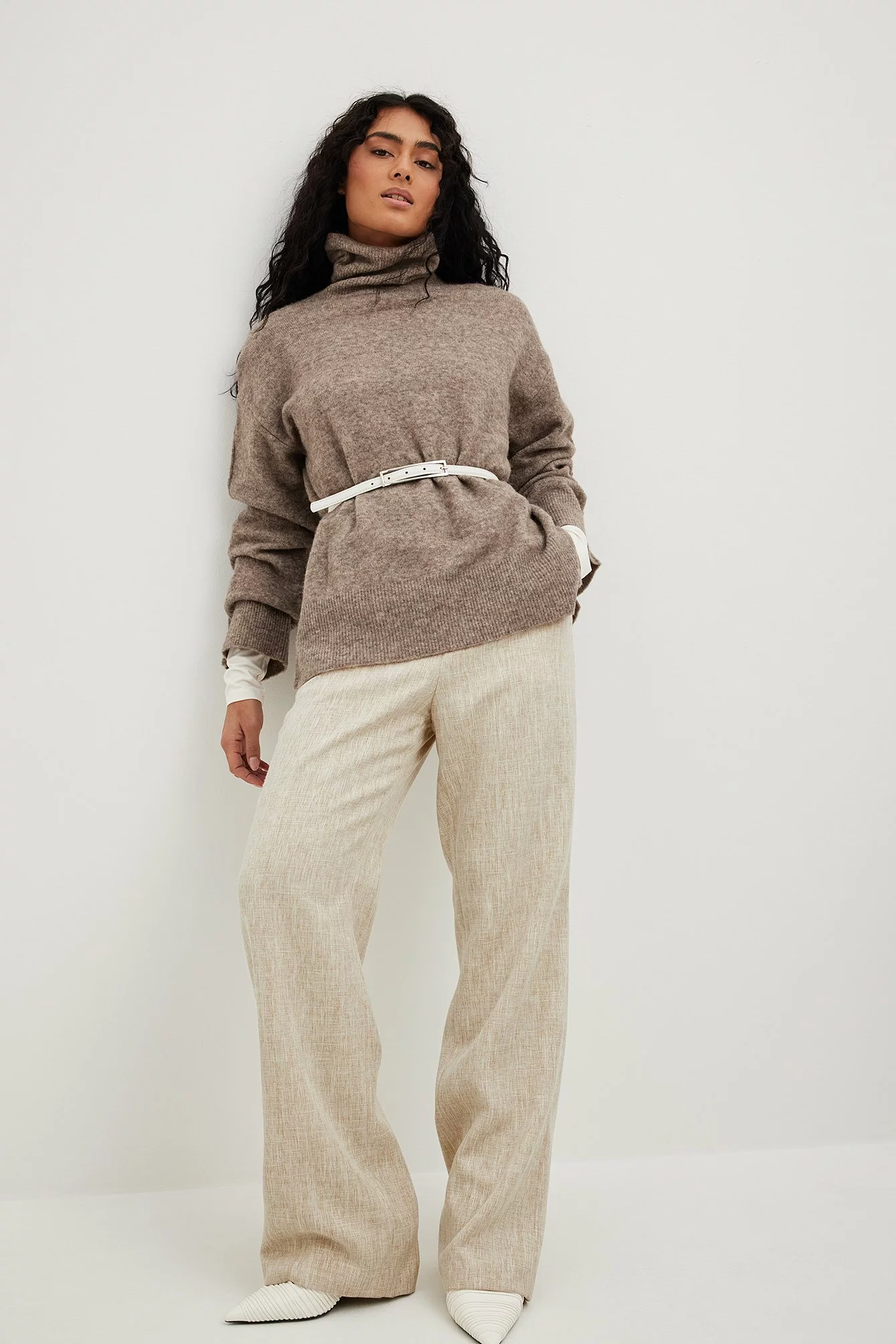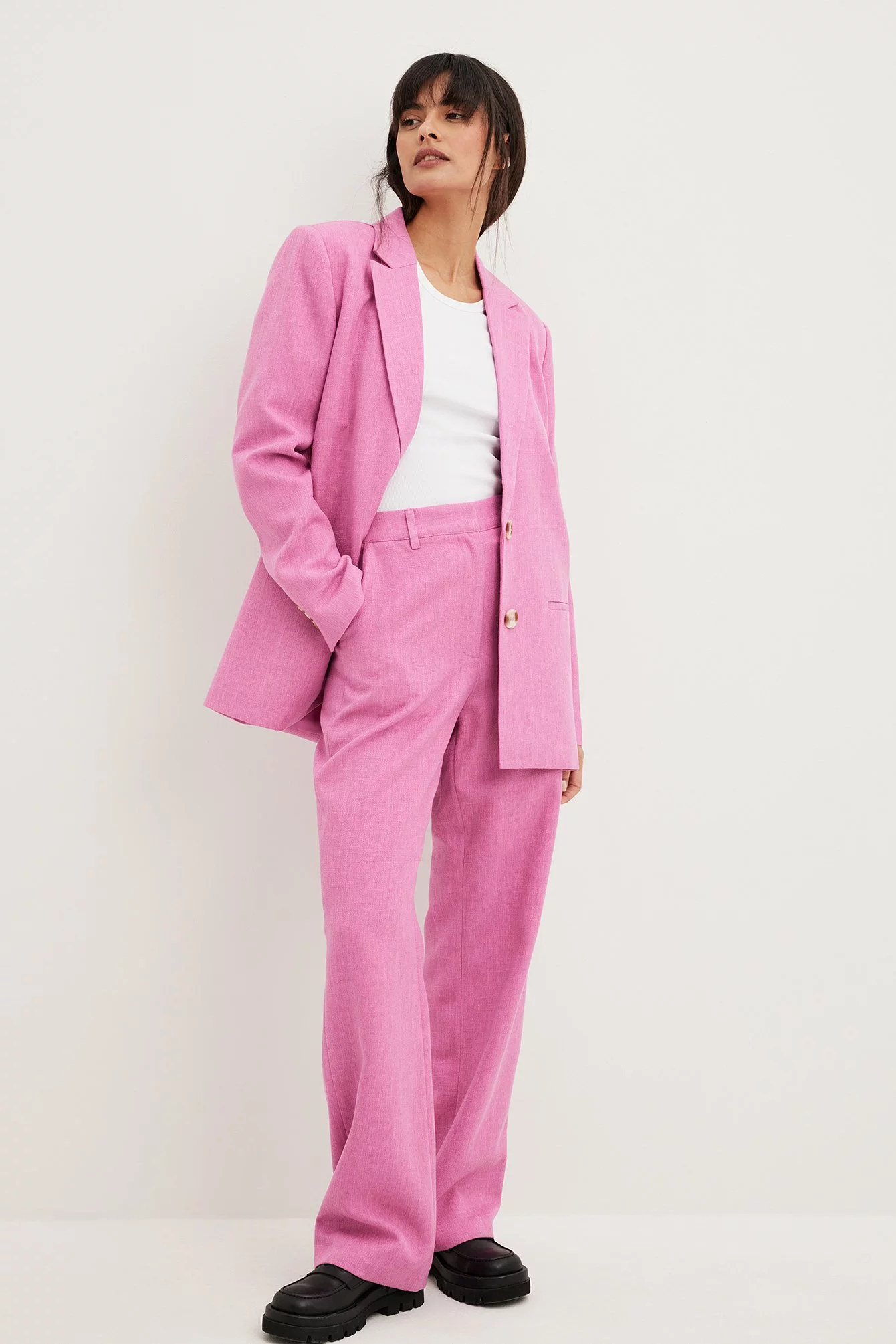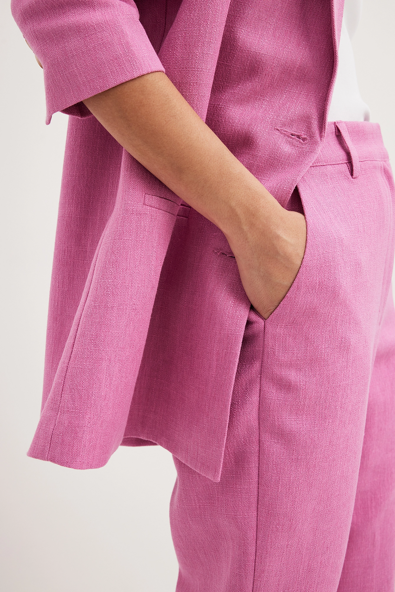 These pants are tailored and feature a high waist. They have a straight leg and a side slant pocket. These pants feature a back mock pocket.