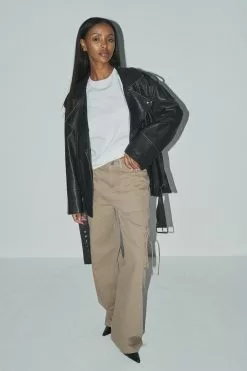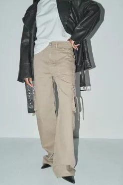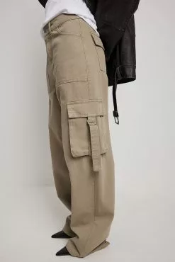 These jeans feature a cargo design. They have a high waist and wide legs. These jeans feature side pockets on each leg with strap details.
