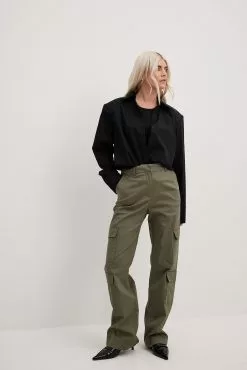 These pants feature a mid waist with belt loops. They have a straight fit and a cargo design with flap pockets at the knees and side slant pockets. Our pants feature a concealed zipper, hook and button closure.