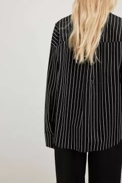 This shirt features oversize fit with button closure down the front. It has a striped design and a classic collar. This shirt features long sleeves with button cuffs.