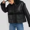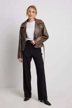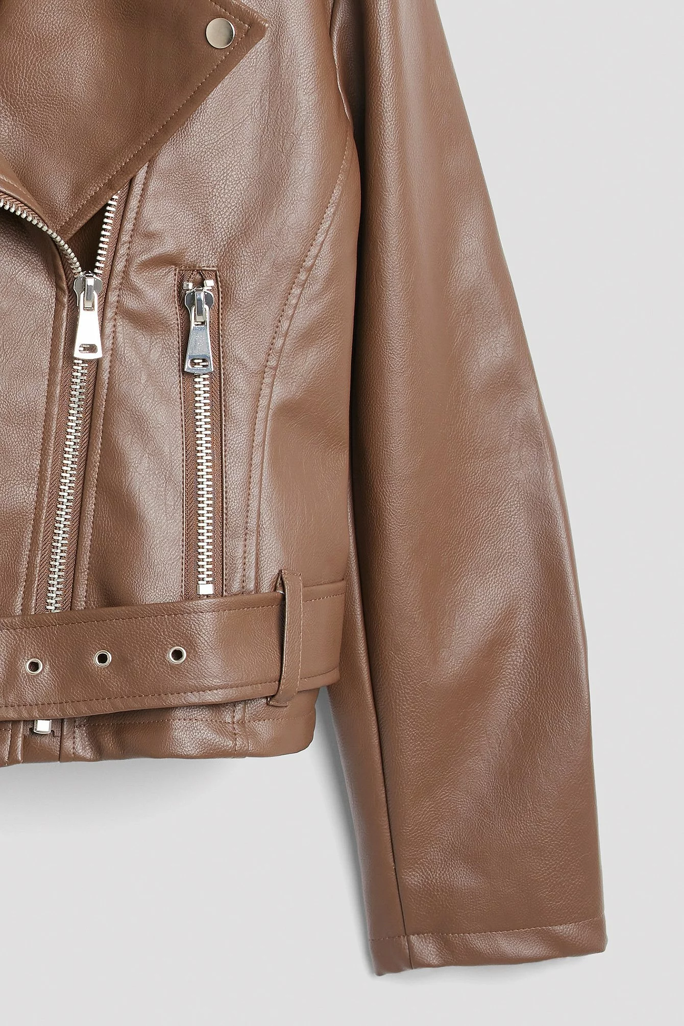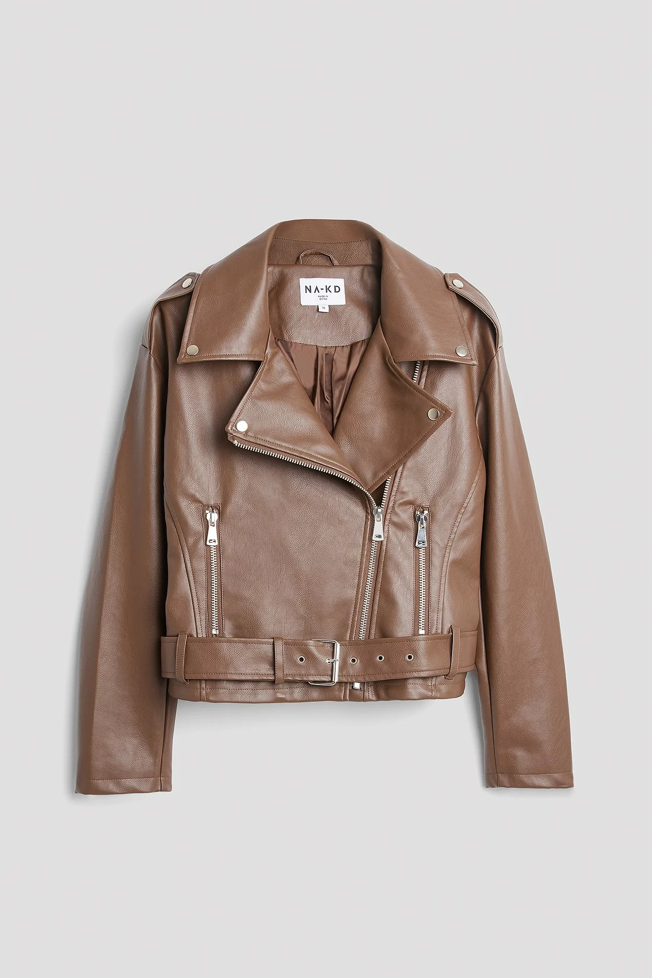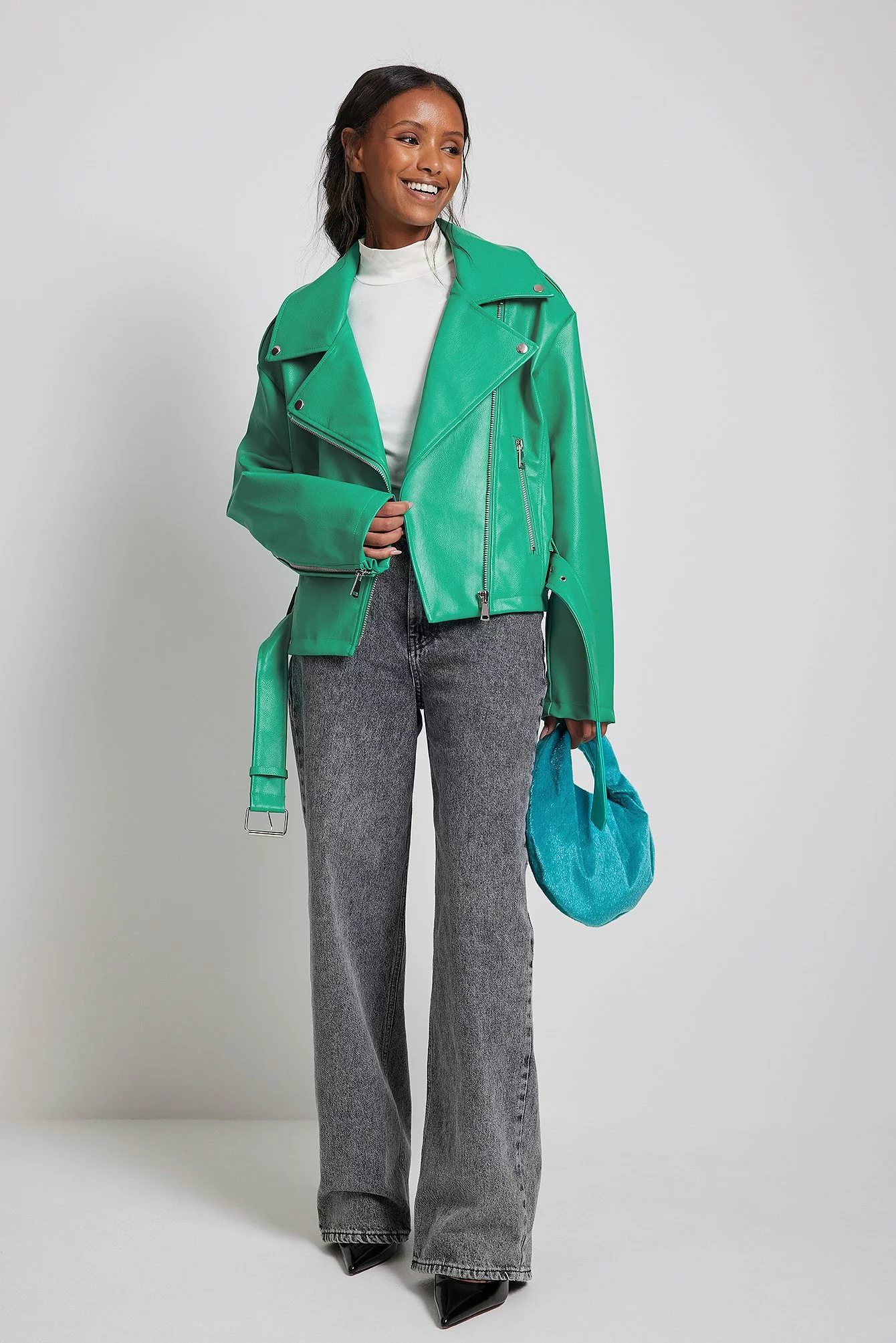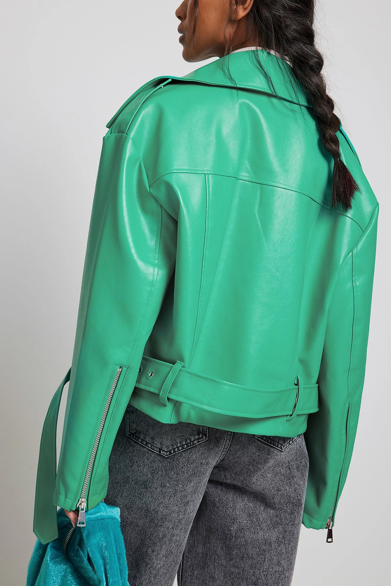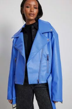 This biker jacket is oversized and belted and features a side zipper closure, zip pockets on the sides and long sleeves with a zipper detail.