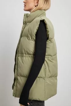 This vest features a padded high neckline, a zip closure, hidden side pockets, an adjustable drawstring waist and an oversized fit.