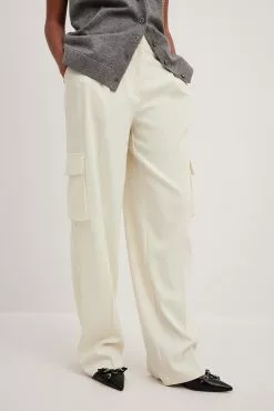 These pants are stretchy and feature a straight fit. They have a high waist and pleat details. These pants feature side slanting pockets, back mock pockets and flap pockets on the sides. Inseam length in size 36: 81 cm / 31.88 in.
