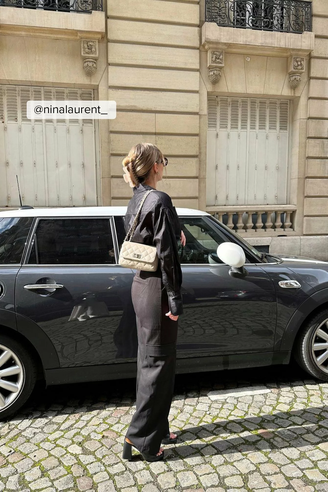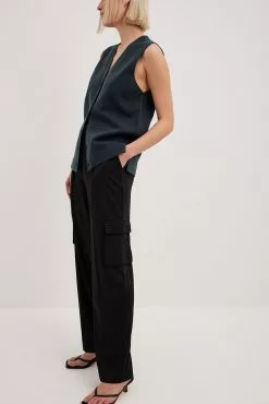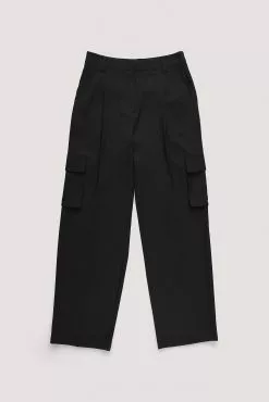 These pants are stretchy and feature a straight fit. They have a high waist and pleat details. These pants feature side slanting pockets, back mock pockets and flap pockets on the sides. Inseam length in size 36: 81 cm / 31.88 in.