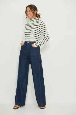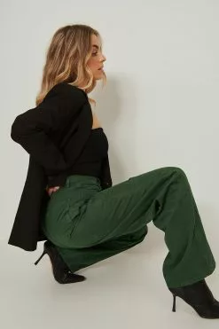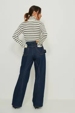 These 5-pocket pants feature a high waist with belt loops. They have a zipper and button closure and seam details. These 5-pocket pants feature wide legs.