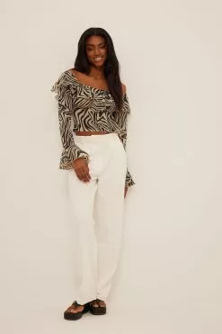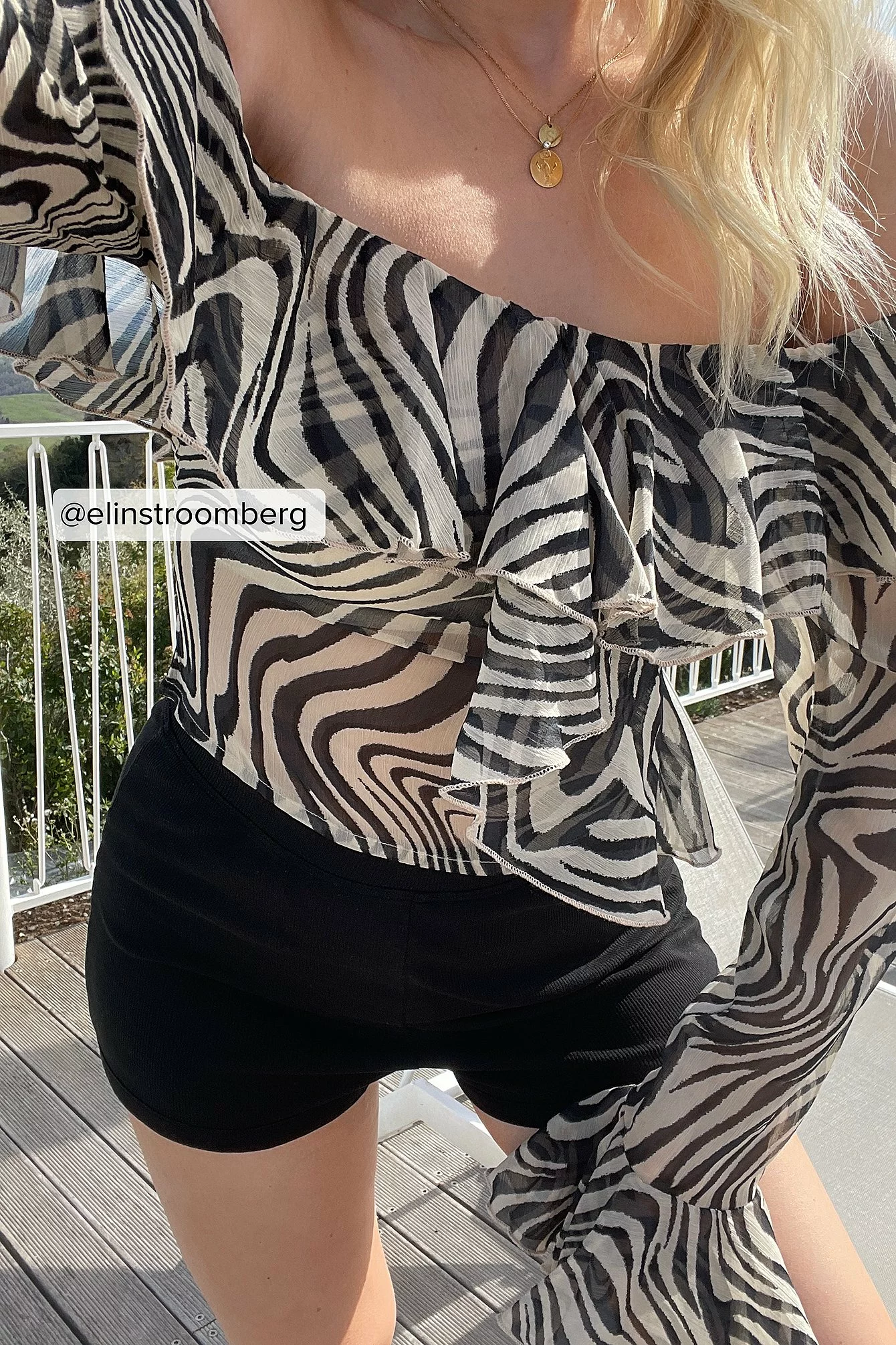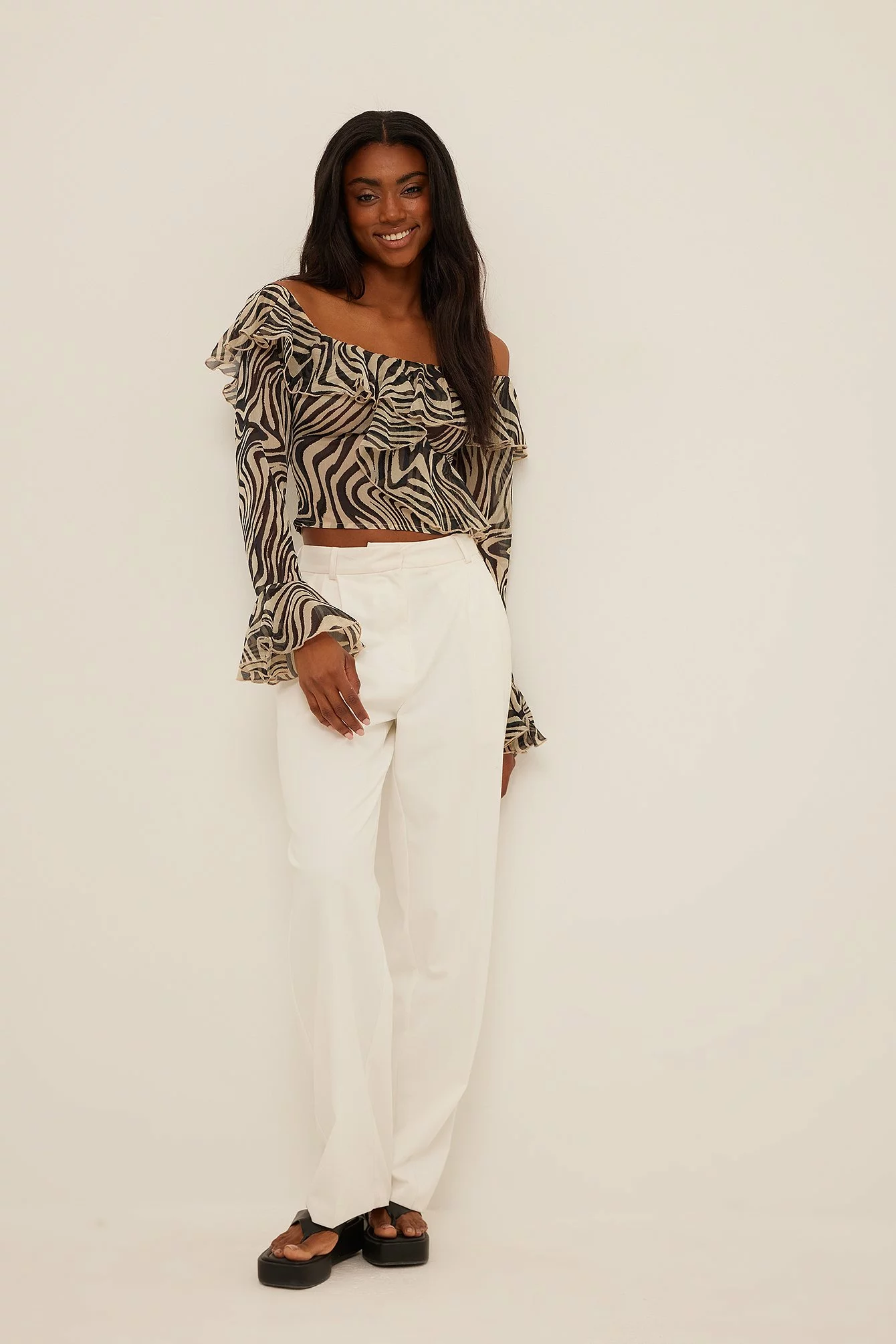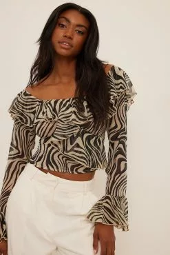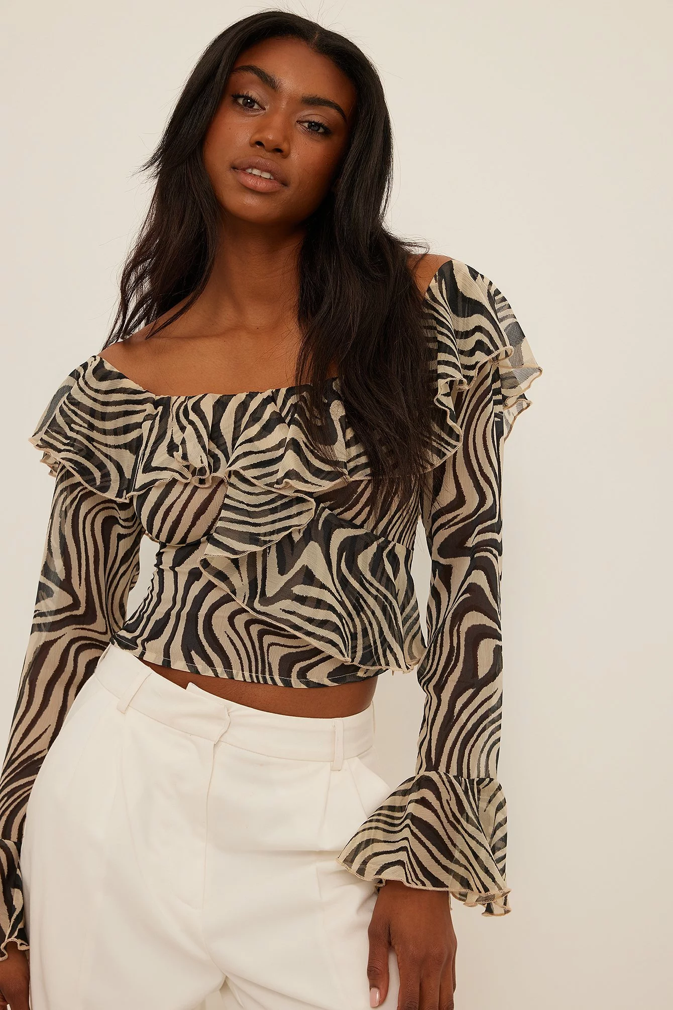 This blouse features an off-shoulder neckline with a frill on the front and on the back, sleeves with frilled cuffs, a frilled asymmetrical design on the front, a transparent material and a hidden zip closure on the side.
