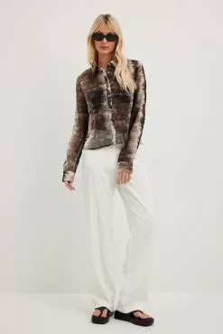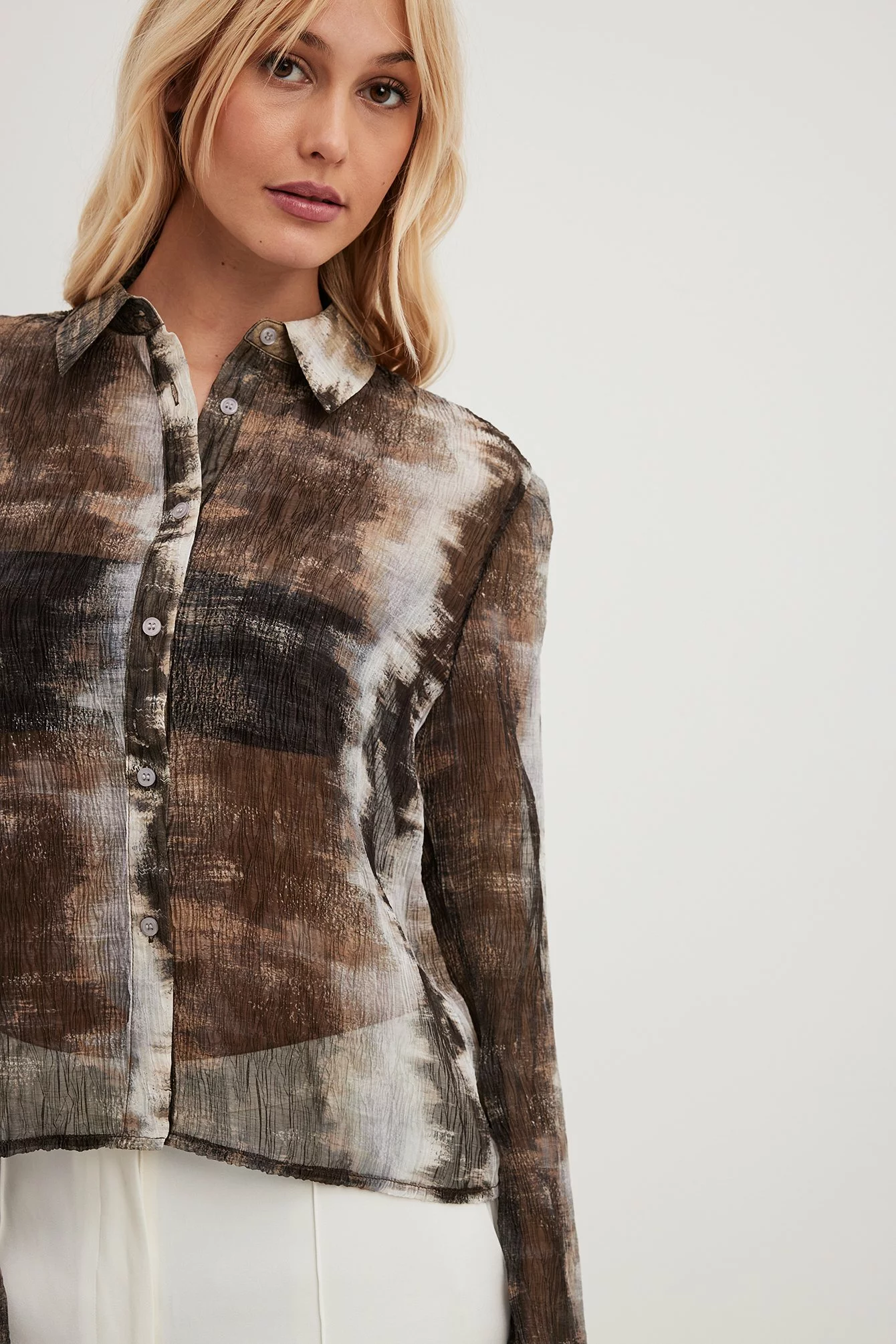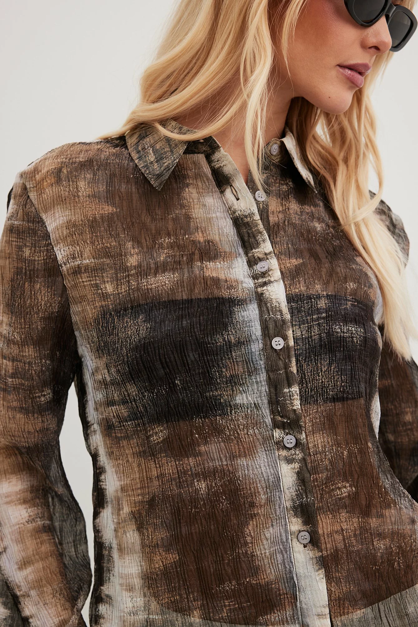 This shirt features a sheer material. It has a printed design and a textured material. This shirt features single button cuffs and a button closure.