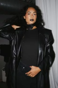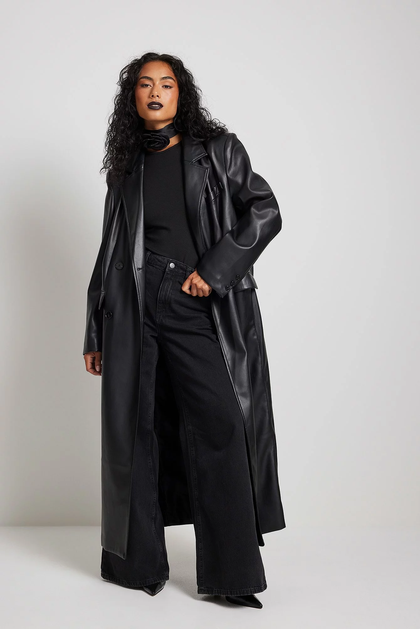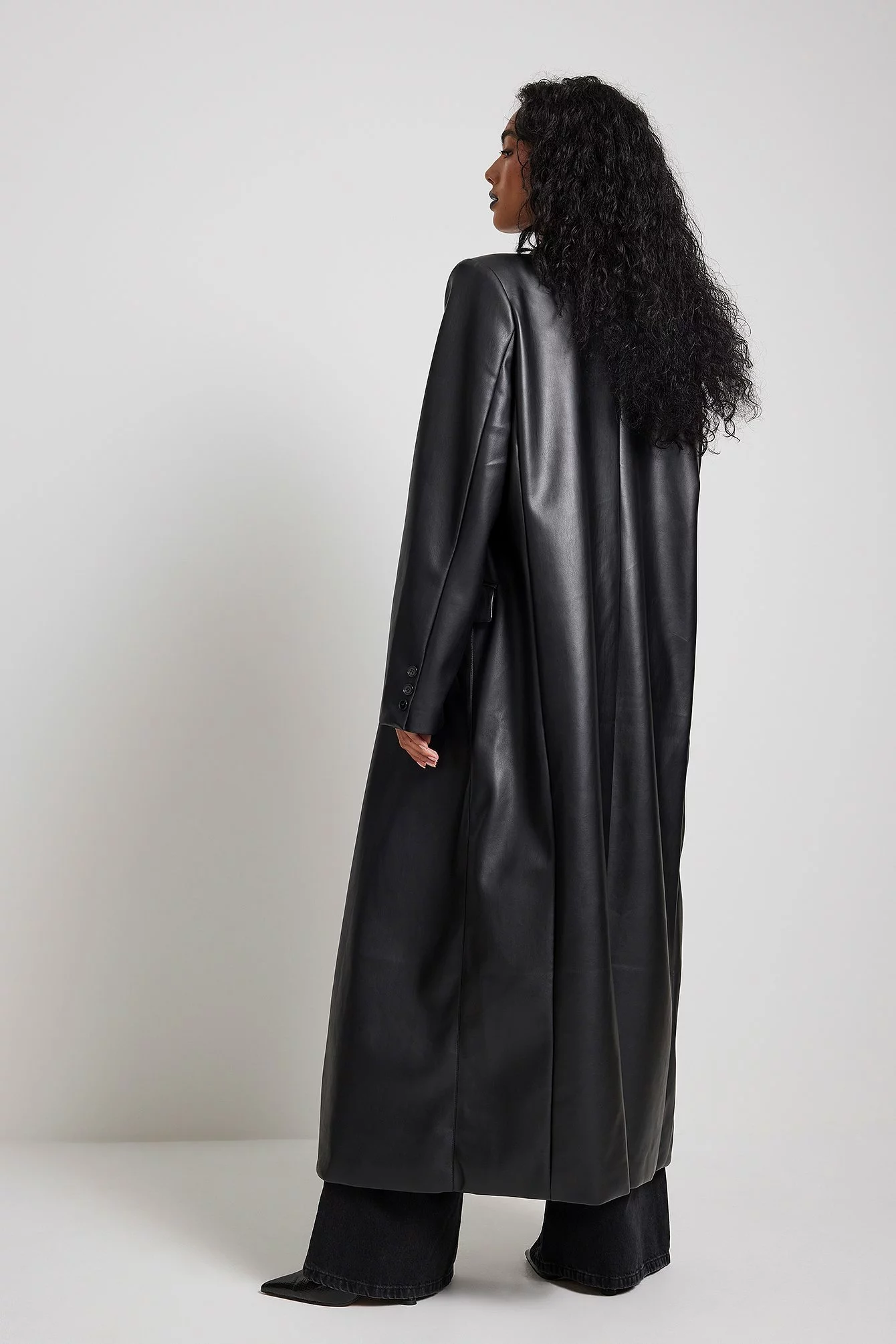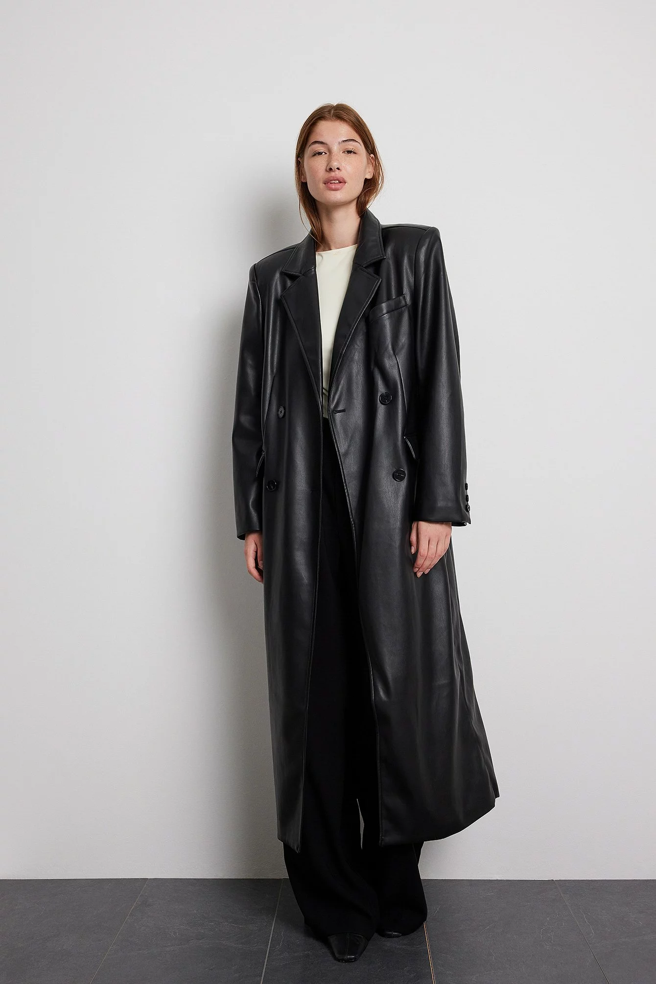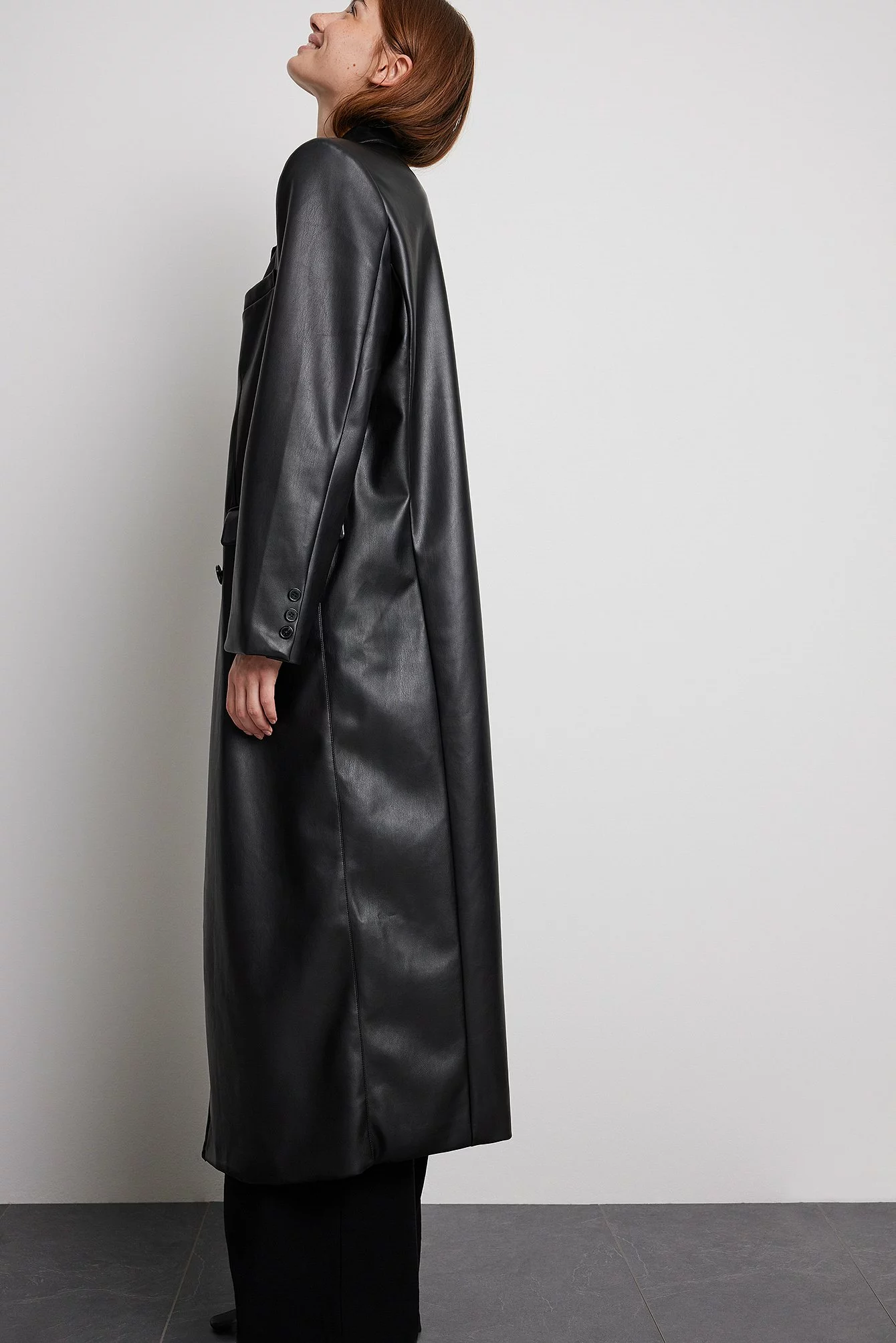 This coat is double-breasted and features a faux leather, a lapel design, long sleeves with triple button cuffs, front flap pockets, a small chest pocket and a slit detail at the back.