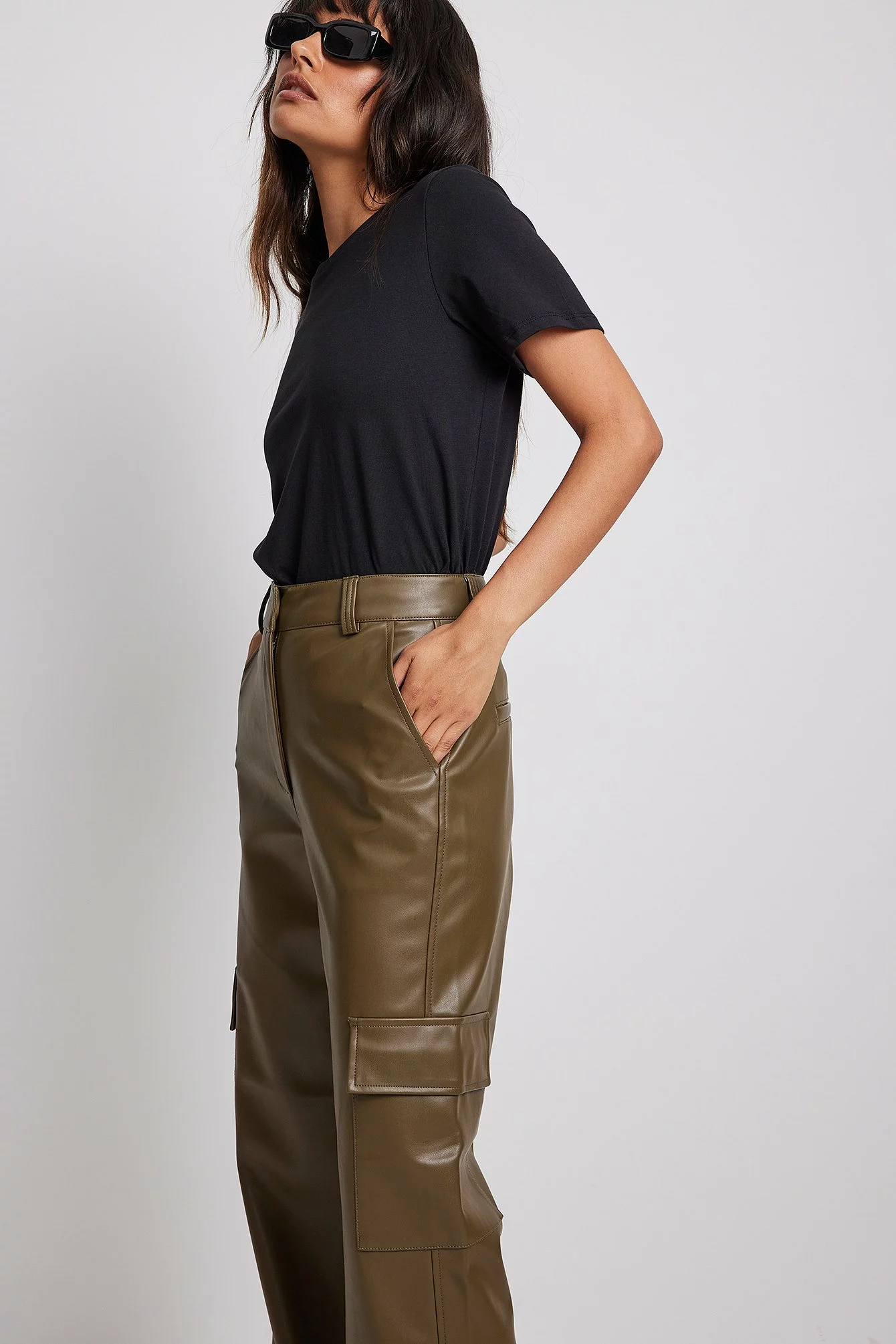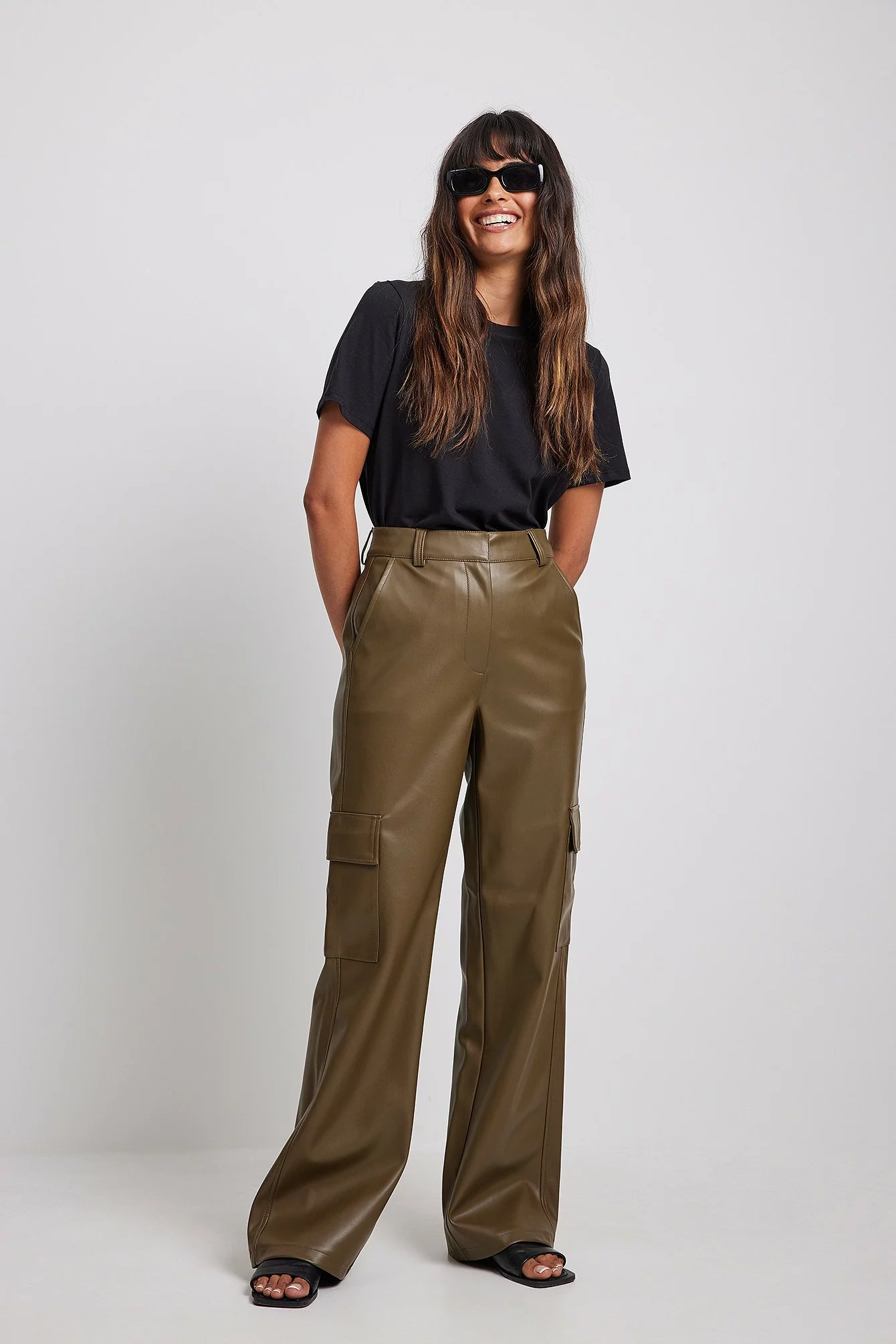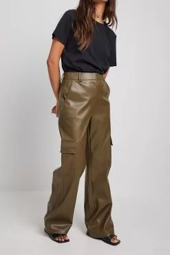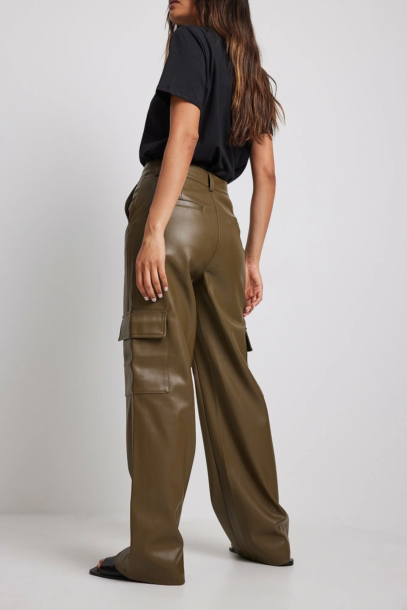 These trousers are made of PU leather and feature a cargo design. They have a high waist with belt loops and a zipper, hook and button closure. These trousers feature side pockets, a back mock pocket and a straight leg. Inseam length in size 36: 81 cm / 31.88 in.