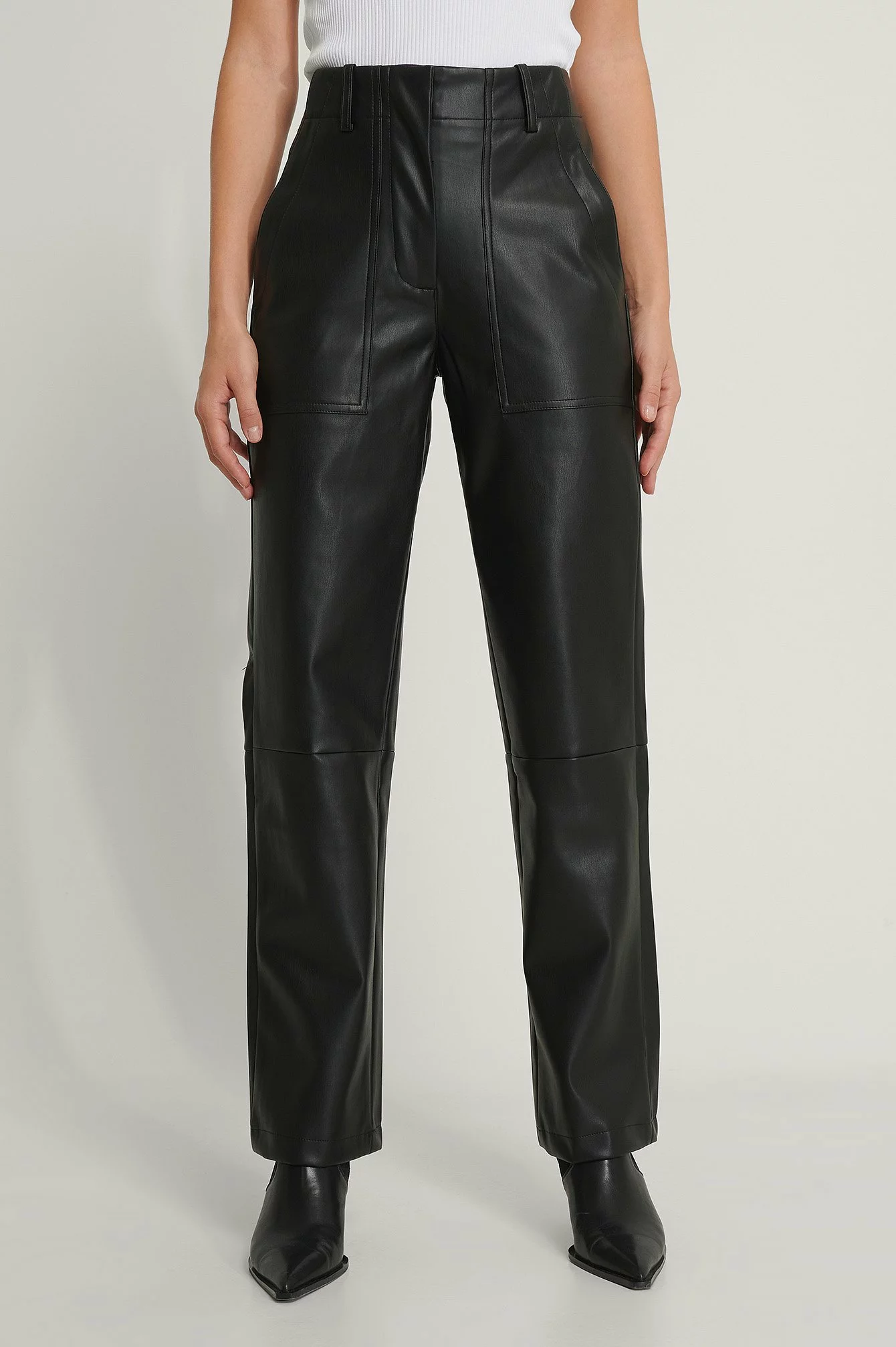 These pants feature four pockets, a slightly high waist, belt loops, a zipper, hook and button closure, seam details and a material in PU.