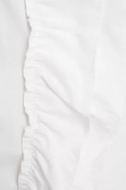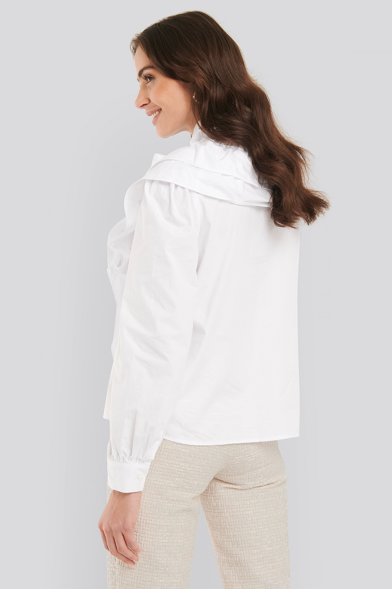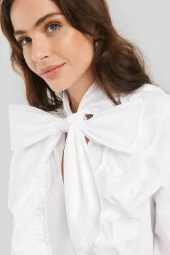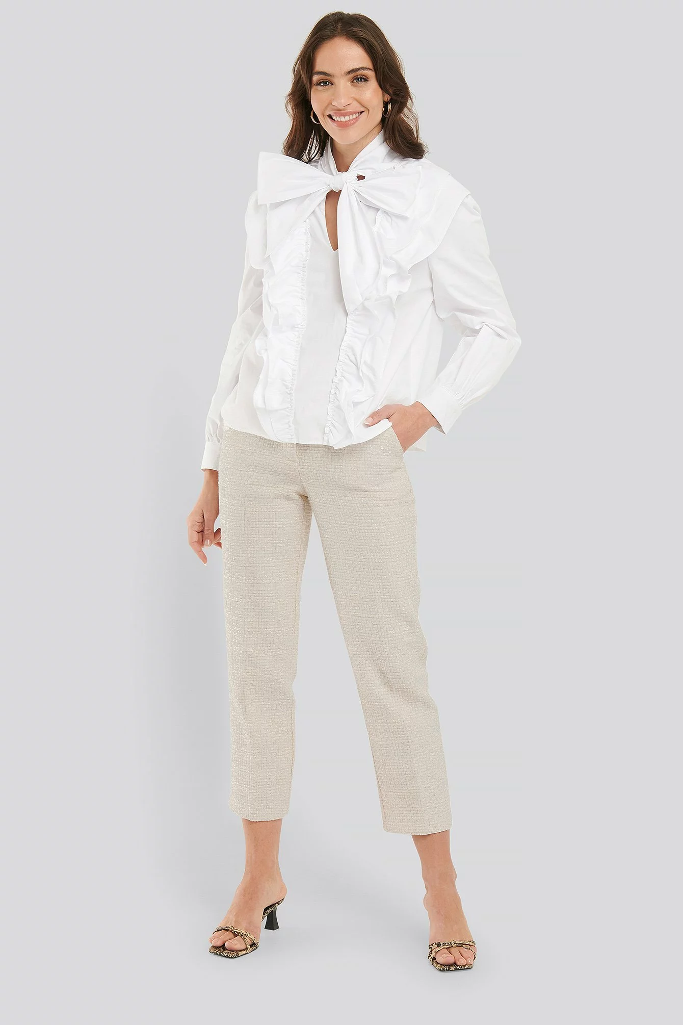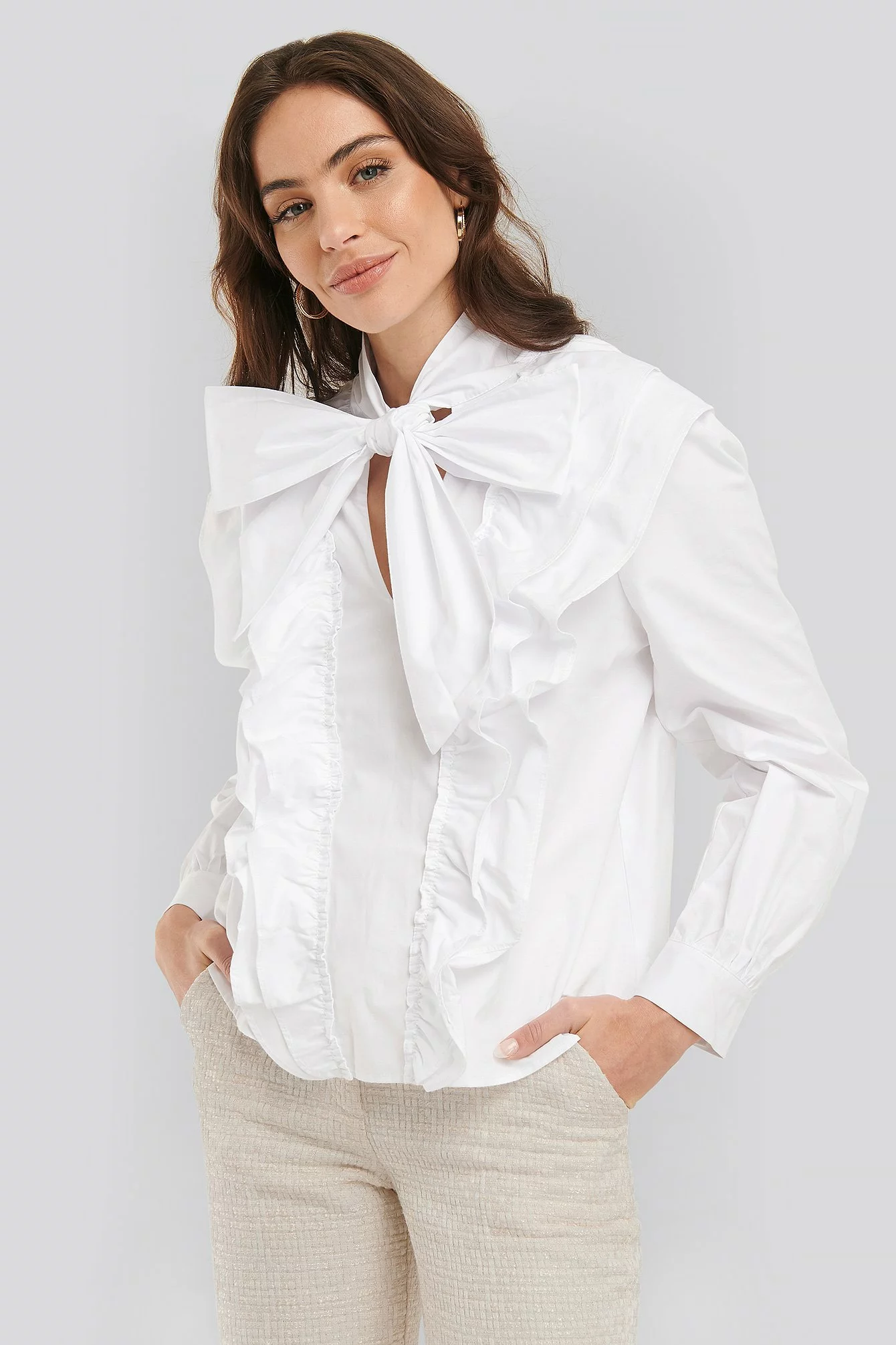 This blouse features a self tie neckline, a v-neck cut, frill details on the front and a long sleeve with single button cuffs.