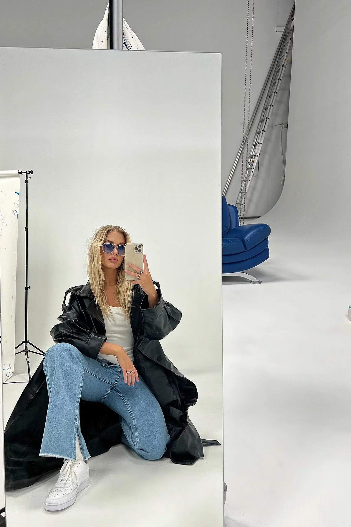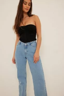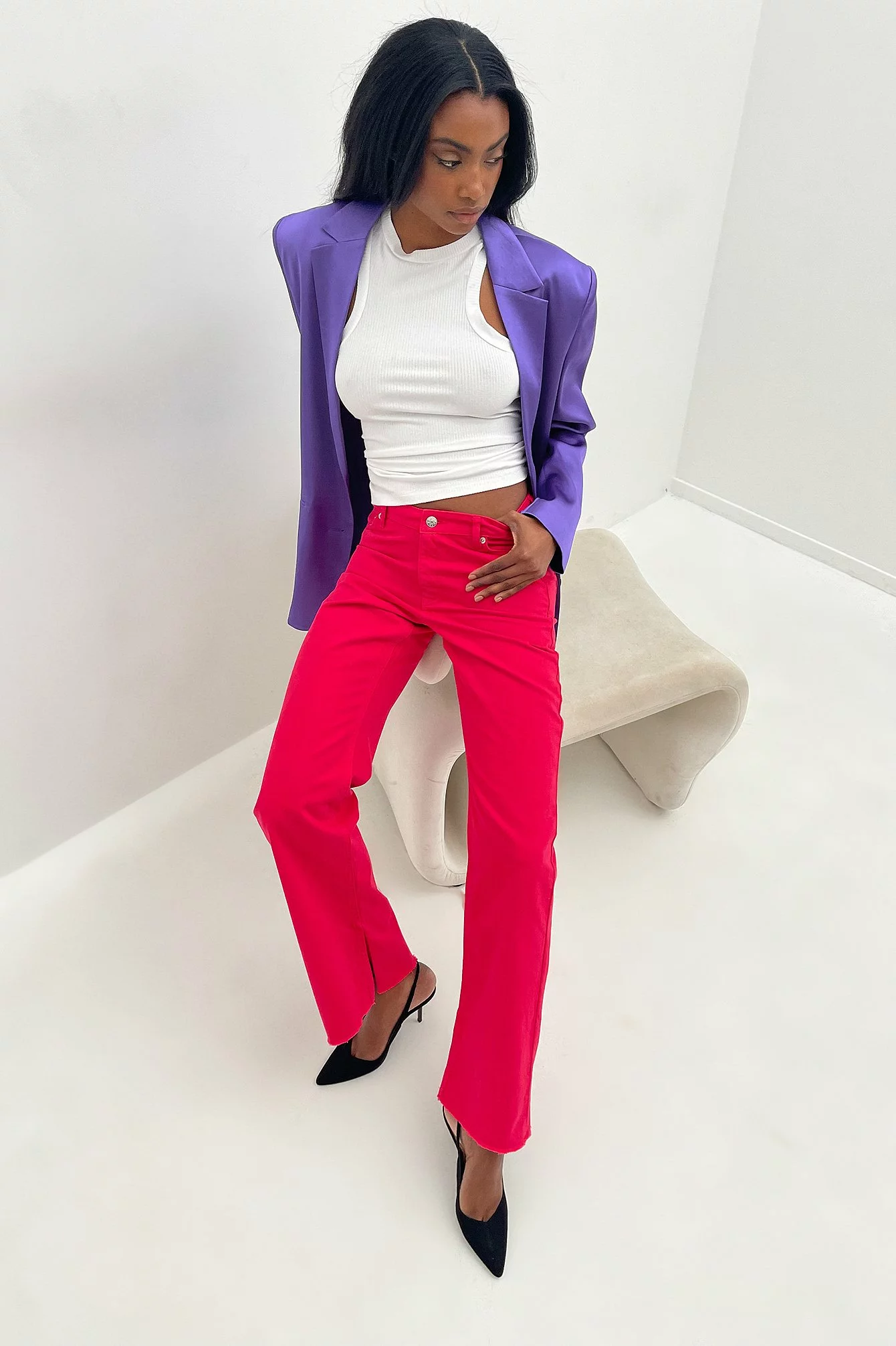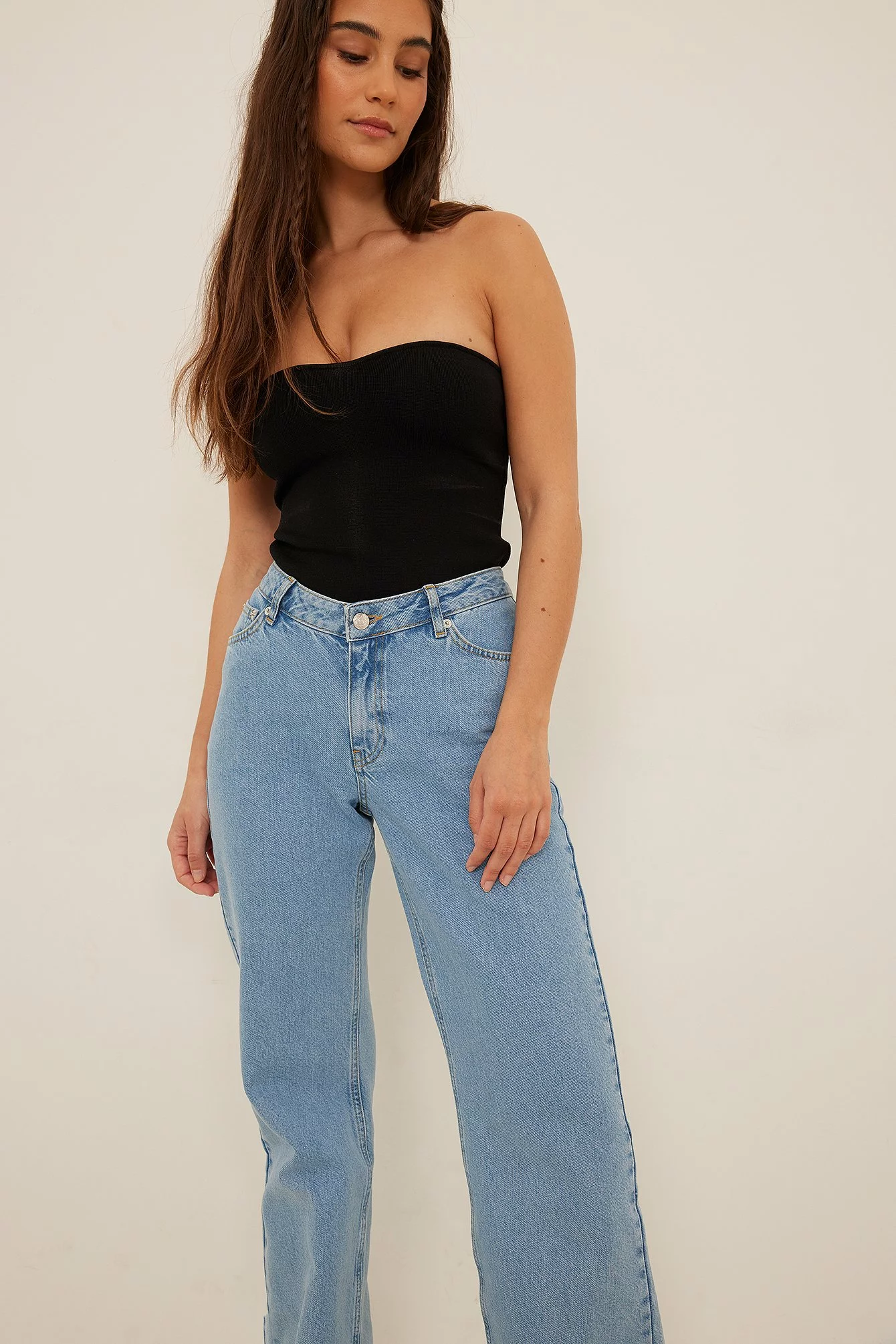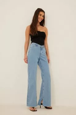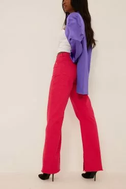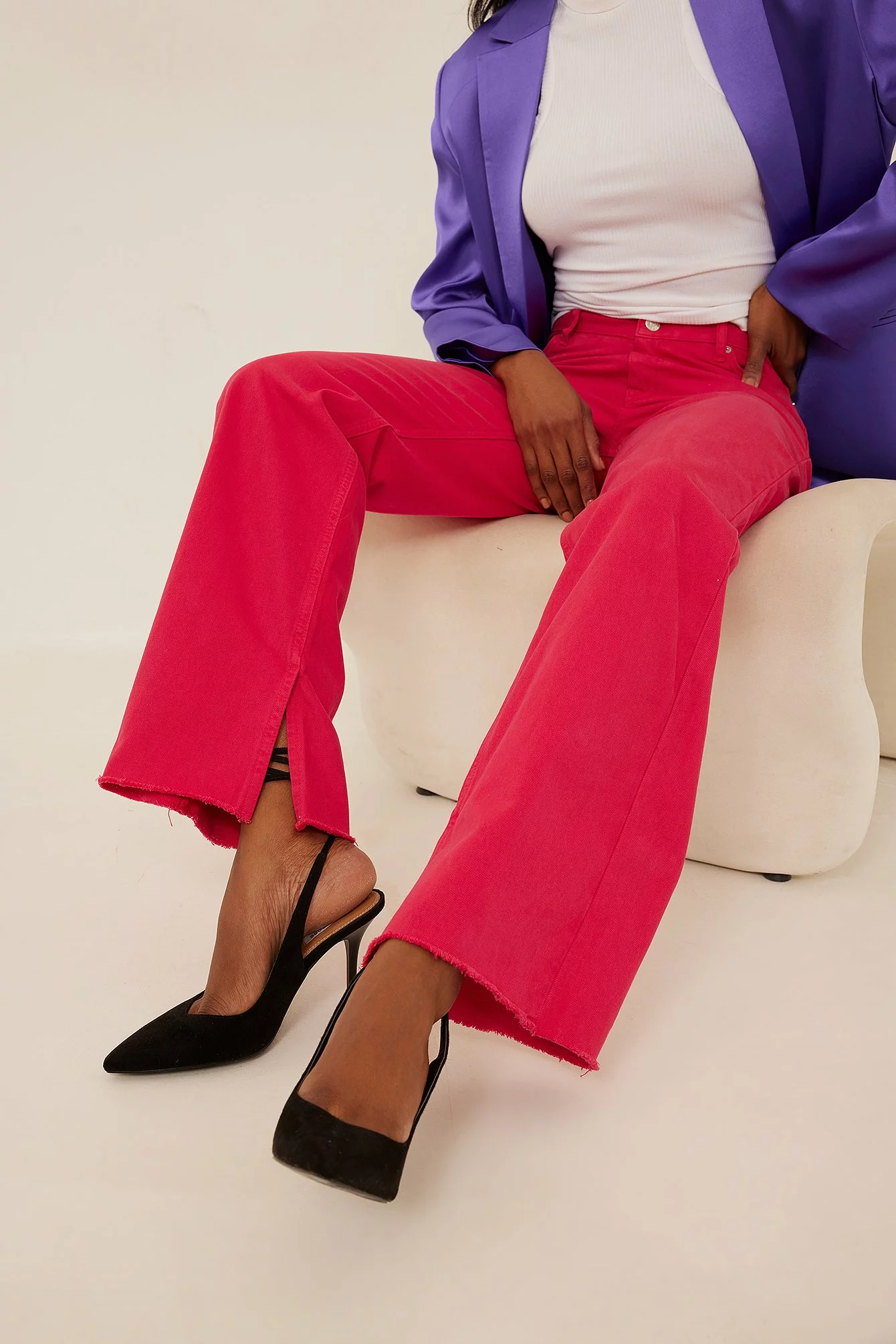 These jeans feature a high waist, a zip and button closure and a wide leg with raw hems.