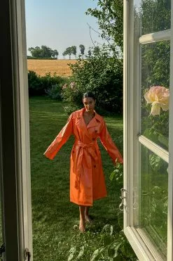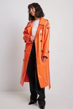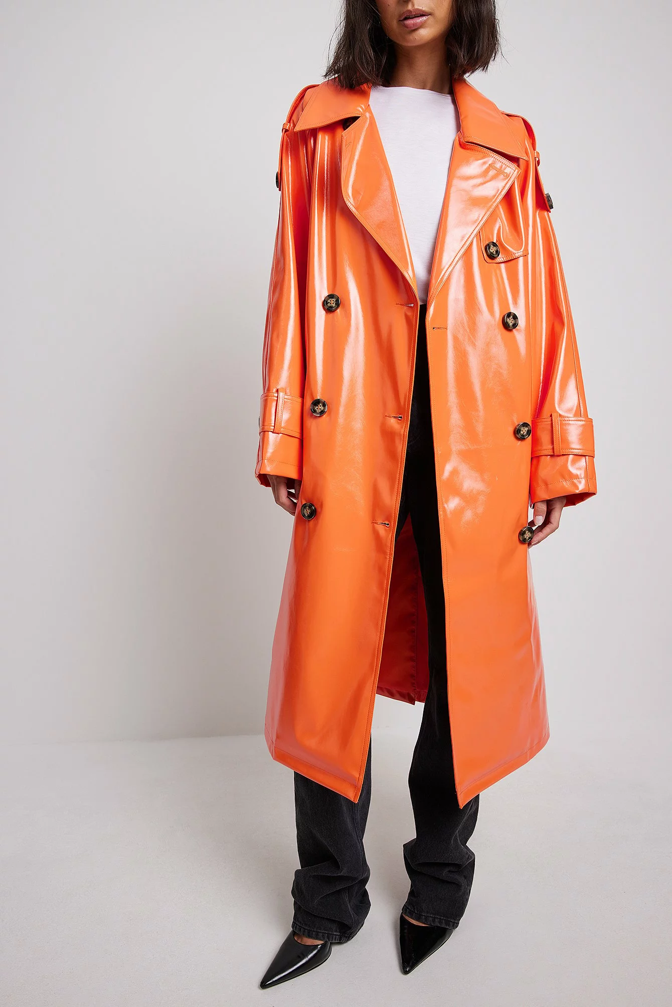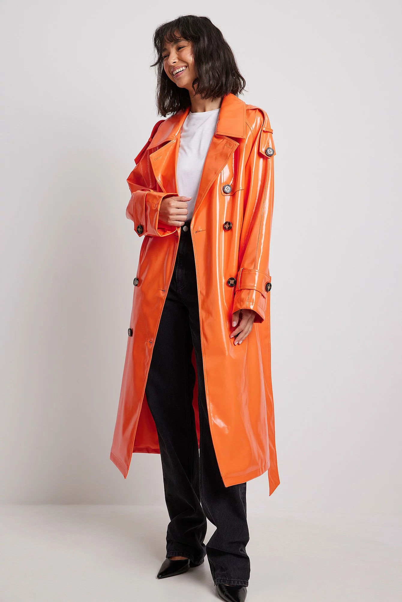 This trenchcoat features a shiny material, a long fit, a lapel neckline, long sleeves, a button closure, a belt tie and belts on each sleeve.