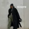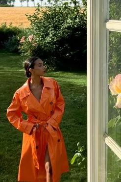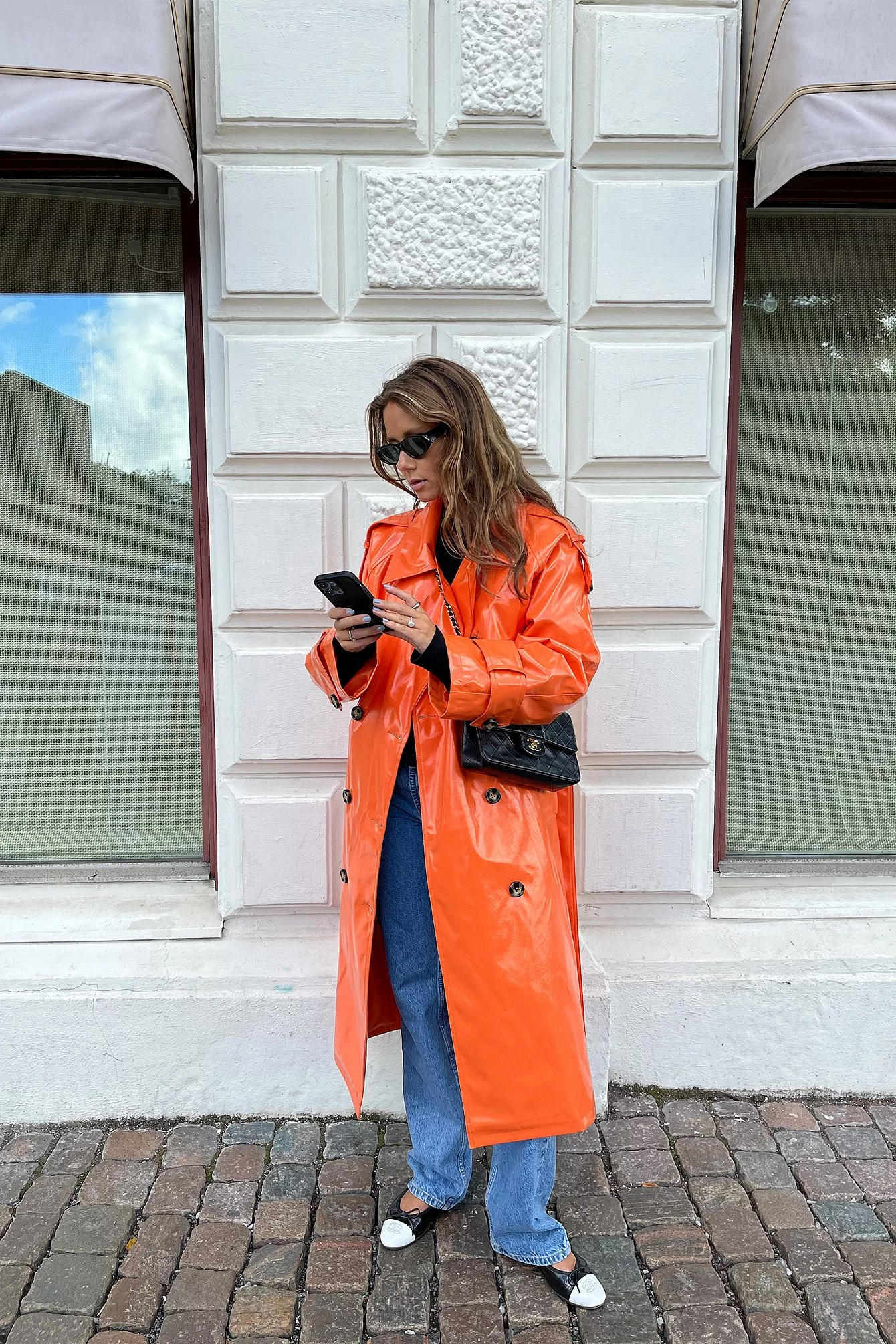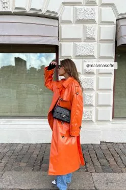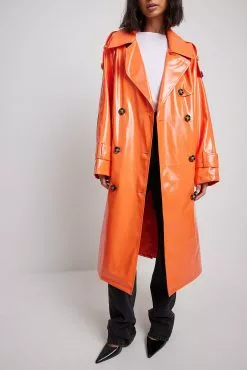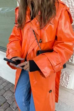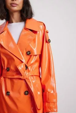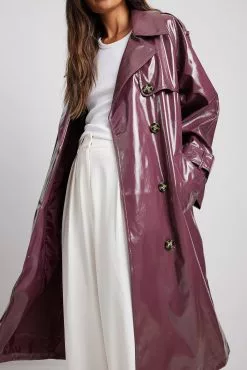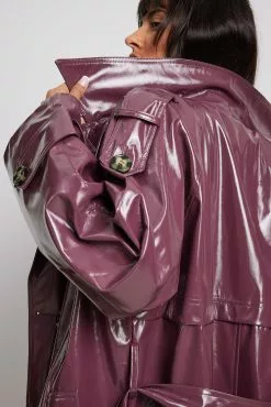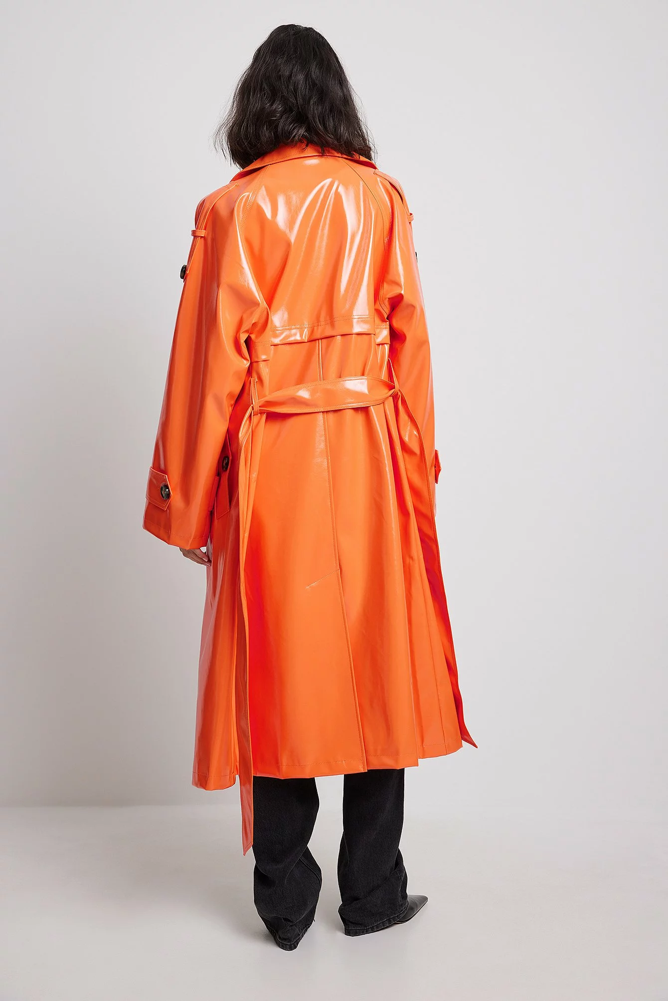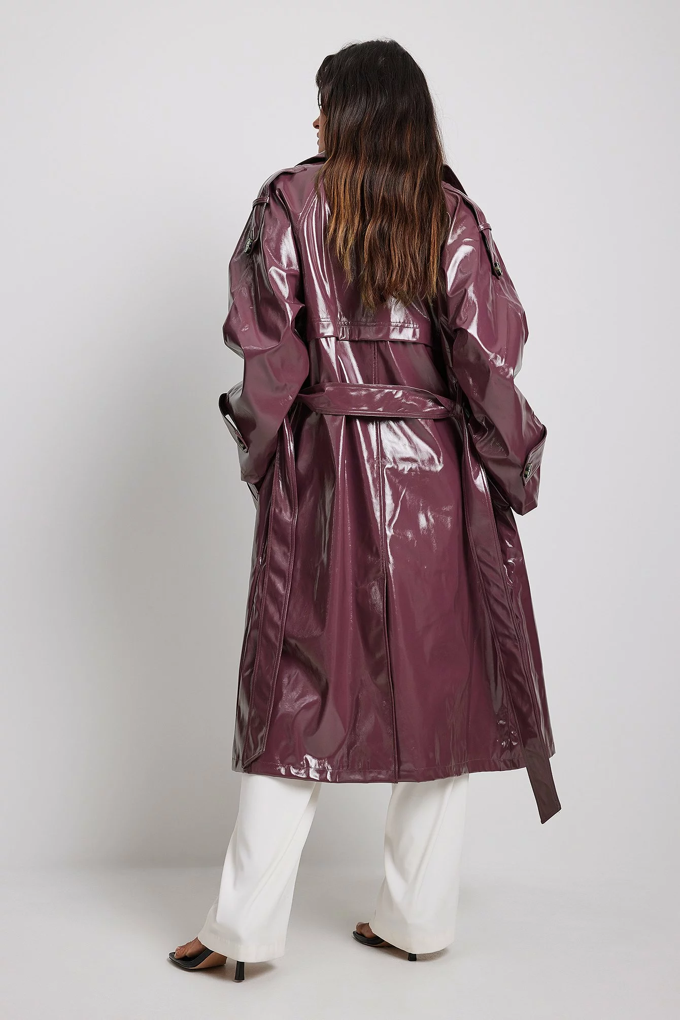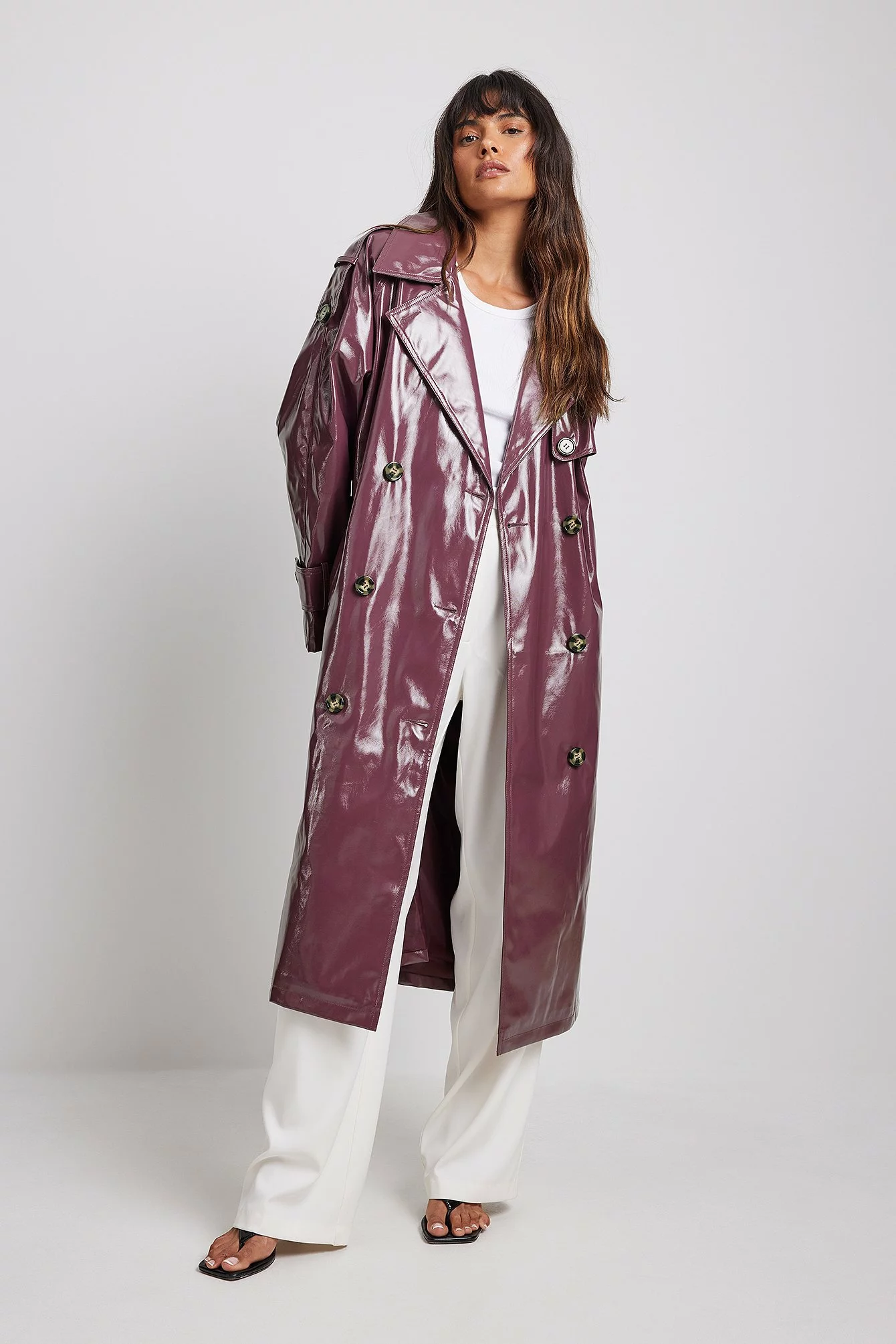 This trenchcoat features a shiny material, a long fit, a lapel neckline, long sleeves, a button closure, a belt tie and belts on each sleeve.