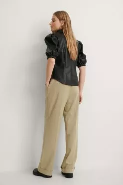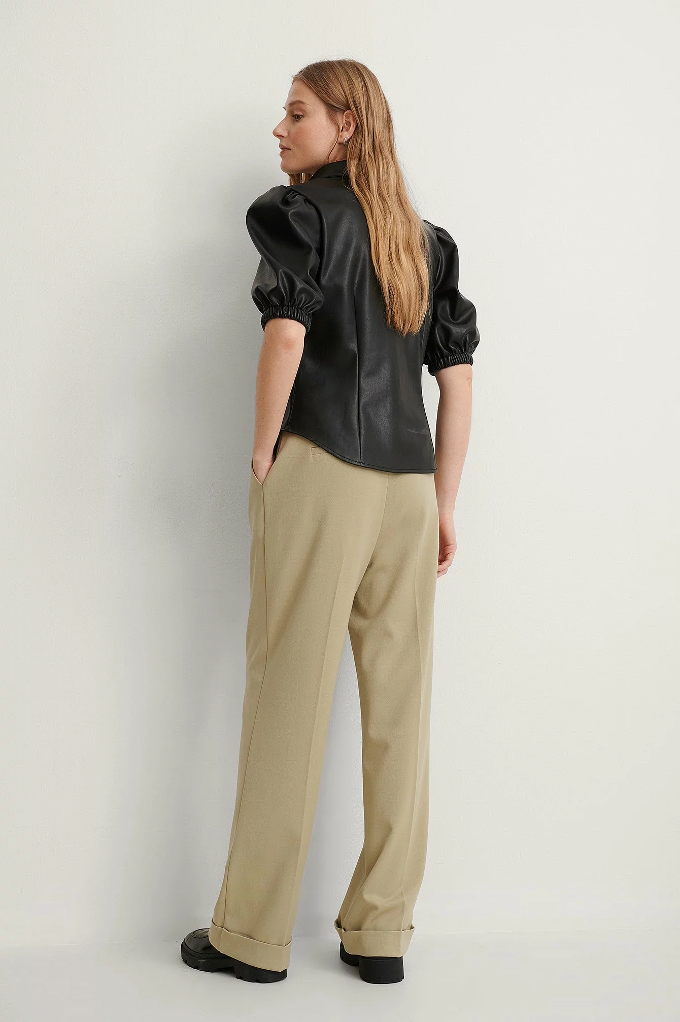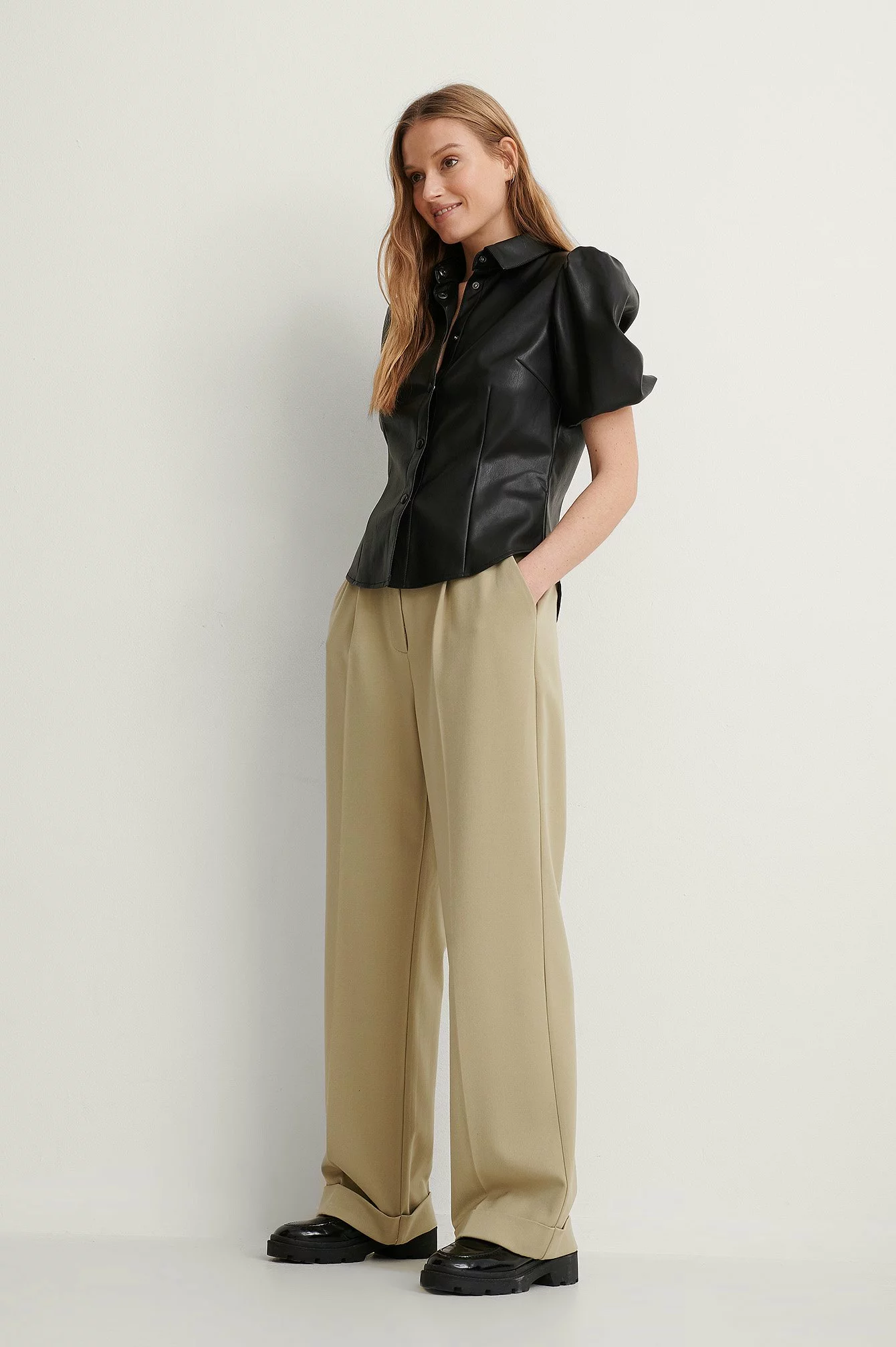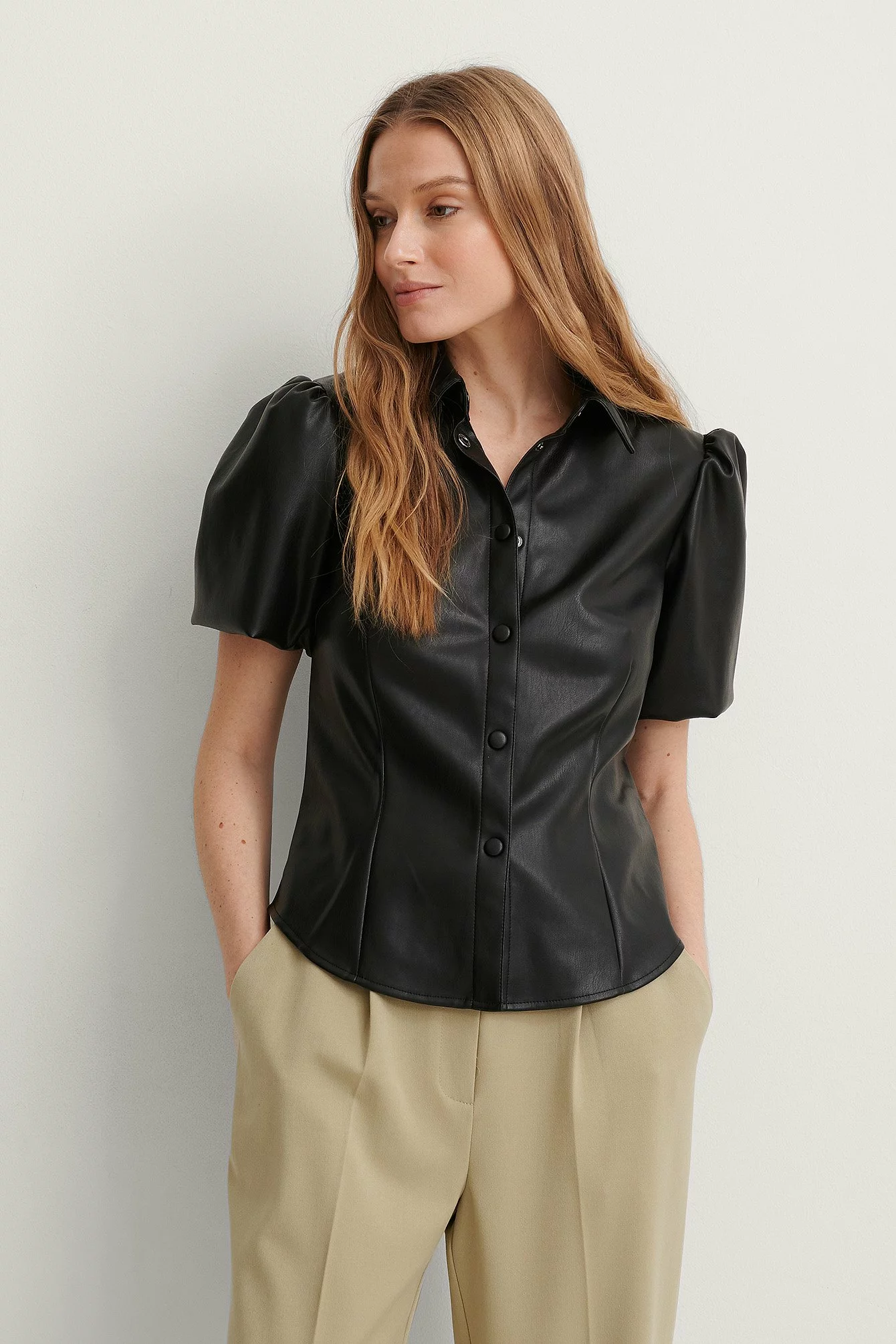 This blouse features a classic collar, short puff sleeves and button closures along the front.