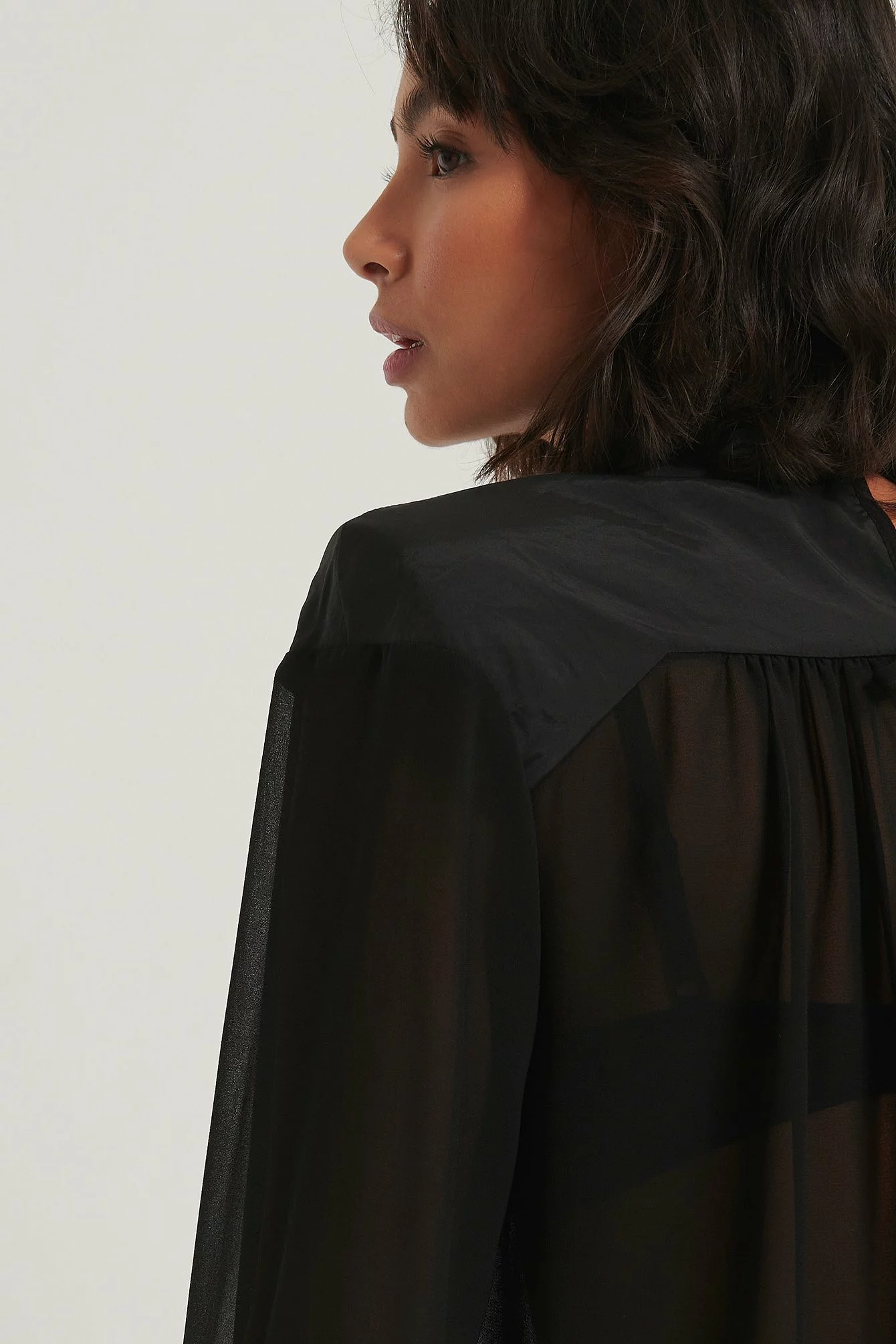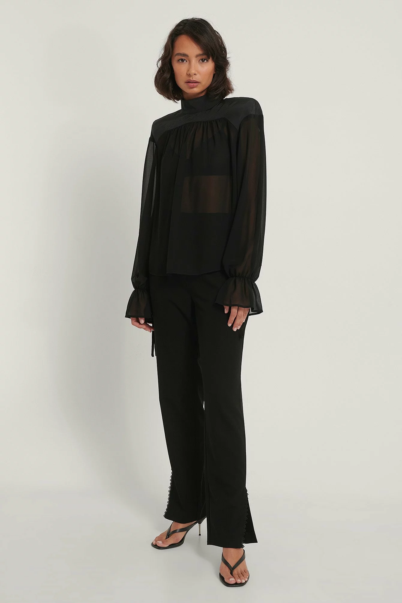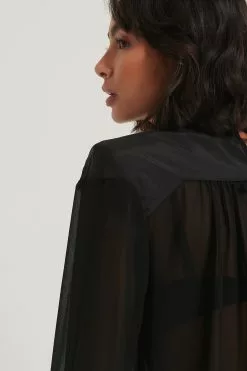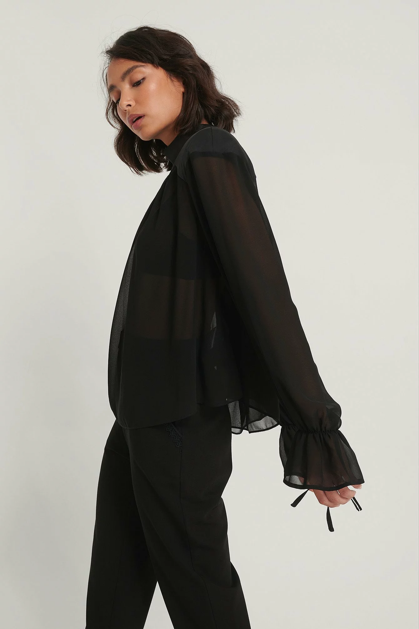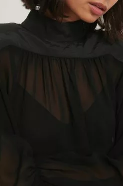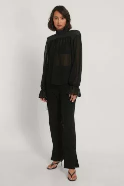 This blouse is made of chiffon and features slightly sheer fabric, a high neck with a button closure at the back of the neck, puffy long sleeves with a self tie detail, padded shoulders, self tie details on the back and gathered seam details.