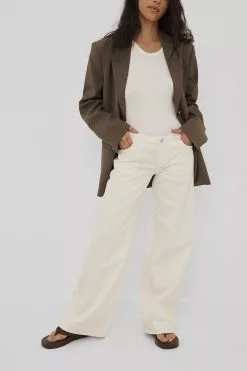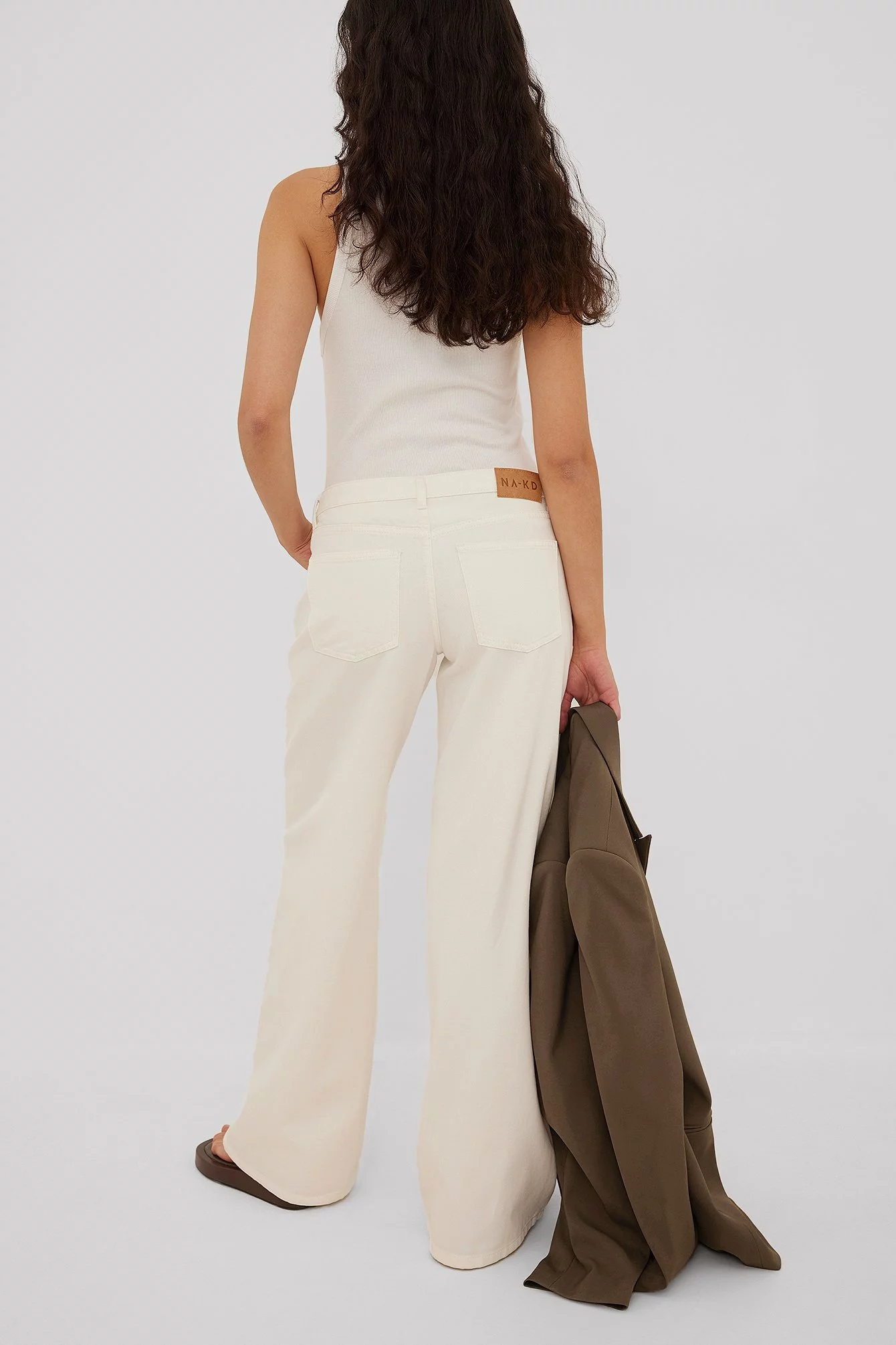 These 5-pocket jeans feature a low waist, a zip and button closure and long wide legs.