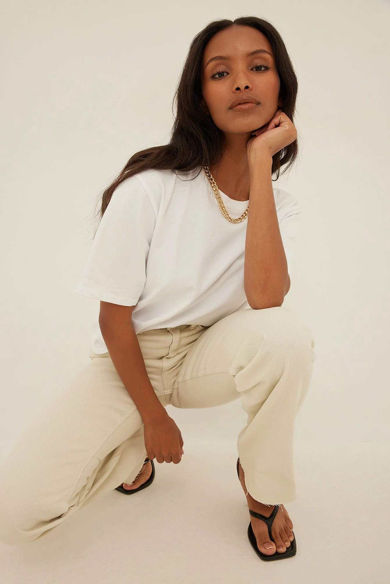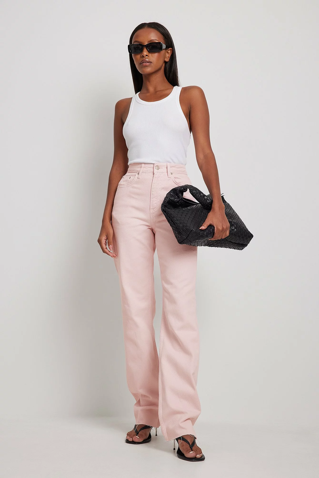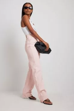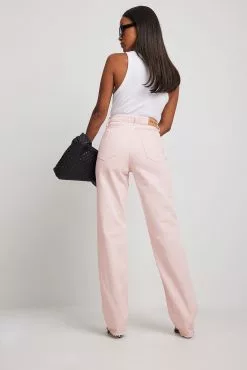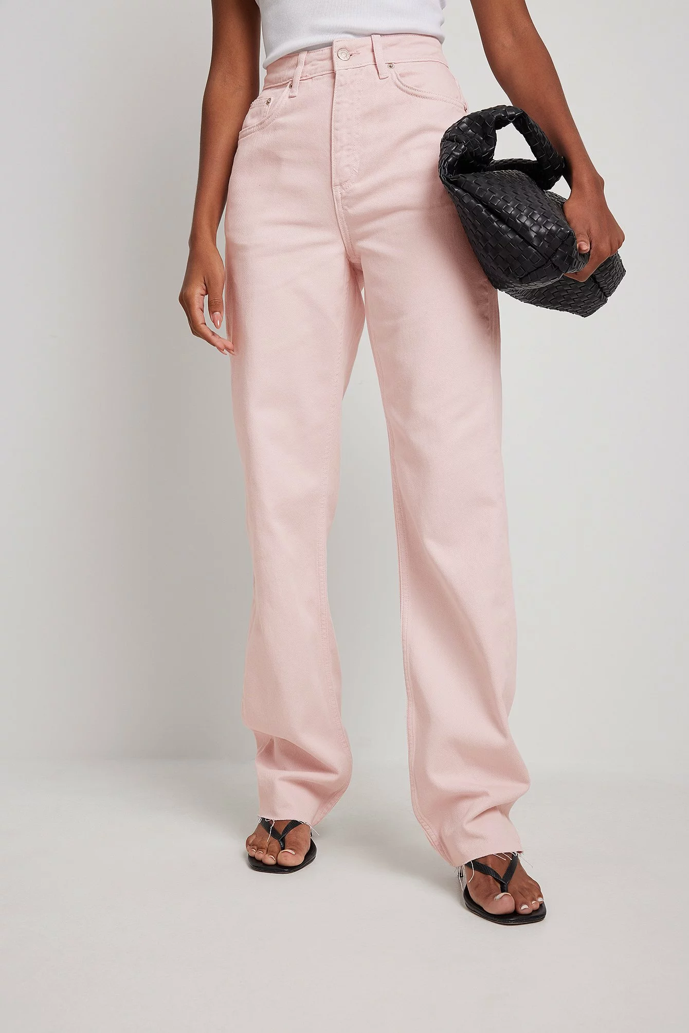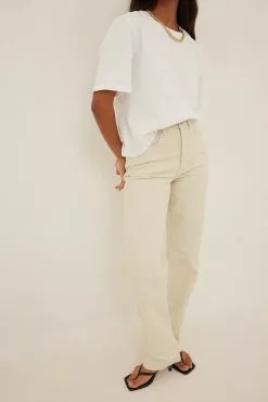 These 5-pocket jeans feature a high waist, a zip and button closure, straight legs and raw hems.