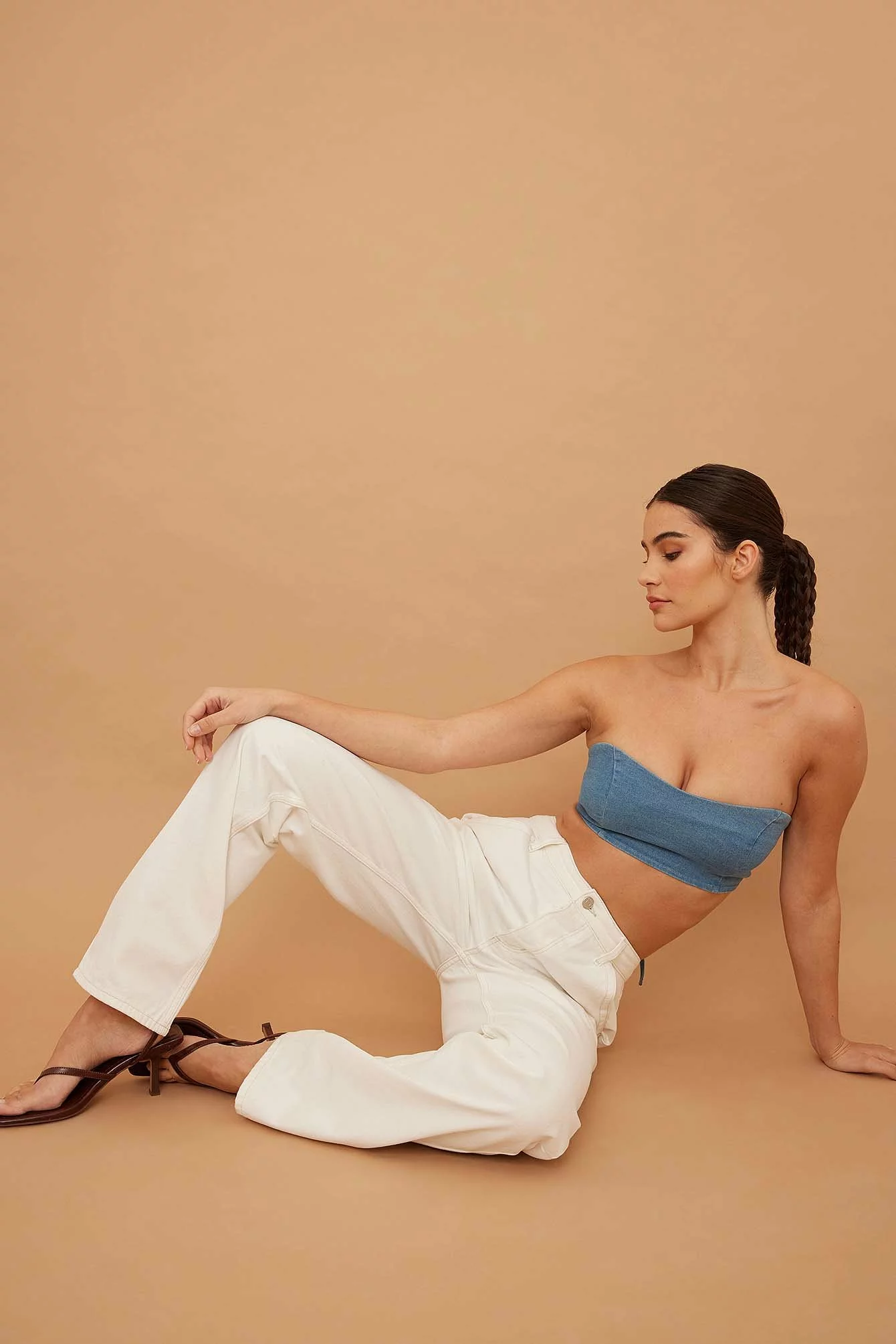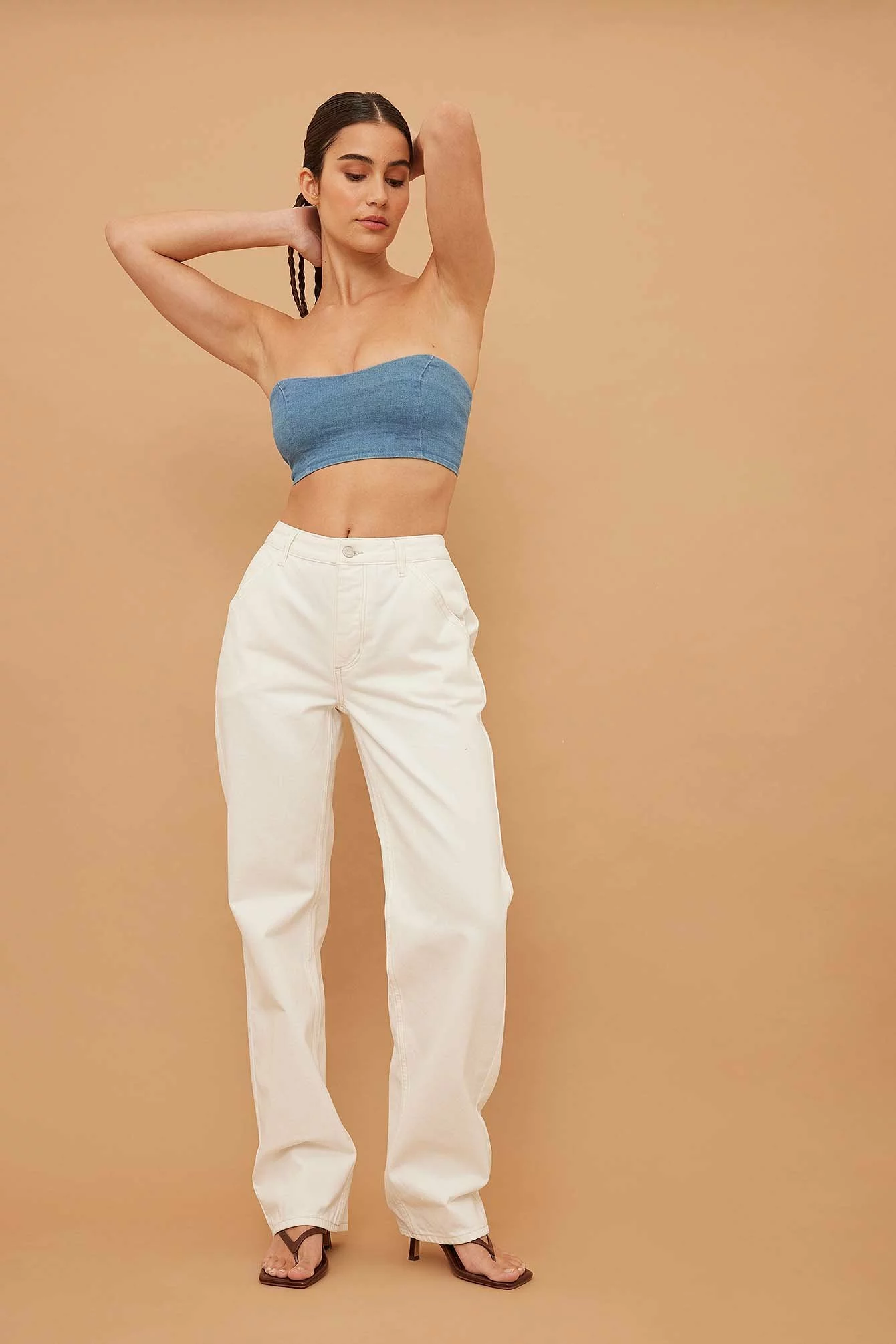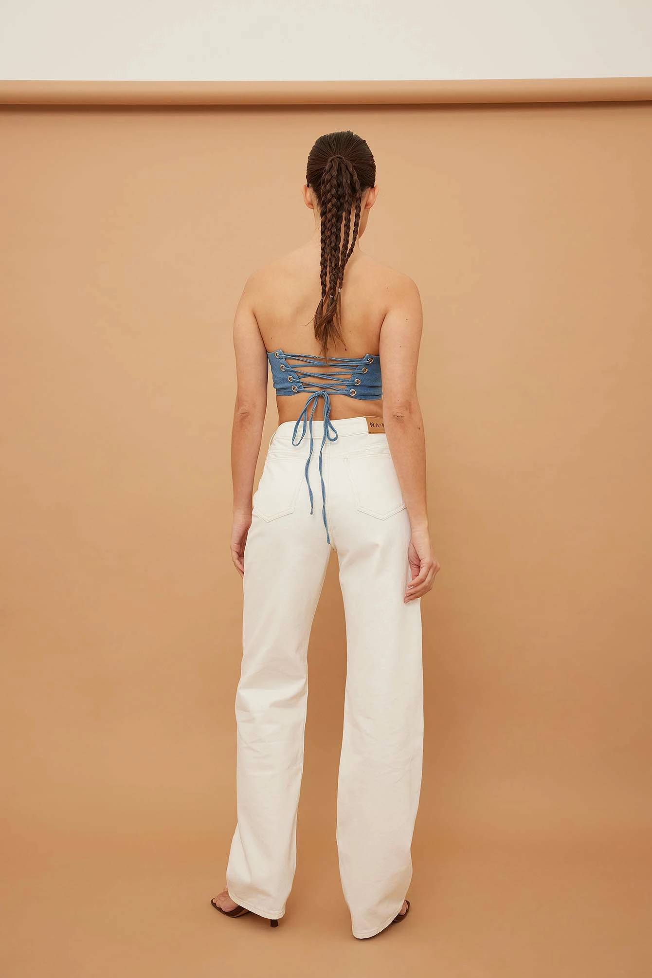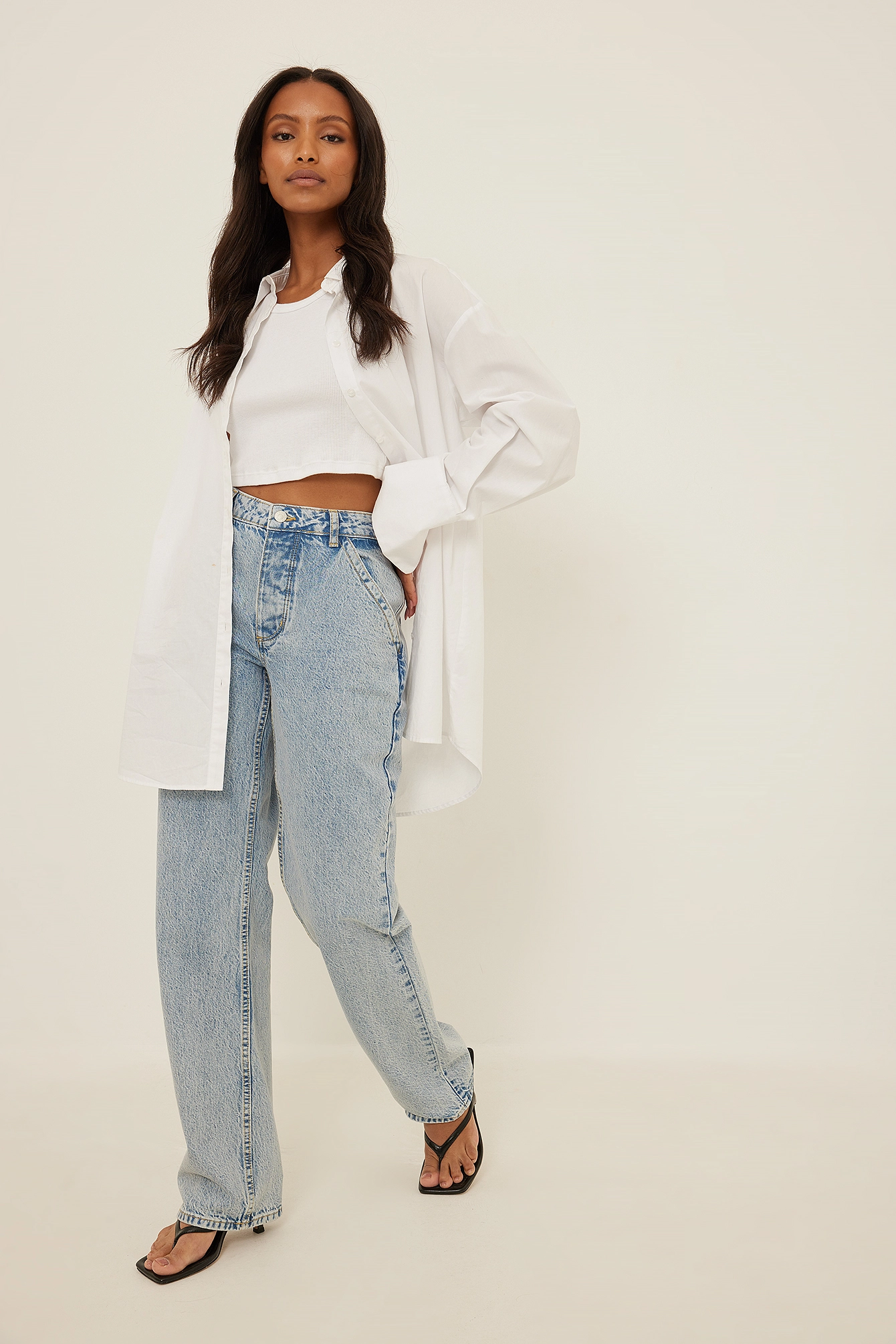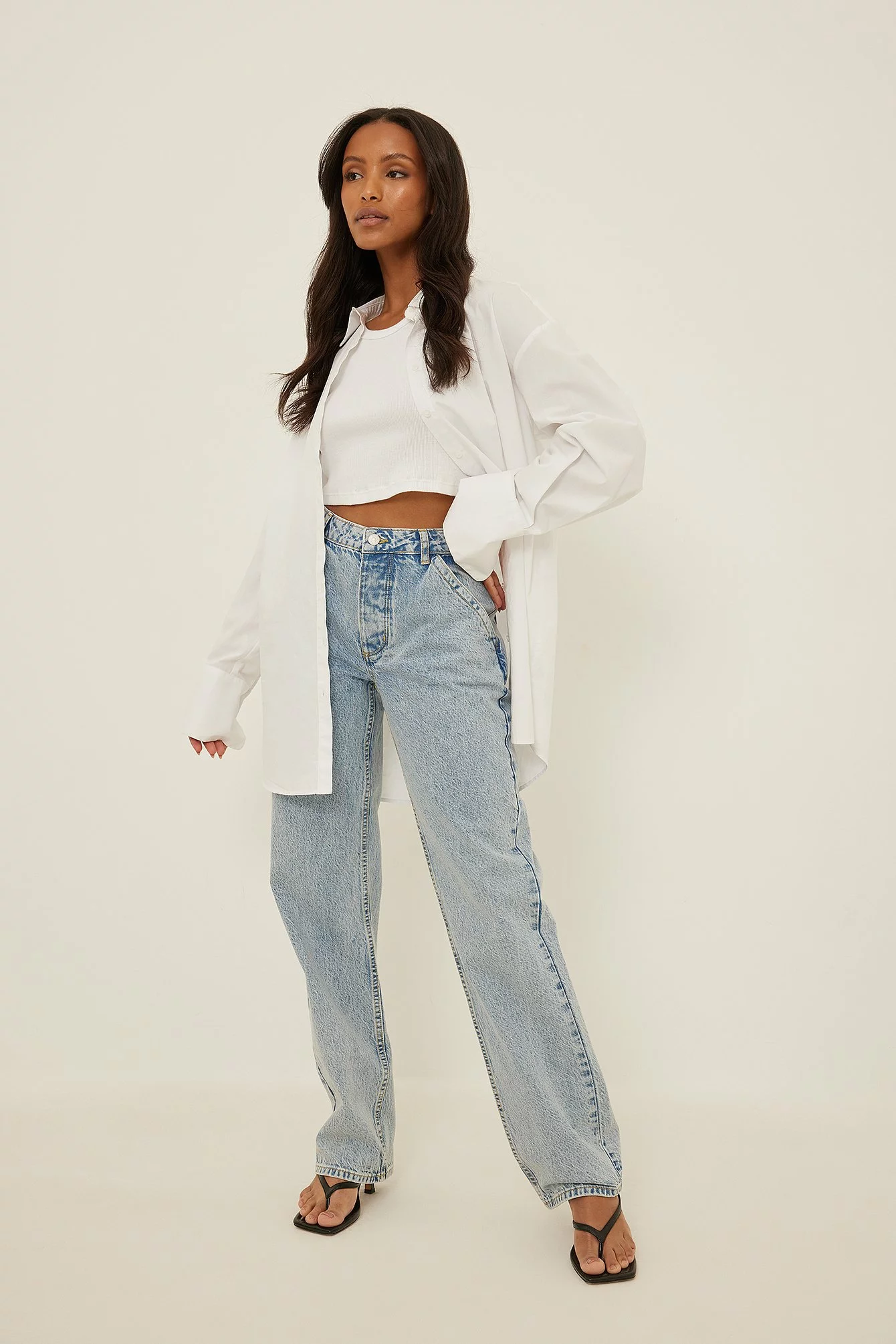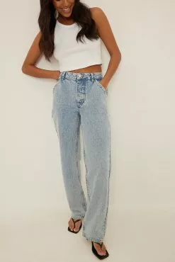 These jeans feature a high waist with a belt loop and button closure, side slanting pockets, back pockets and a straight fit.