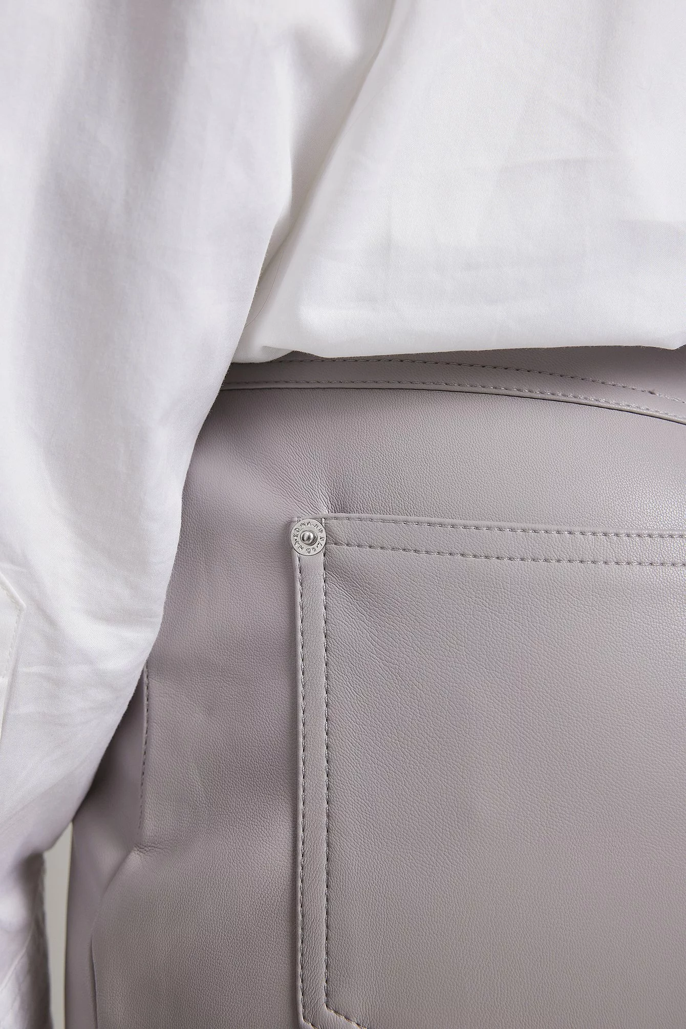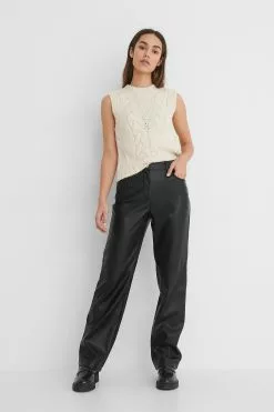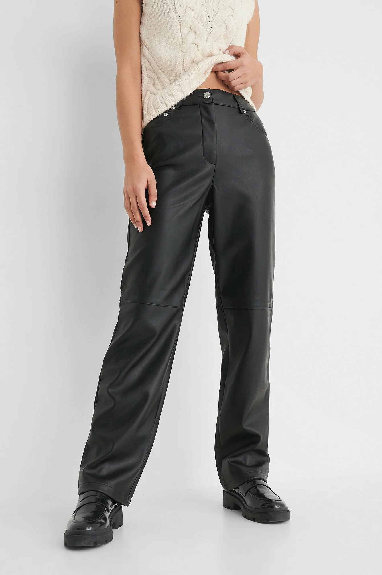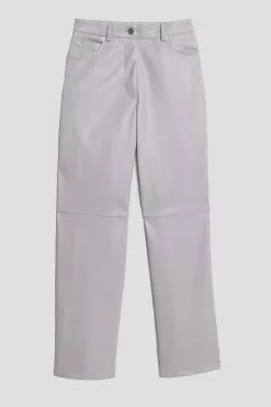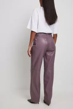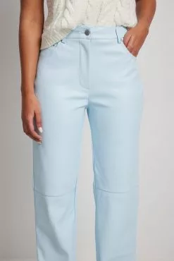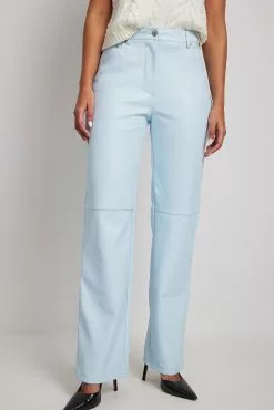 These pants feature a PU design. They have a high waist with a zipper and button closure and a five-pocket design. These pants feature belt loops, straight legs with seam details on the front and a soft inside.